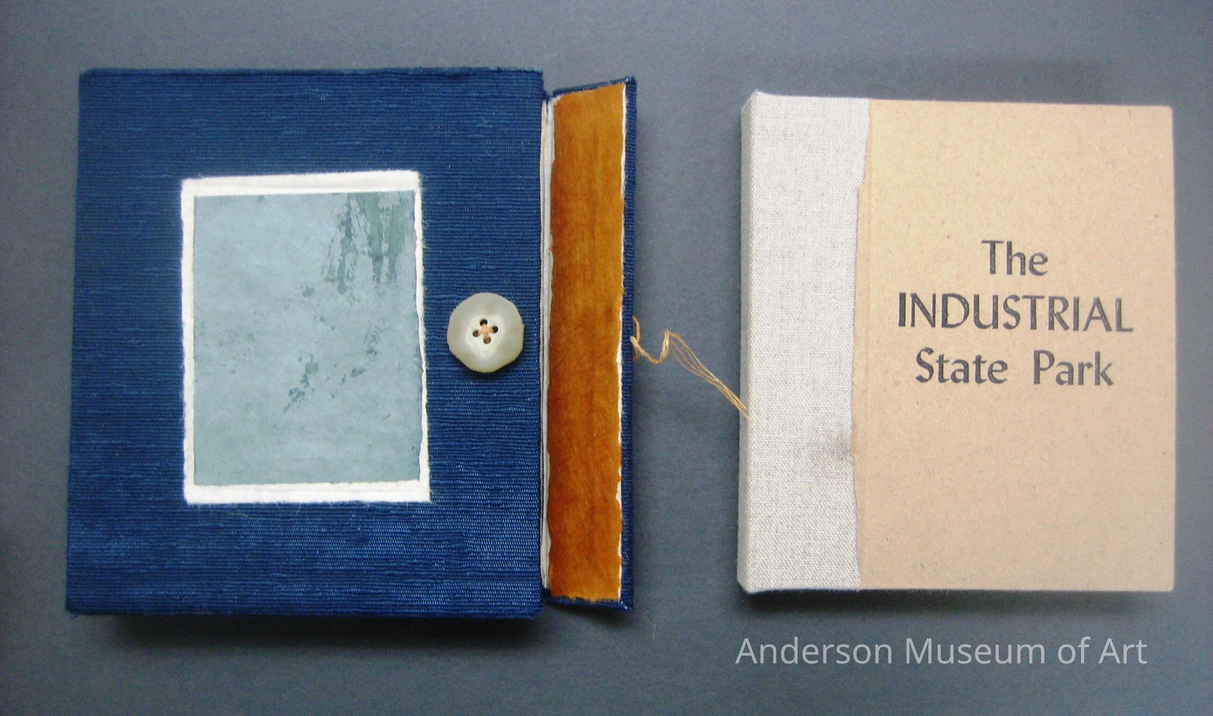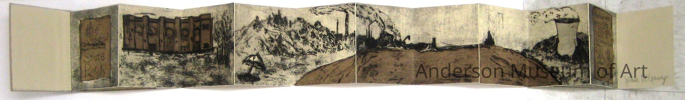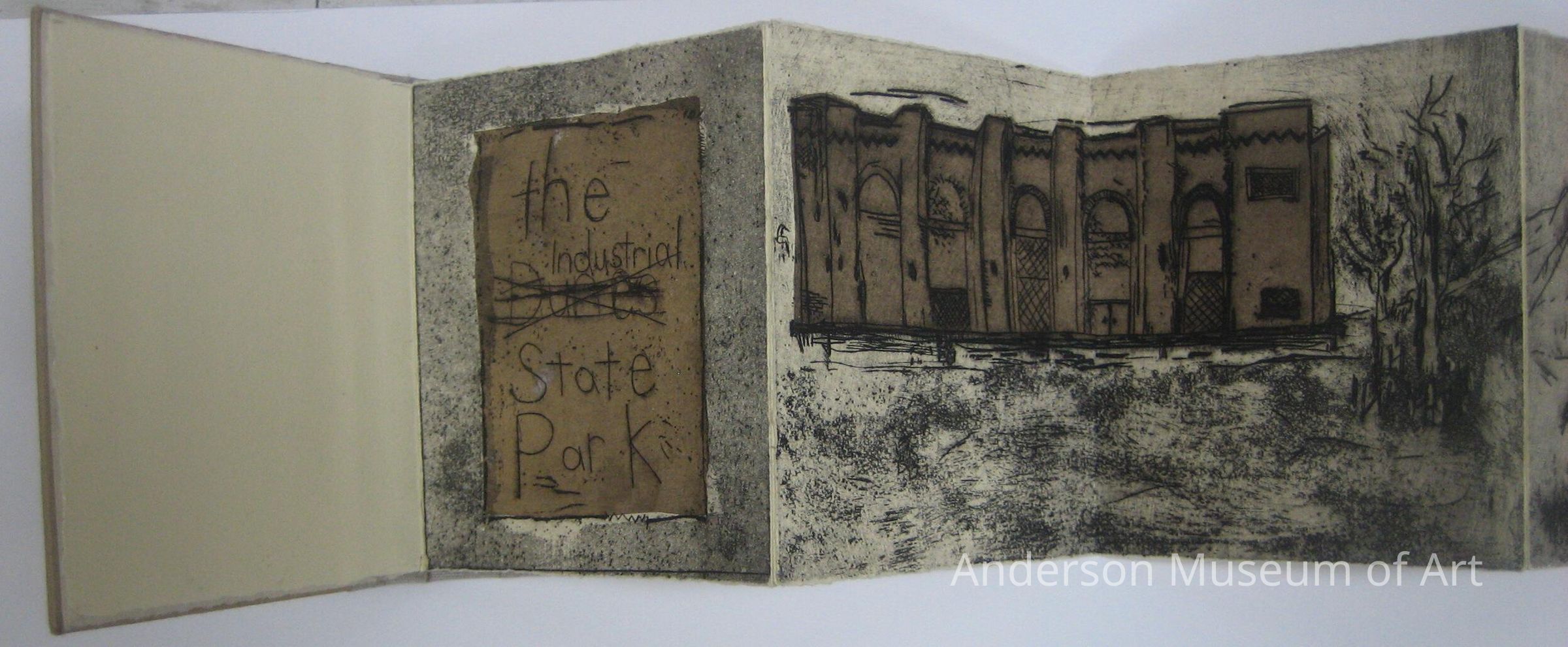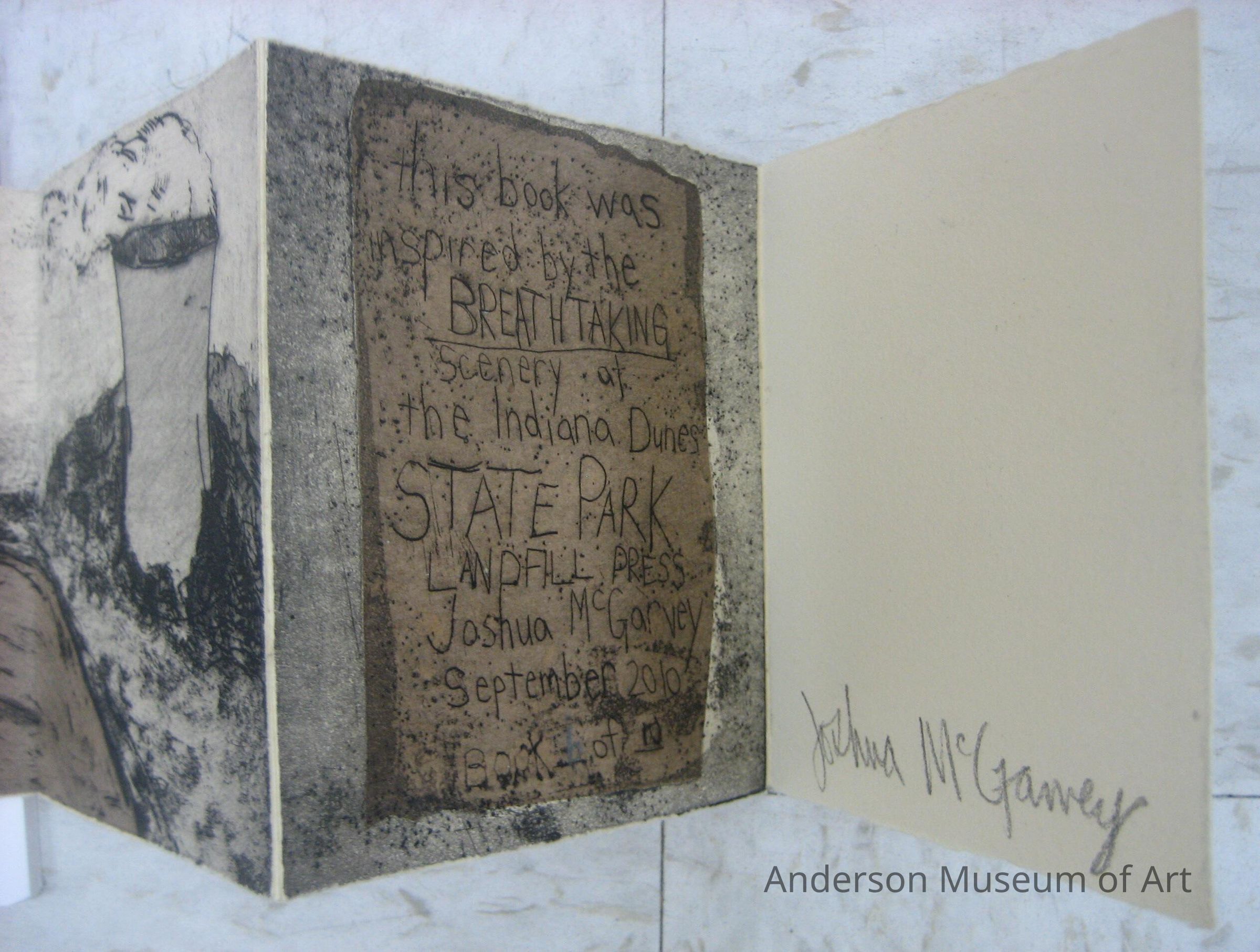 The piece is a handbound intaglio book and a handmade box. The book's front cover is brown with the title printed "The INDUSTRIAL State Park." The spine is covered in a grey canvas. The pages are connected only to the front cover, and the pages can be opened in an accordion-style so that the entire contents of the book pages can be viewed as a single long image. The book can also be viewed traditionally. 11 individual pages are creating the entire work. The color palette includes black, greys, and brown. It depicts an industrial building in the landscape of the Indiana Dunes State Park. A brown beach opens up toward the right of the image and ends with a large smokestack billowing smoke. The 2nd to the last page includes a written section by the artist stating, "the BREATHTAKING scenery inspired this book at the Indiana Dunes STATE PARK LANDFILL PRESS Joshua McGarvey September 2010 Book 6 of 10", and the last page has the artist's signature along the bottom edge of the page. The box is covered in a blue canvas material and opens along the length of the right side. An orange string wraps around a button fixed to the front of the box to secure the box shut. On the front center of the box, there is a rectangular light blue image on handmade paper. The paper is bordered by white handmade paper.Collection