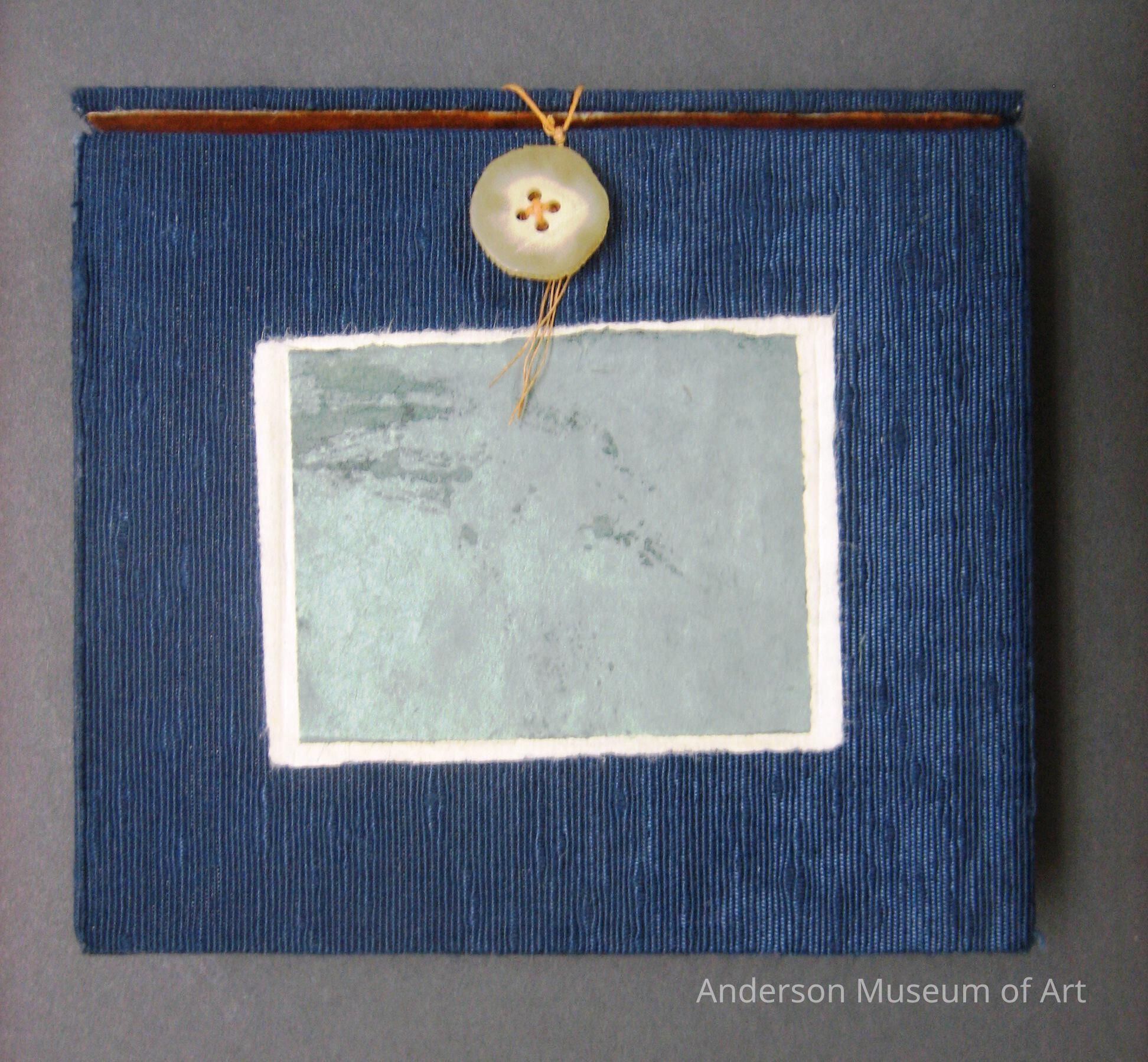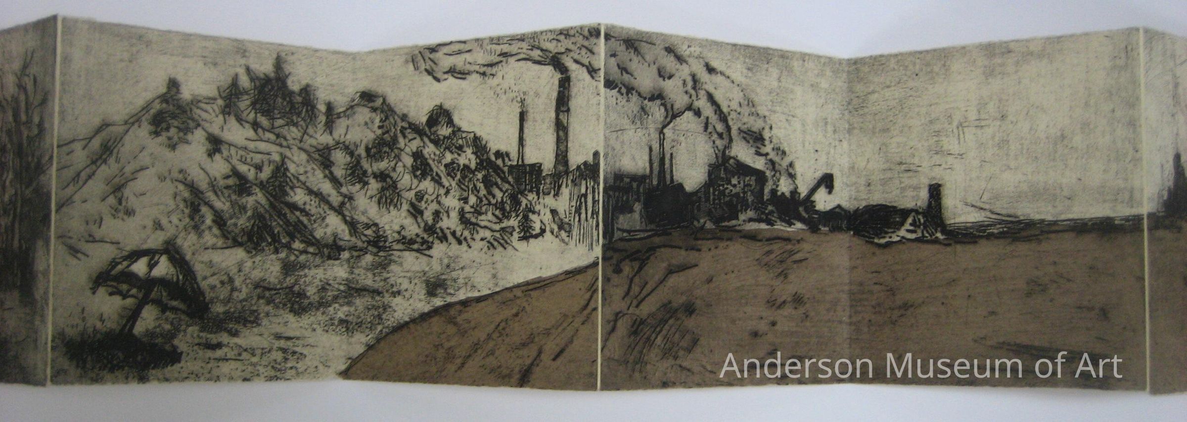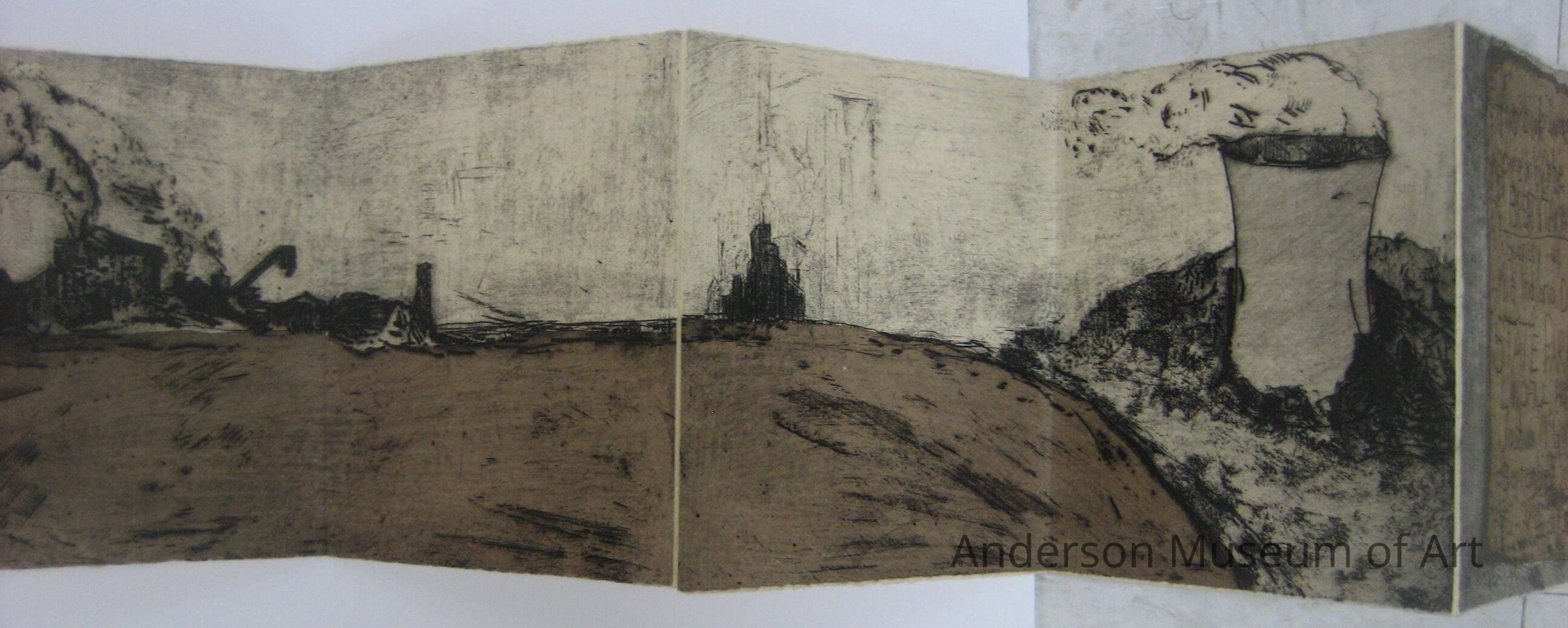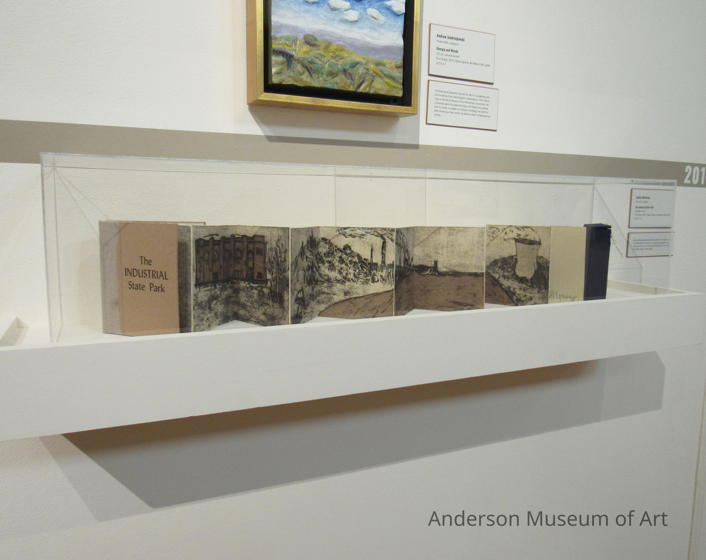 The piece is a handbound intaglio book and a handmade box. The book's front cover is brown with the title printed "The INDUSTRIAL State Park." The spine is covered in a grey canvas. The pages are connected only to the front cover, and the pages can be opened in an accordion-style so that the entire contents of the book pages can be viewed as a single long image. The book can also be viewed traditionally. 11 individual pages are creating the entire work. The color palette includes black, greys, and brown. It depicts an industrial building in the landscape of the Indiana Dunes State Park. A brown beach opens up toward the right of the image and ends with a large smokestack billowing smoke. The 2nd to the last page includes a written section by the artist stating, "the BREATHTAKING scenery inspired this book at the Indiana Dunes STATE PARK LANDFILL PRESS Joshua McGarvey September 2010 Book 6 of 10", and the last page has the artist's signature along the bottom edge of the page. The box is covered in a blue canvas material and opens along the length of the right side. An orange string wraps around a button fixed to the front of the box to secure the box shut. On the front center of the box, there is a rectangular light blue image on handmade paper. The paper is bordered by white handmade paper.Collection