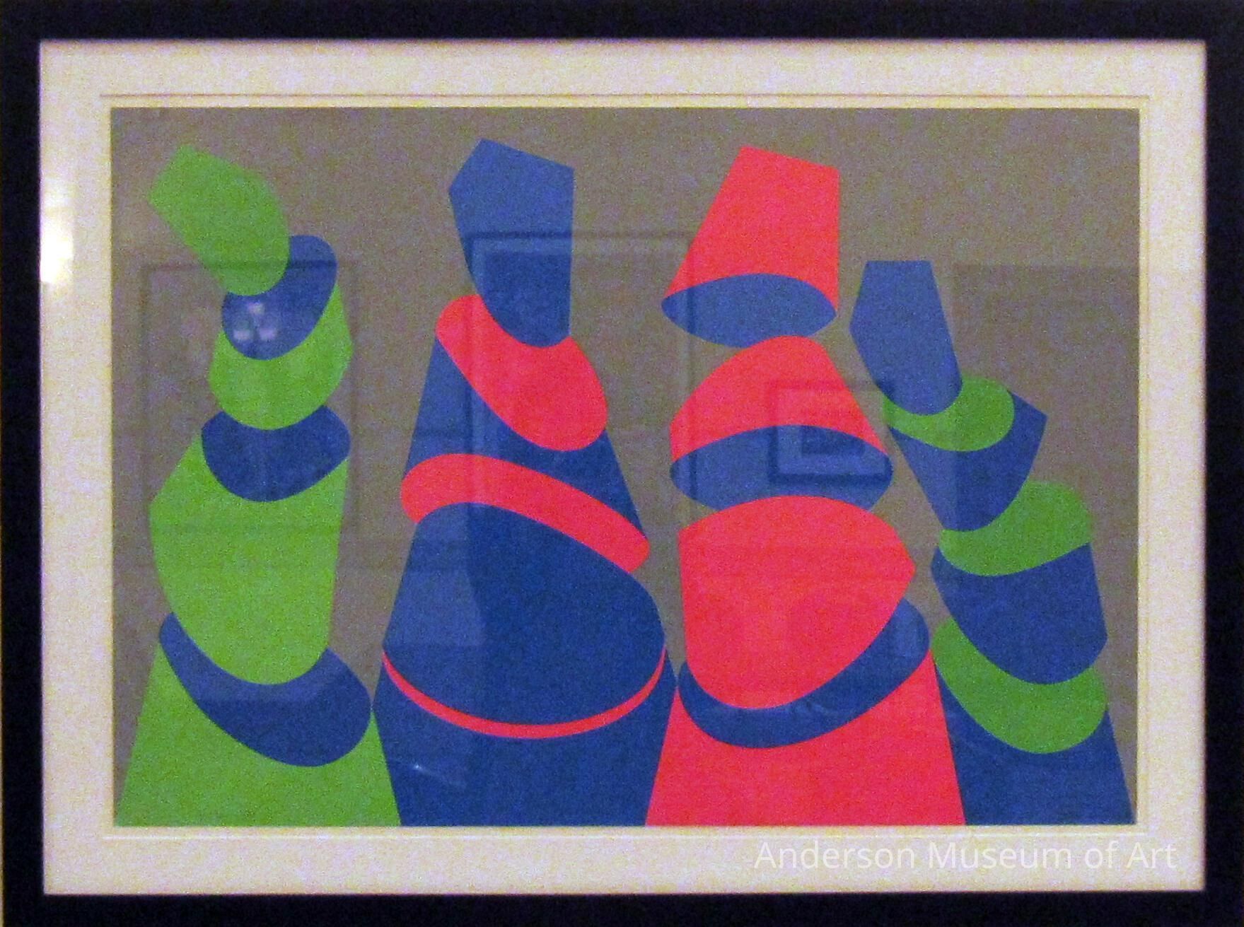 Four neon stacked cones on a green/grey background. The far left cone has an neon green outside with blue inside, which can be seen at each cut. Going right, the next has blue outside and neon orange inside. Next, neon orange outside, blue inside, and the last blue outside and neon green inside. Print 40/70.Collection