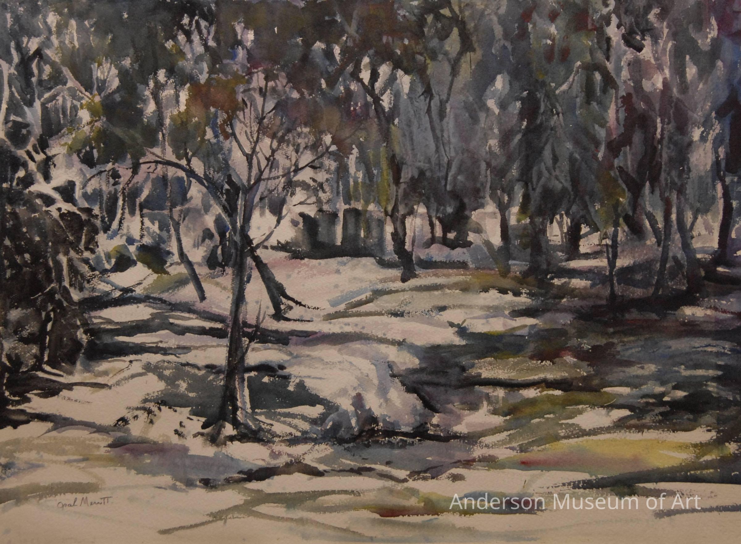 Image that is a somewhat abstracted and impressionistic landscape in primarily dark tones of blue, black and green. Image made up of snowy ground in foreground with late summer to early fall foliage overhead and extending into the background. Slightly above the center is an unclear image suggestive of an architectural structure which appears to have two large, dark rectangular openings and at least one large, white column separating the openings. The background on the right side is painted in burgundy tones. The background to the left is primarily in blacks. Signed "Opal Merritt" in the lower left corner.