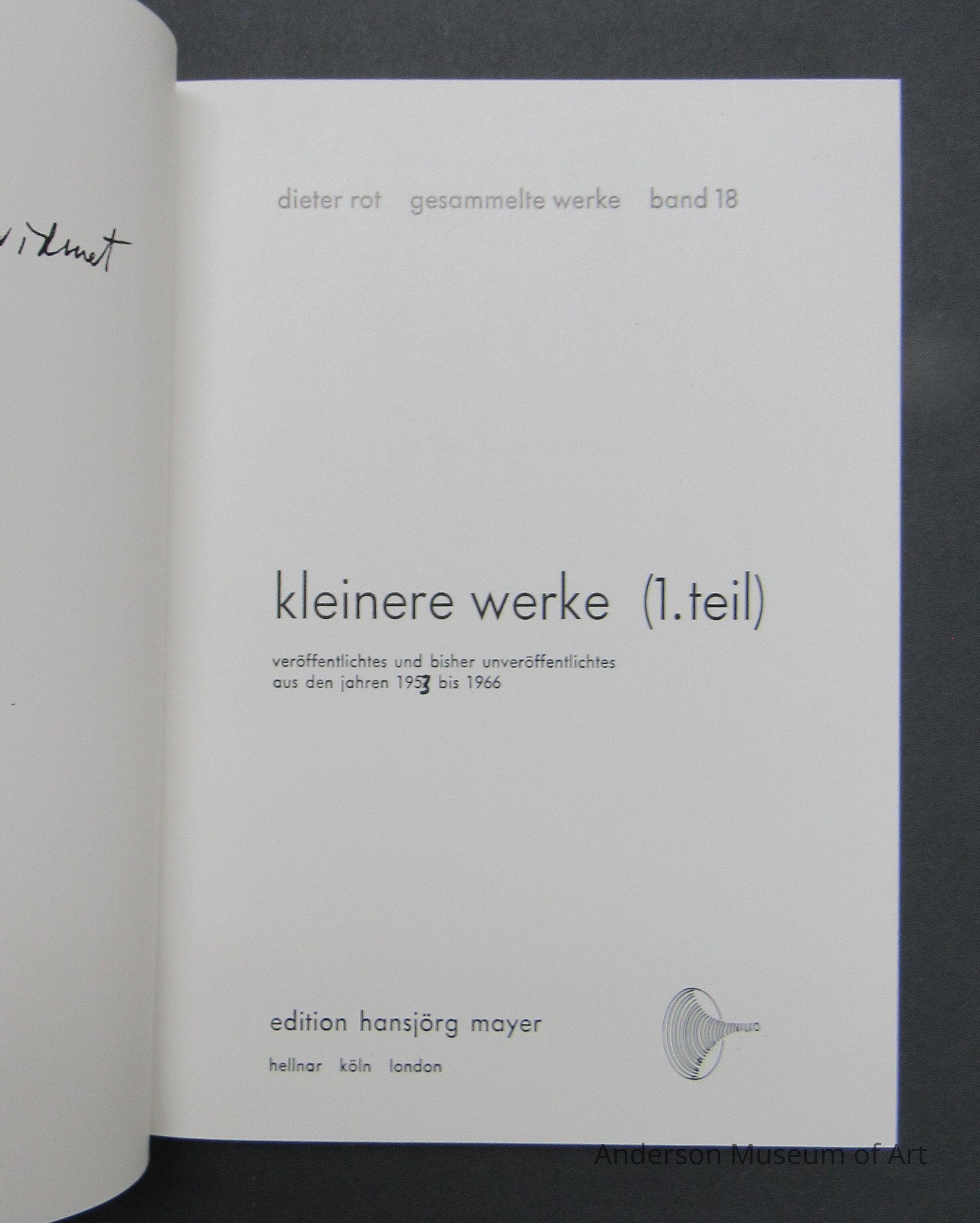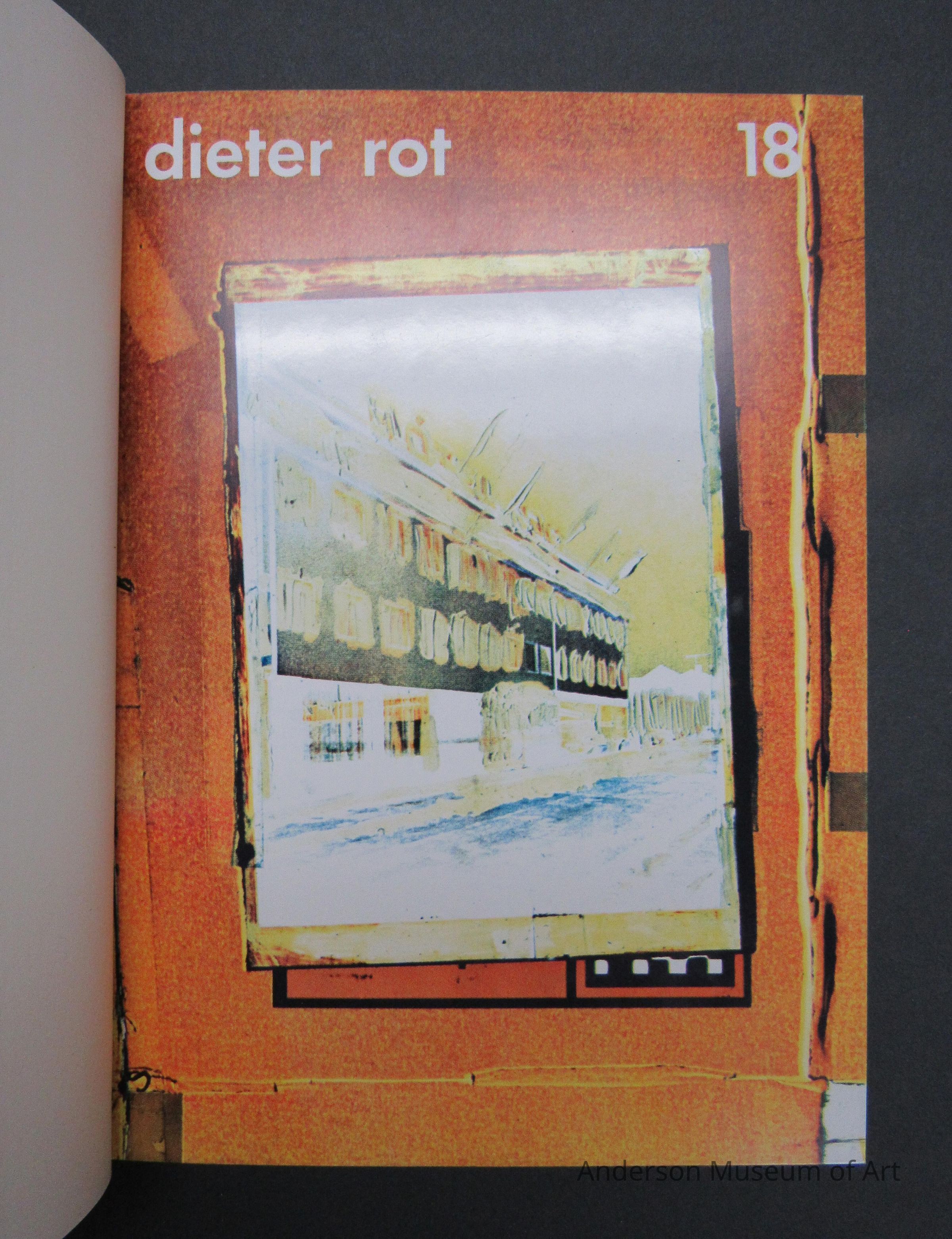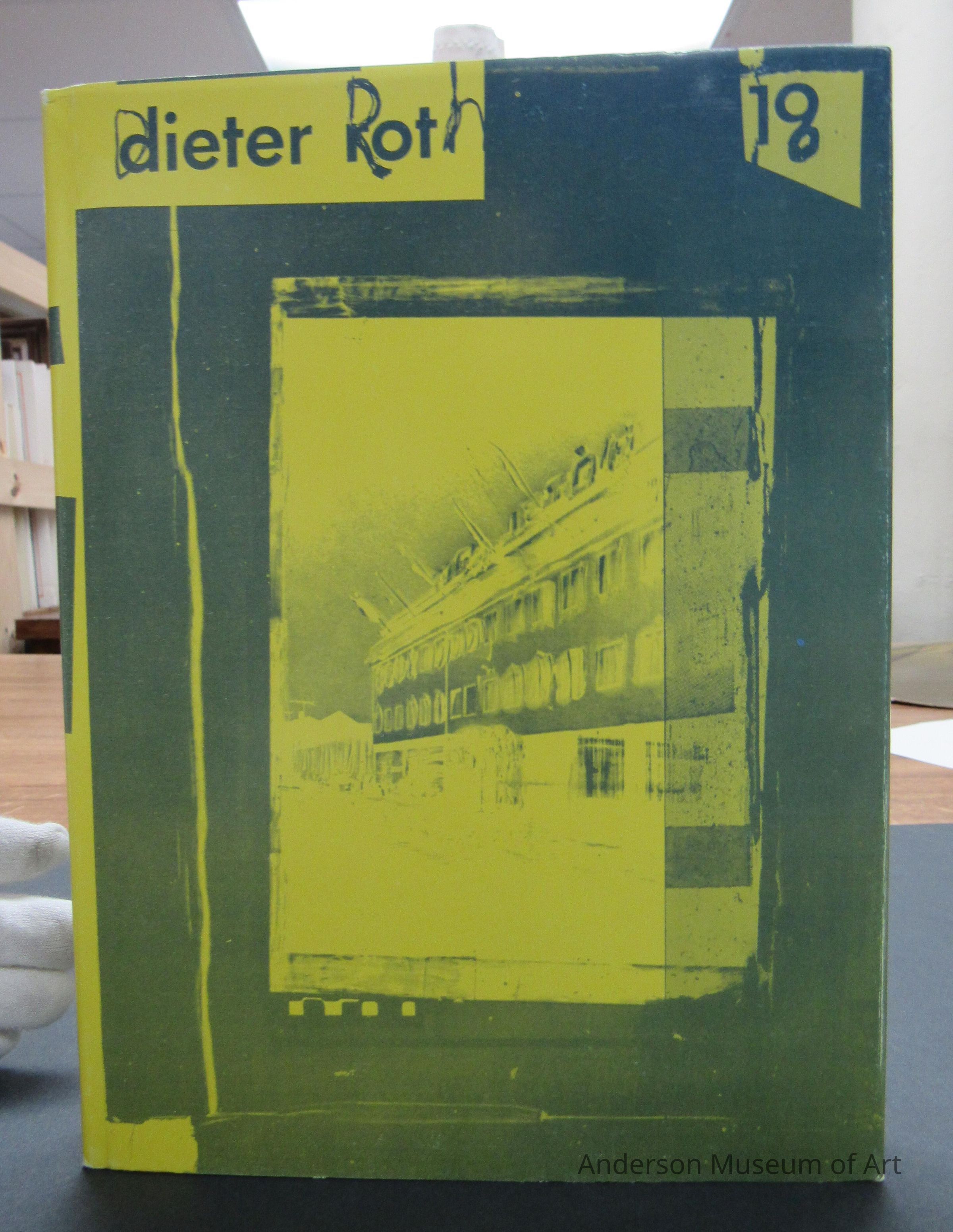 "Dieter Rot gesammelte werke band 18 / kleinere werke (1.teil) / veroffentlichtes und busher unveroffentilchtes / aud den jahren 1953 bis 1966" Book with green and yellow cover in a green slipcase. There is a green and yellow image of a building on the front, back, and inside sleeves. The same image in a yellow and orange is on the first pages and again in the back in blue. There is an "Original Speedy Self / Smaller Work by Dieter Roth" included. This drawing is of a face drawn in green and covered with a bright orange. It is signed and dates '80. Back jacket sleeve "special edition of 200 copies with an original drawing by the author for eaton house publishers ltd." Edition Hansjorg Mayer. Copyright 1971.Collection