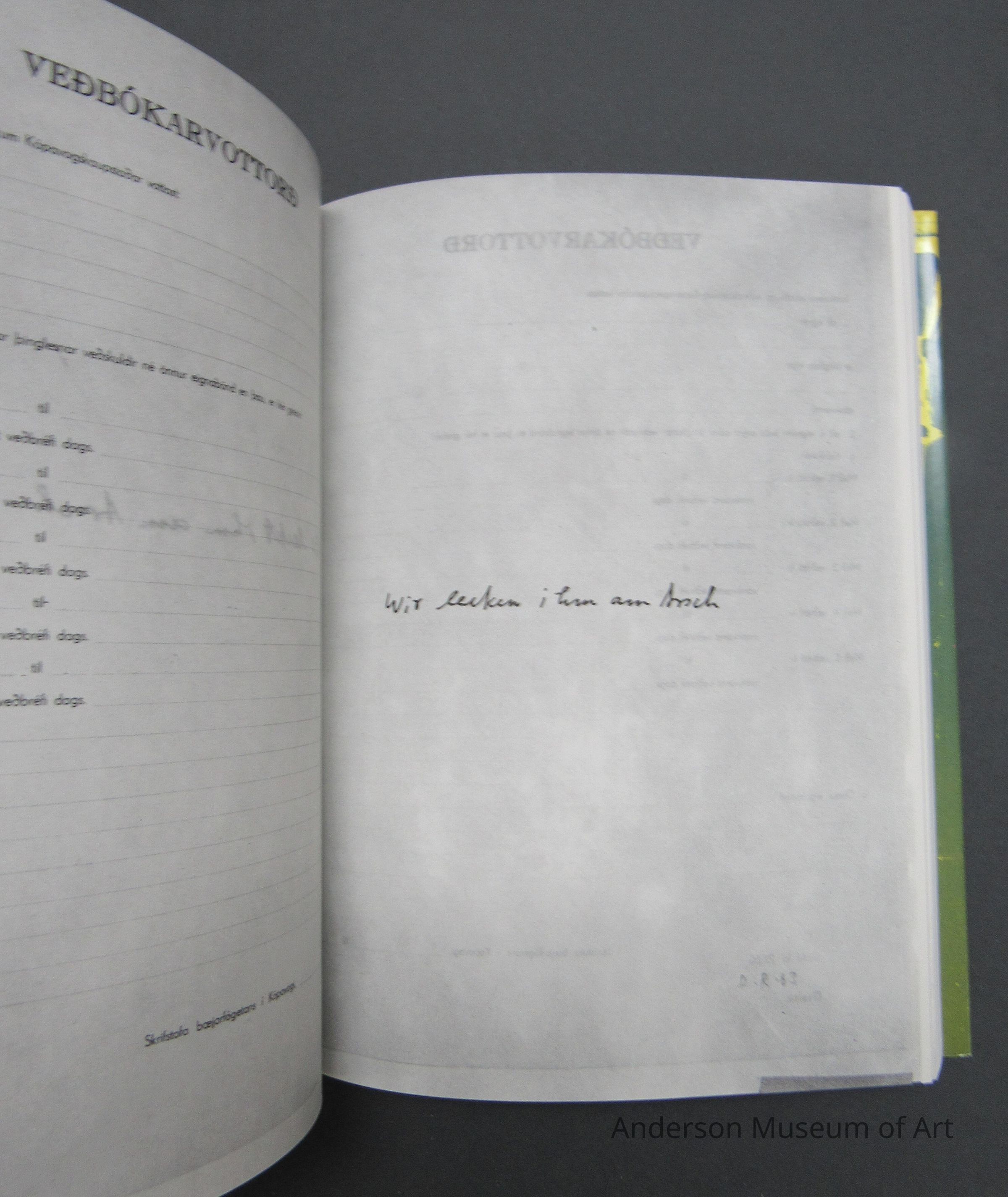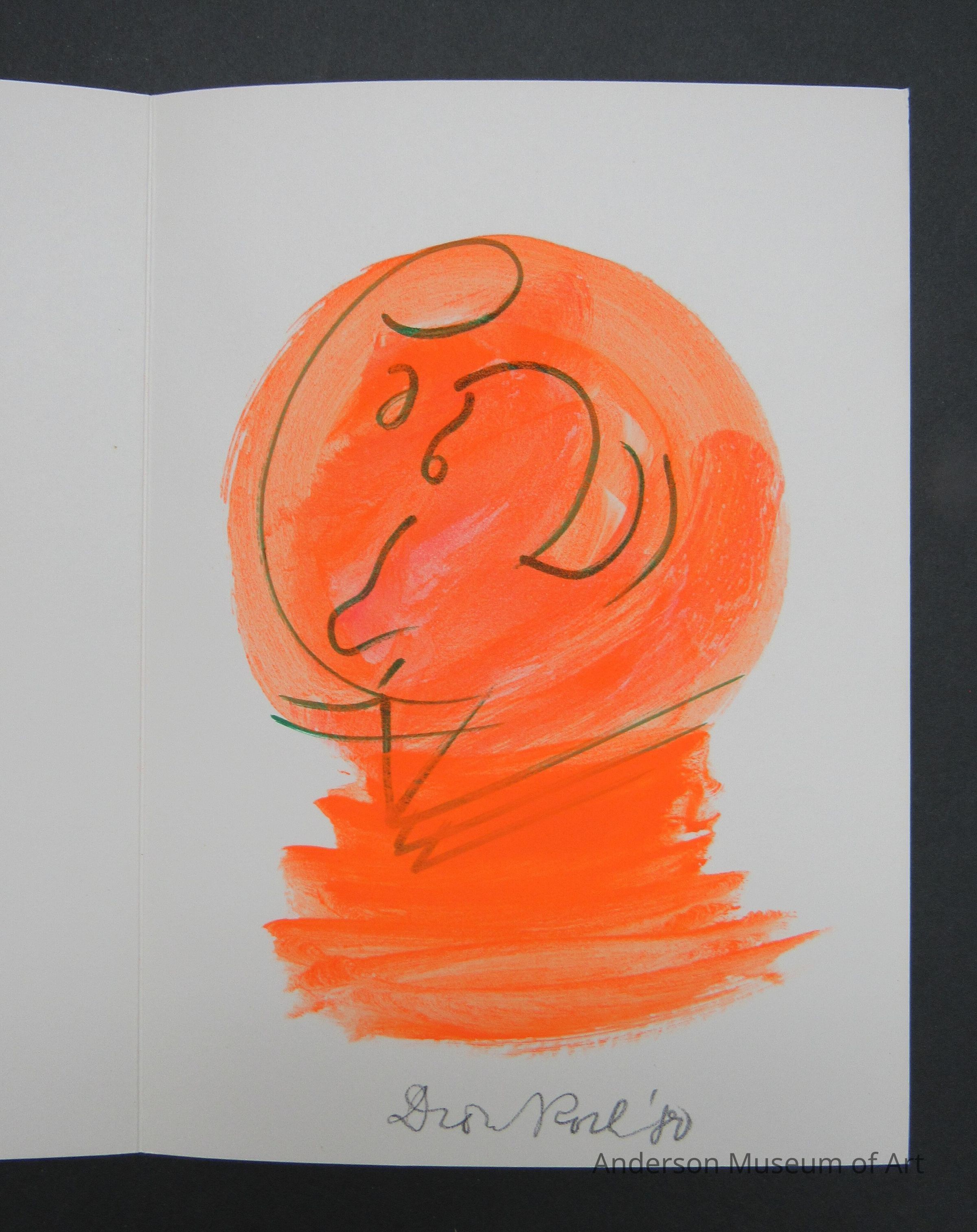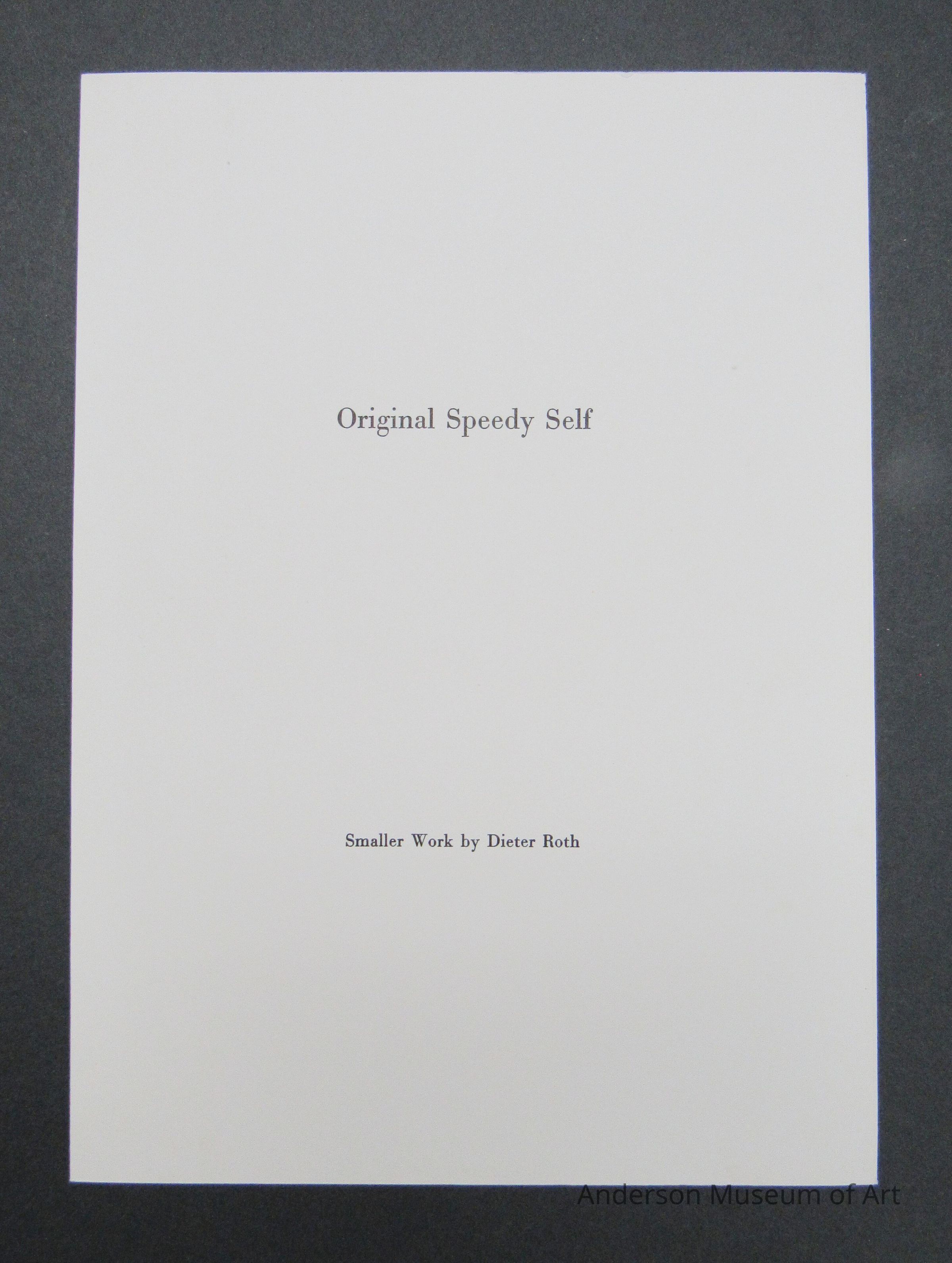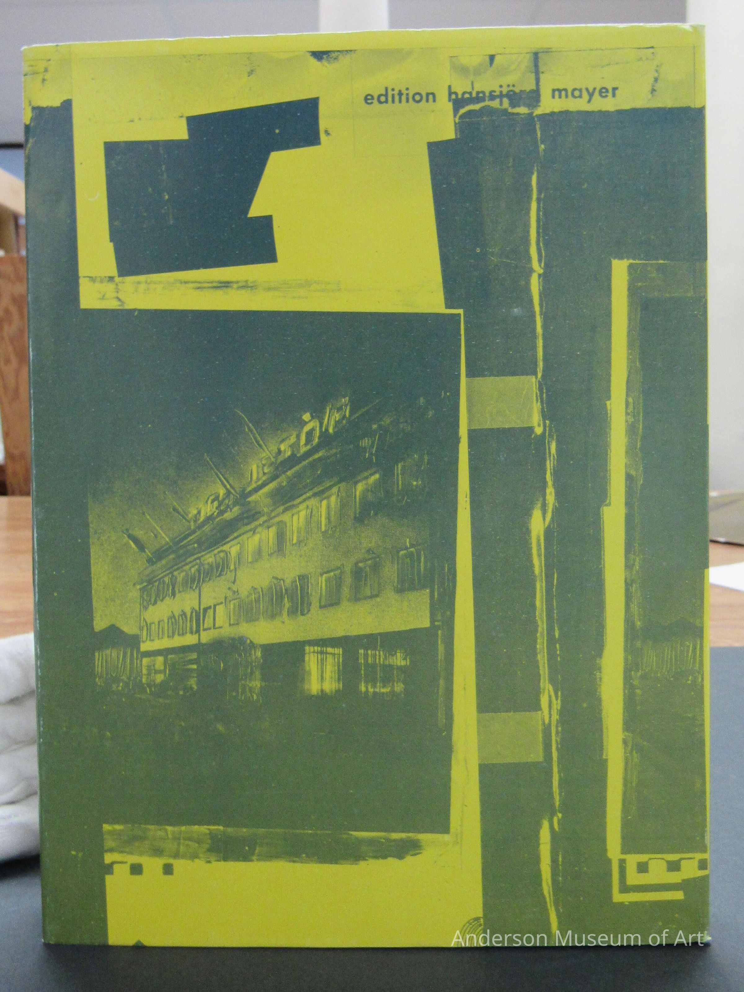 "Dieter Rot gesammelte werke band 18 / kleinere werke (1.teil) / veroffentlichtes und busher unveroffentilchtes / aud den jahren 1953 bis 1966" Book with green and yellow cover in a green slipcase. There is a green and yellow image of a building on the front, back, and inside sleeves. The same image in a yellow and orange is on the first pages and again in the back in blue. There is an "Original Speedy Self / Smaller Work by Dieter Roth" included. This drawing is of a face drawn in green and covered with a bright orange. It is signed and dates '80. Back jacket sleeve "special edition of 200 copies with an original drawing by the author for eaton house publishers ltd." Edition Hansjorg Mayer. Copyright 1971.Collection
