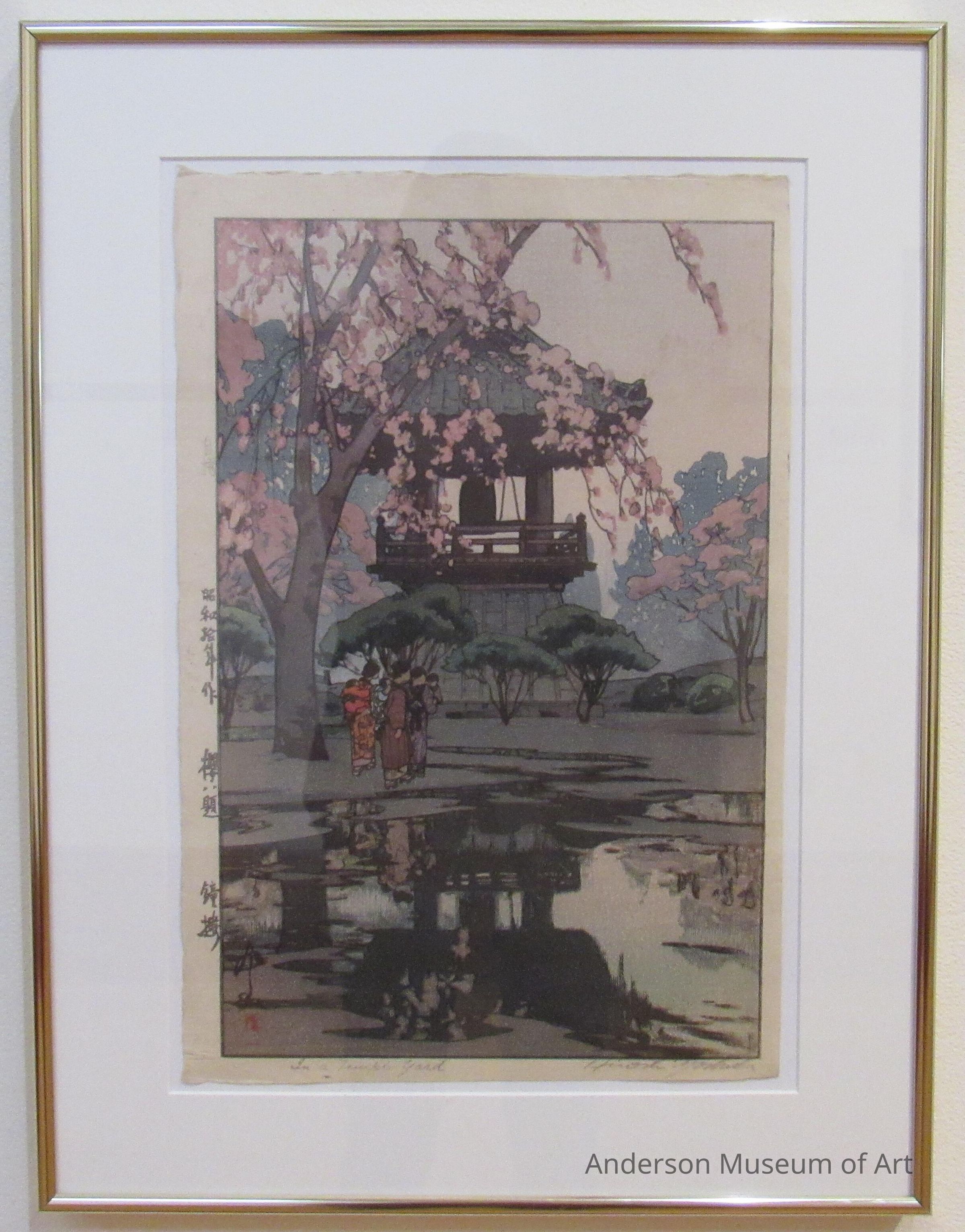 Outdoor scene of a temple yard. There is a temple in the center background. There are several trees and some cherry blossoms surrounding the building. There is one large cherry blossom in the left foreground. Below the tree are three women each with a baby walking toward the temple. In the bottom foreground is water. The print is signed traditionally on the left edge as well as a more modern signing in pencil along the bottom right corner. "1935" is written in pencil next to the signature on the left. This print is from a series called 8 Scenes of Cherry Blossoms.