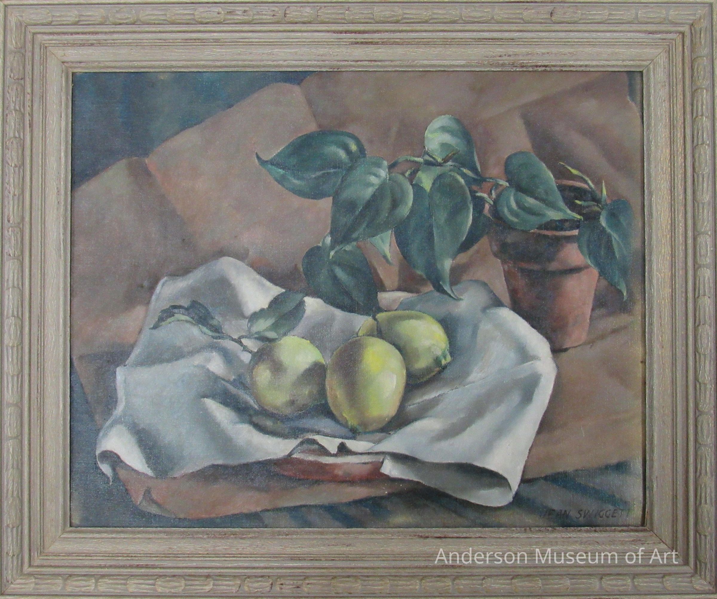 Still life of lemons in a bowl and a dark green, potted, plant. There are three yellow lemons, one still with leaves sitting in a red bowl. Between the lemons and the bowl is a fairly large white cloth. To the right is a terra cotta ceramic planted with a dark, heart-shaped leaf plant. It extends to the left toward the lemons. All of this is on brown paper. Creases can be seen in the paper. Behind all of this is a blue and grey striped cloth. There are hints of gold throughout the edge of the canvas. Signed in brown and all caps, JEAN SWIGGETT in bottom right corner.Type of Painting
