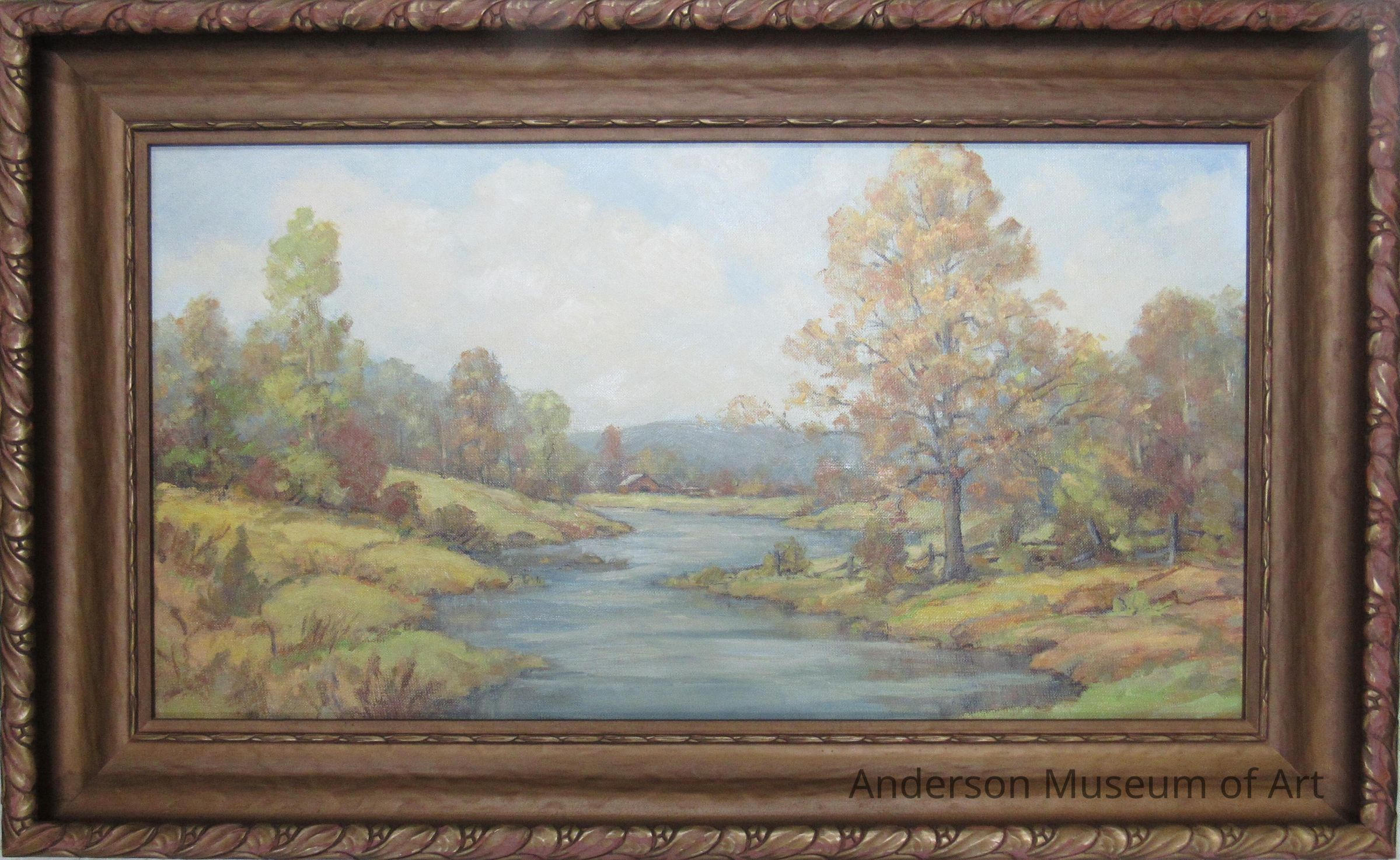 River landscape. Soft palette. There is a winding river going through the bottom center of the image to the horizon line. This leads your eye to a small red barn with a white roof. In the background is a large hill. To the right is a bank area containing trees and a fence. To the left is mostly an open grassy area with several sections of trees. Several of the trees have leaves changing for the fall. The sky is filled with clouds and it has a warm sunny day feel.
