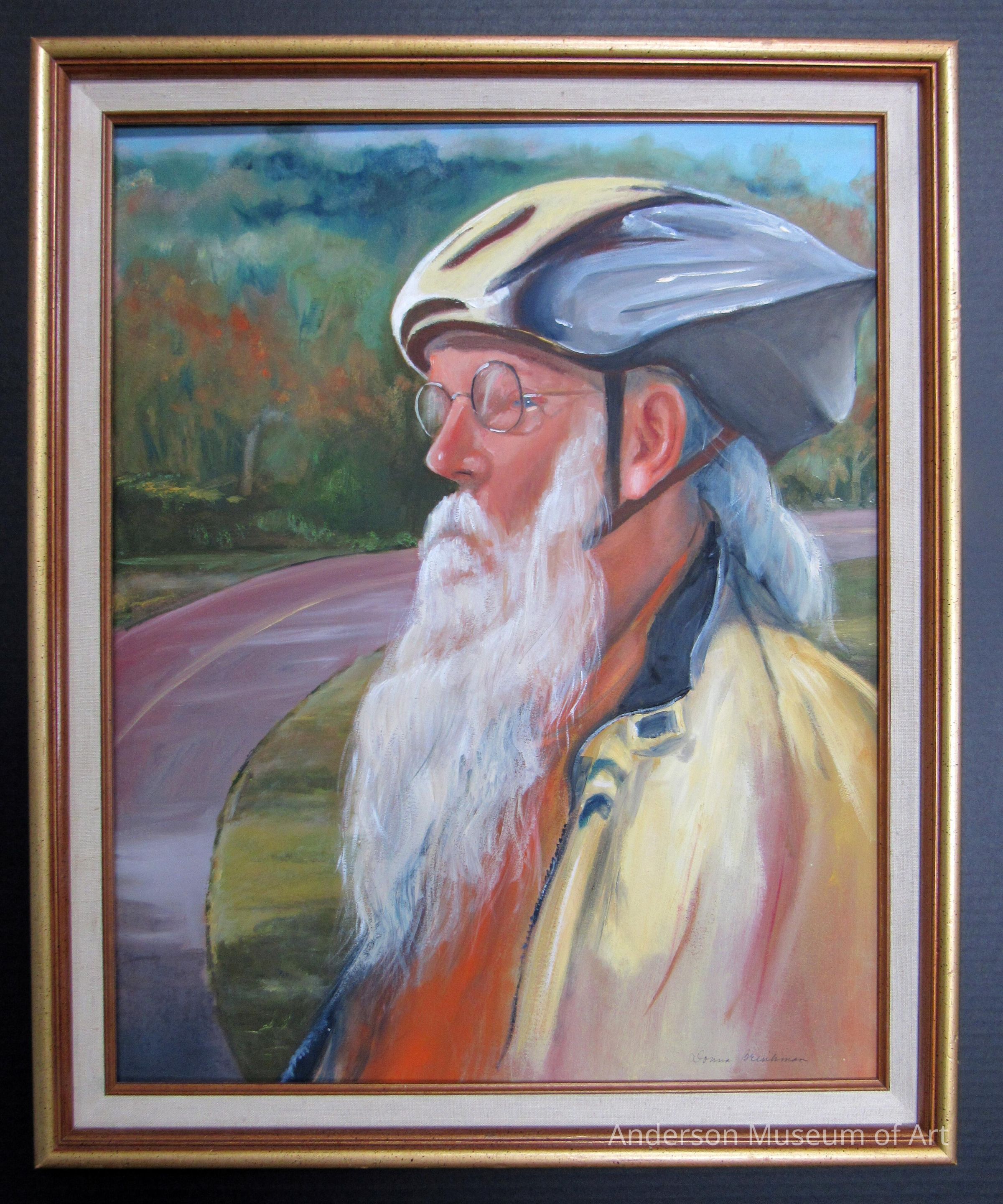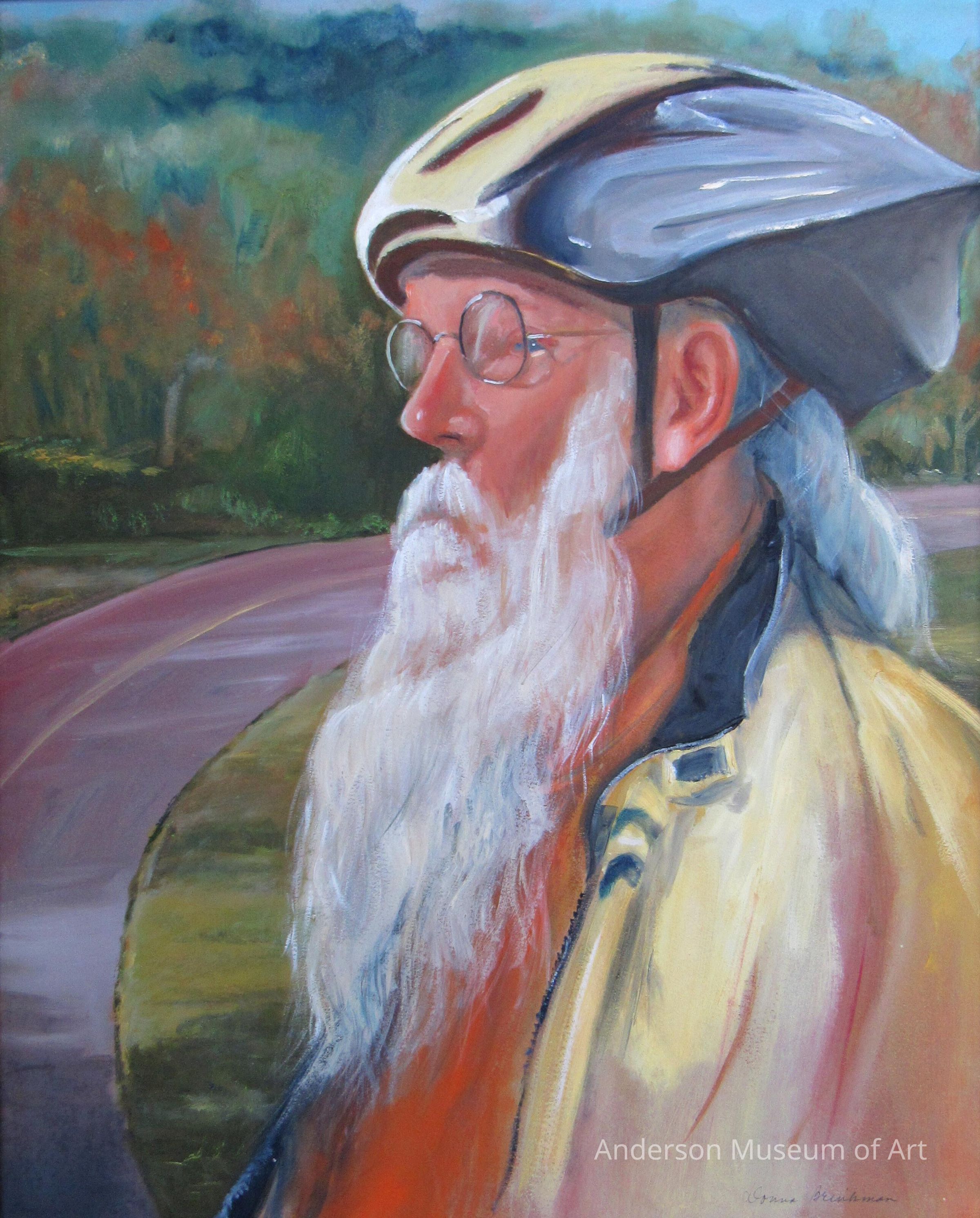 Painting of a white male in biking gear. He is facing left, giving us a side profile. He is wearing a yellow and grey helmet with a yellow jacket over an orange shirt. He is wearing glasses and has long white hair and a beard. Curving from the lower-left corner to midway on the right is a two-lane road. There is a heavy area of trees and a small sliver of blue sky seen in the background. Signed "Donna Brinkman" in the bottom right corner