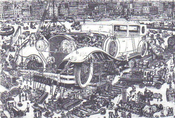 Intaglio (etching) in black ink on white vellum paper with no watermark. Image depicts a very large antique automobile being constructed by a number of lilliputian figures. The automobile is surrounded by a number of small size trucks, tractors and cranes, and by various automotive parts for the larger auto. A railroad track runs on a diagonal from the right edge to the bottom edge. A locomotive appears on this track at the right edge of this image. In the background is a very detailed city with a multitude of buildings and vehicles. Above is blank sky. The print is titled in pencil, "Gulliver's Packard" below the image to the left; it is numbered in pencil, "198/200" below the image center; and the print is signed, dated, and another mark appears after the date which is illegible, all in pencil, "B. McCombs (19) 78 **(?)" below the image to the right.