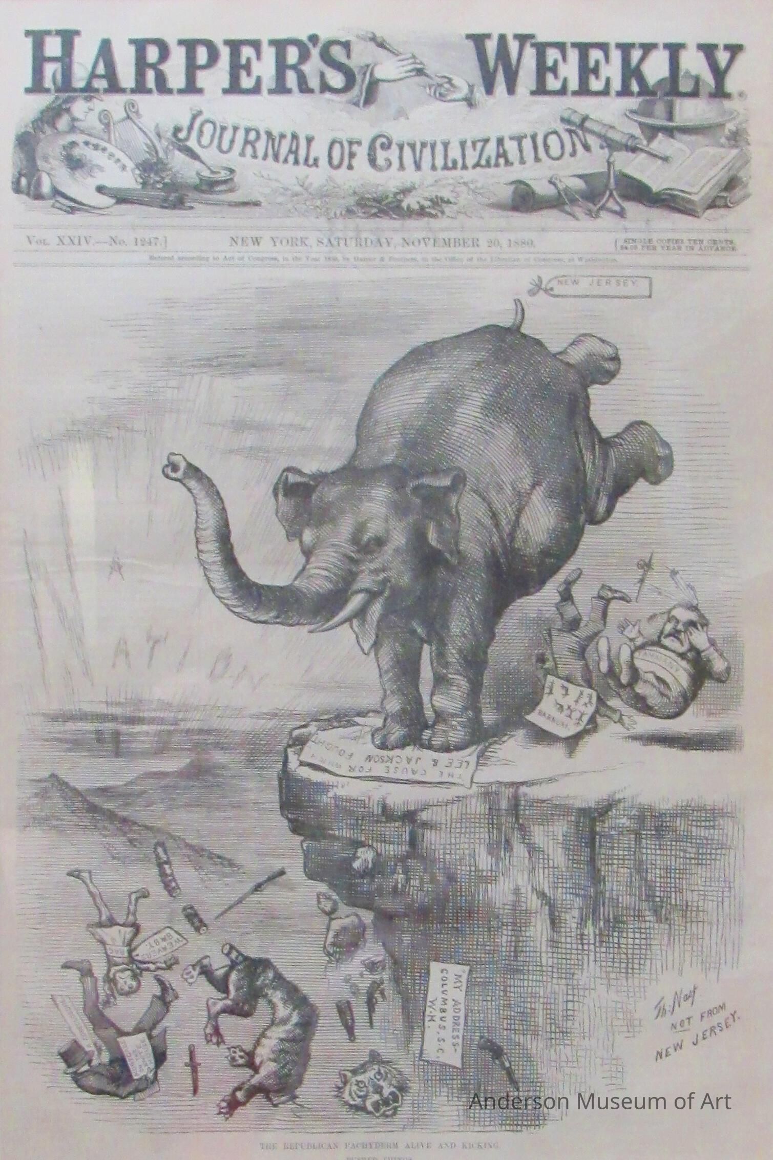 A slightly yellowed page from the November 20, 1880 edition of Harper's Weekly Journal of Civilization, Vol. XXIV, No. 1247. The image is that of a large elephant standing on the edge of a cliff, his weight supported on his front feet and his back feet raised into the air as if he is kicking. On the piece of paper beneath the elephant's front feet is printed, "The