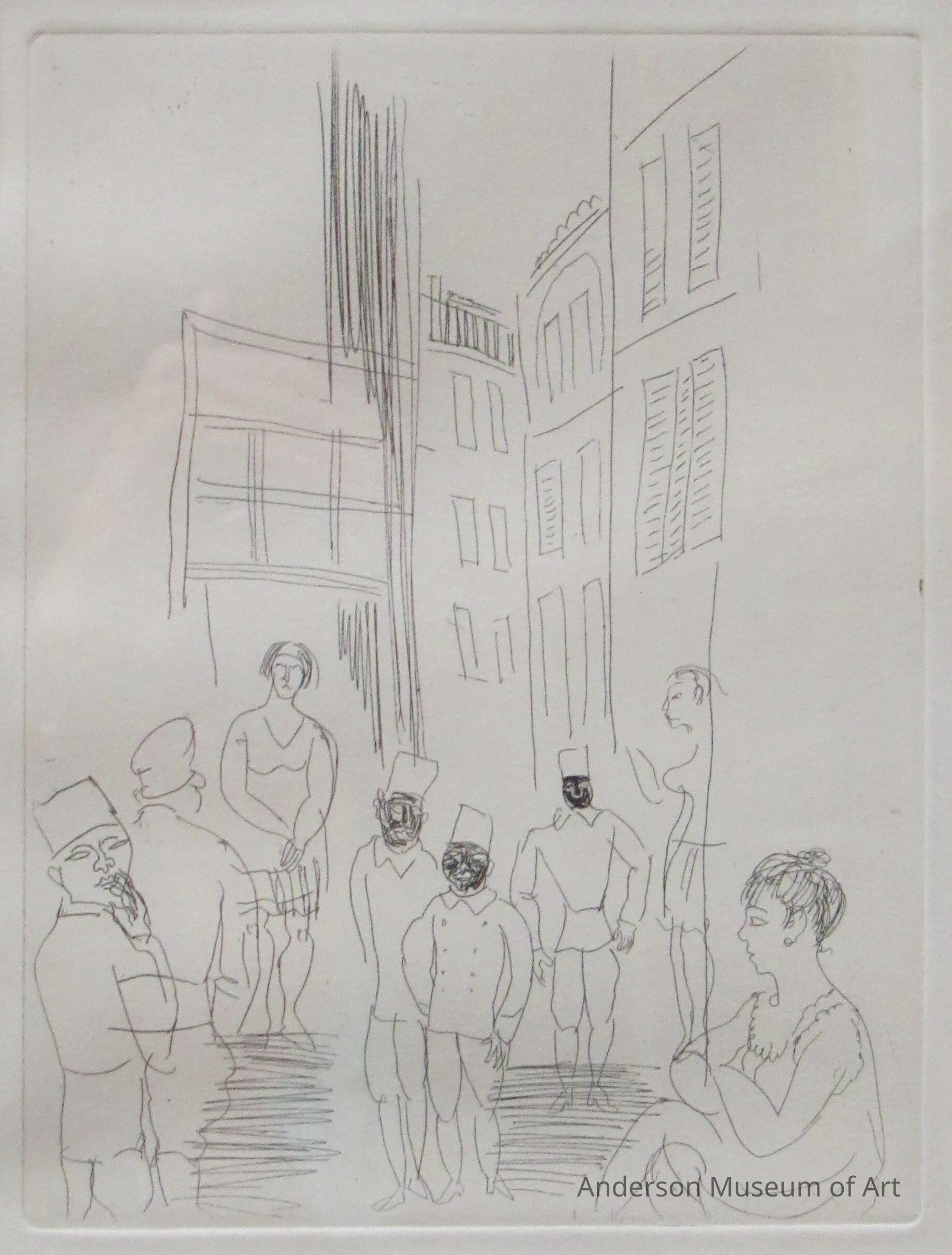 Illustration from the book "The Beautiful Child or the Love for Forty Years (La Belle-Enfant ou L’Amour À Quarante Ans)". This etching depicts a street scene. There are several three story buildings in the background. The main focus is on three men in the center with black faces and dressed in a collared uniform and tall square hat. They are surrounded by two men to the left and two women behind them and one woman to the right.Collection