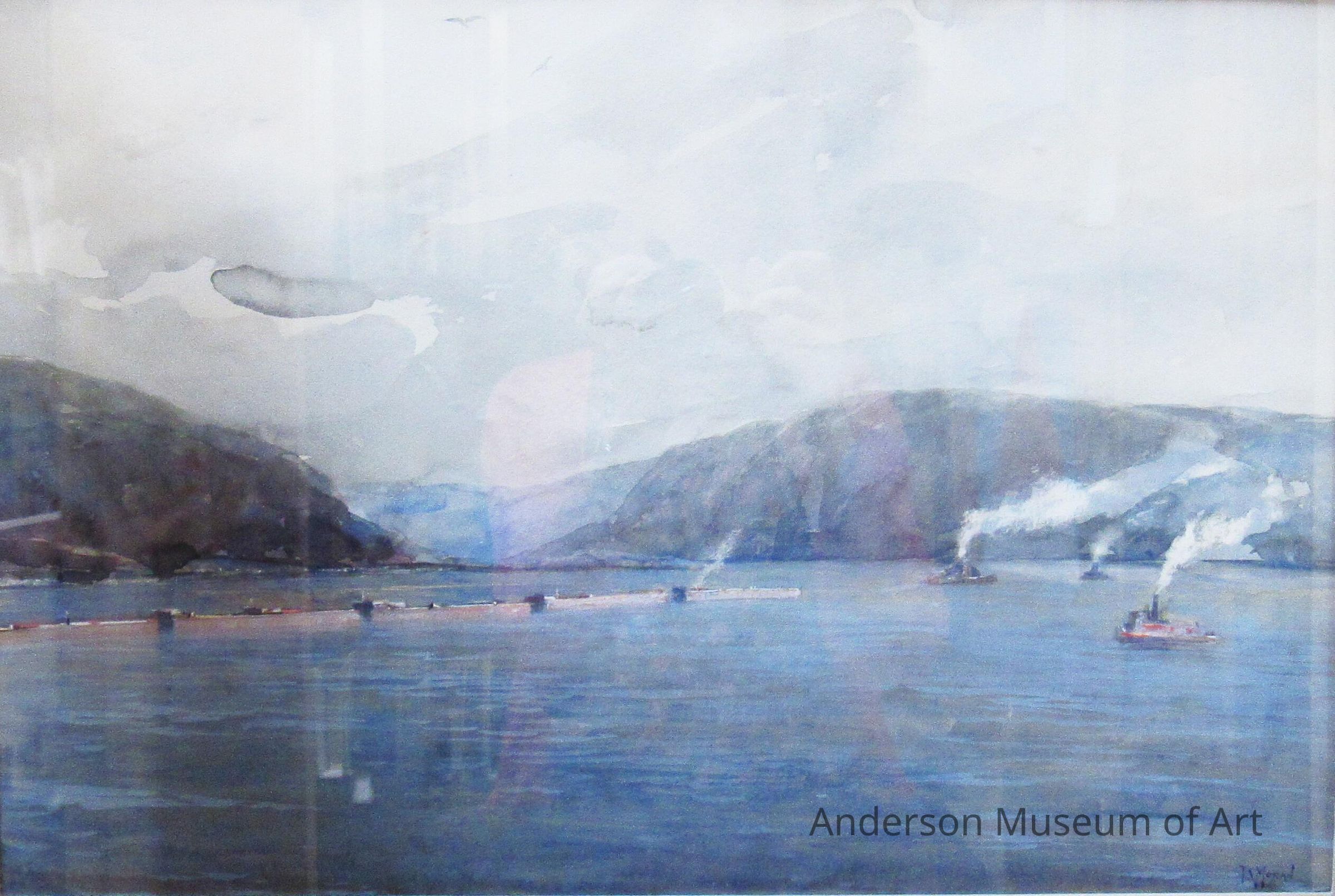 A water scene of a harbor. Three ships (steamers) are to the right of the composition. Steam is coming from these ships as well as one ship docked on the long breakwater coming from the left of the work. The water is colled blue upon greys. The landforms are greys in the foreground and blue-grey in the background. Two birds are seen in the upper sky. Accents of cadmium red in the ships and breakwater.Type of Painting