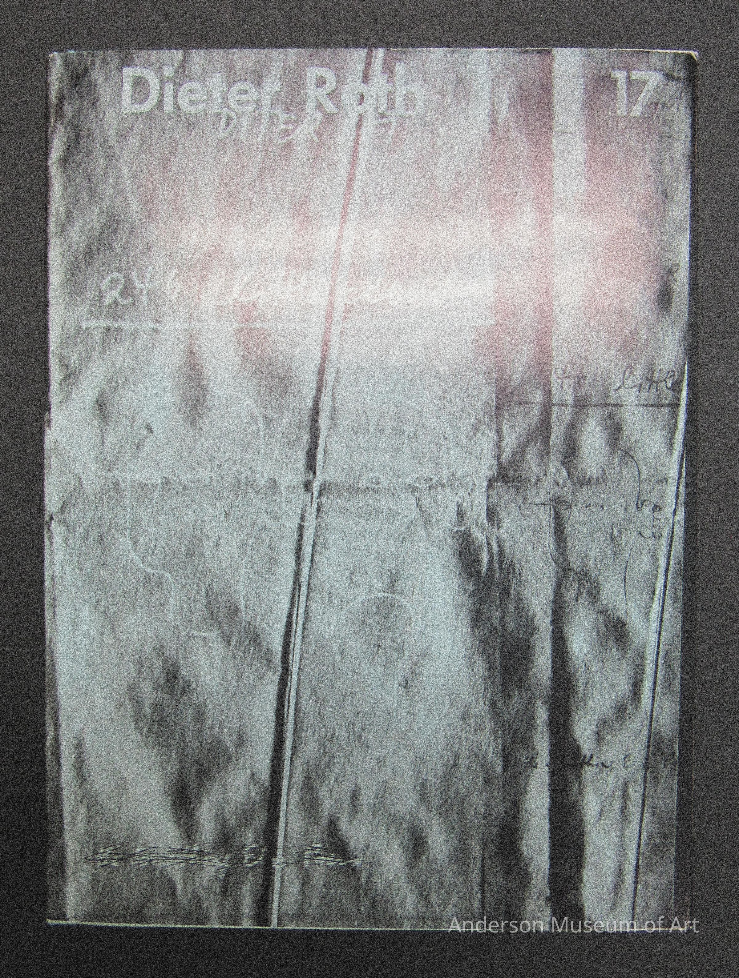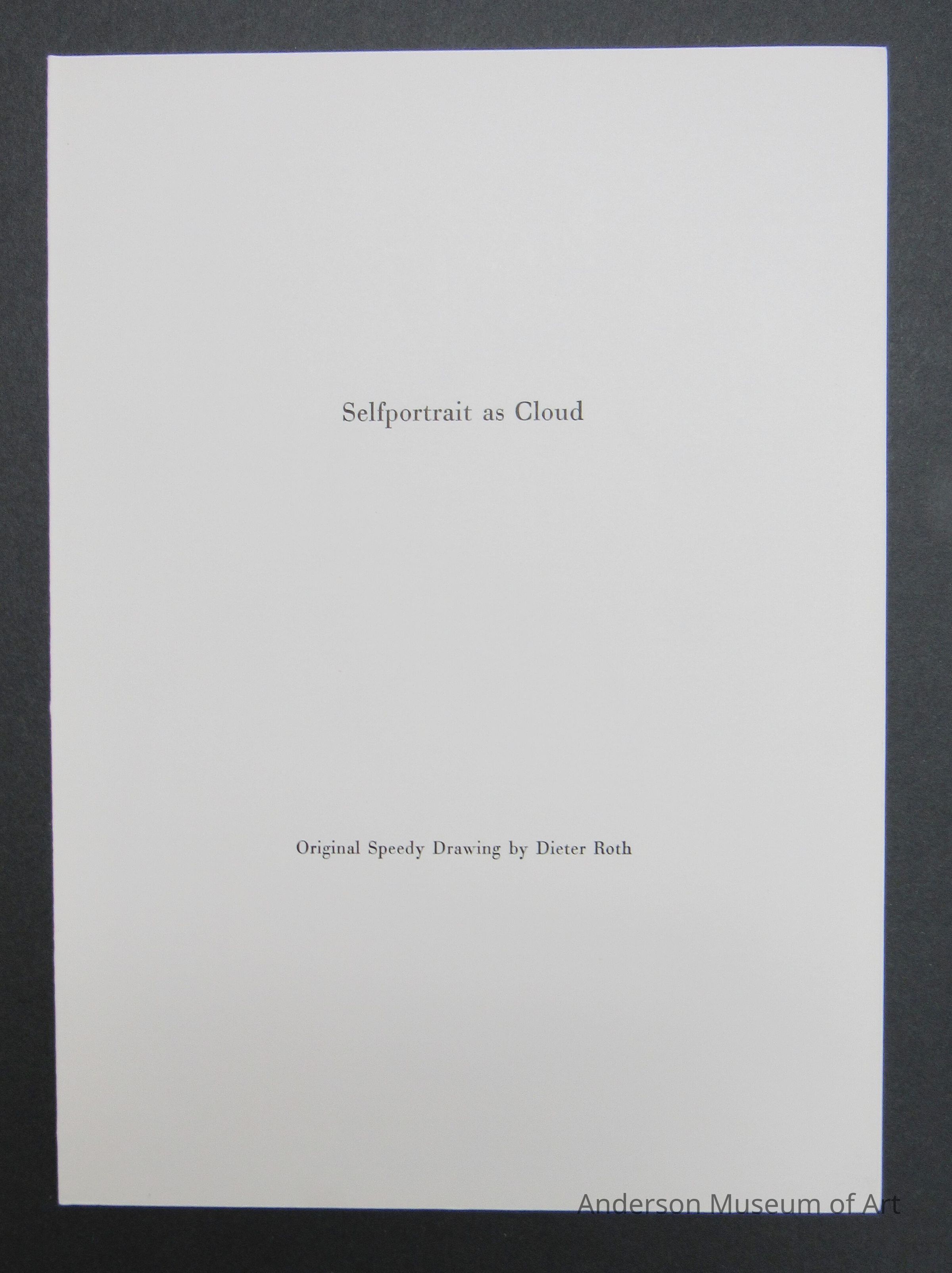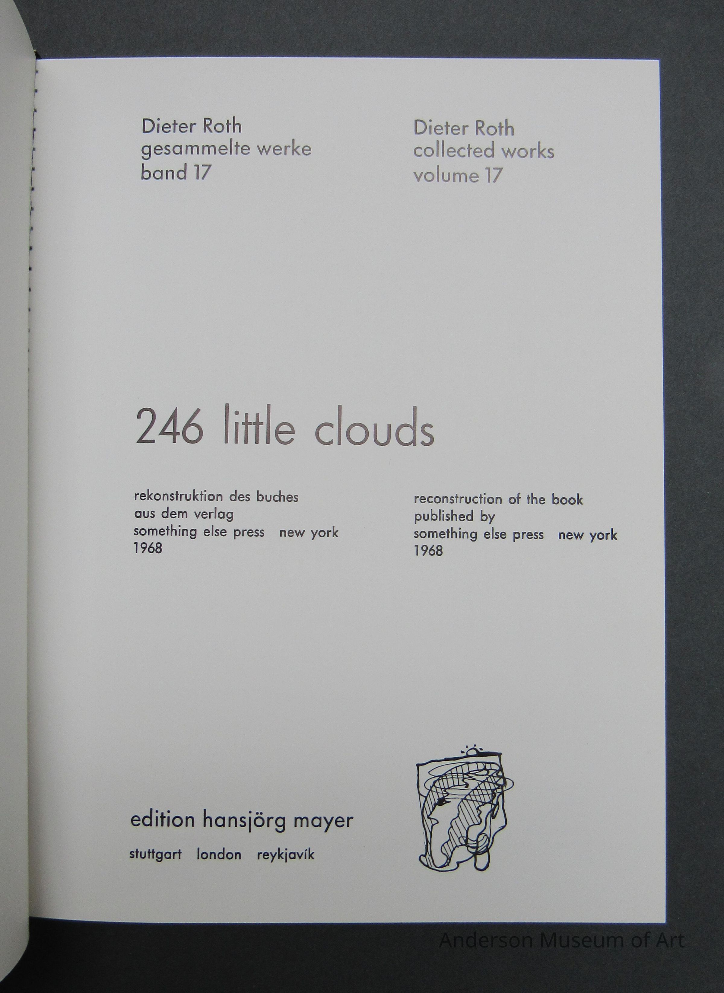Book with a blue and black jacket cover with some sketchs of faces on the front. The book itself is light blue and matches the slipcase. Book comes with an original drawing "Selfportrait as Cloud / Original Speedy Drawing by Dieter Roth." The drawing is very abstract and made up of red and blue lines. Signed in pencil and blue ink. The book has an additional cover in the inside starting at the second page. It reads "Dieter Roth/ collected works / volume 17 / 246 little clouds /reconstruction of the book / published by / something else press new york / 1968" Edition Hansjorg Mayer. Copyright 1976. Printed in Germany.Collection