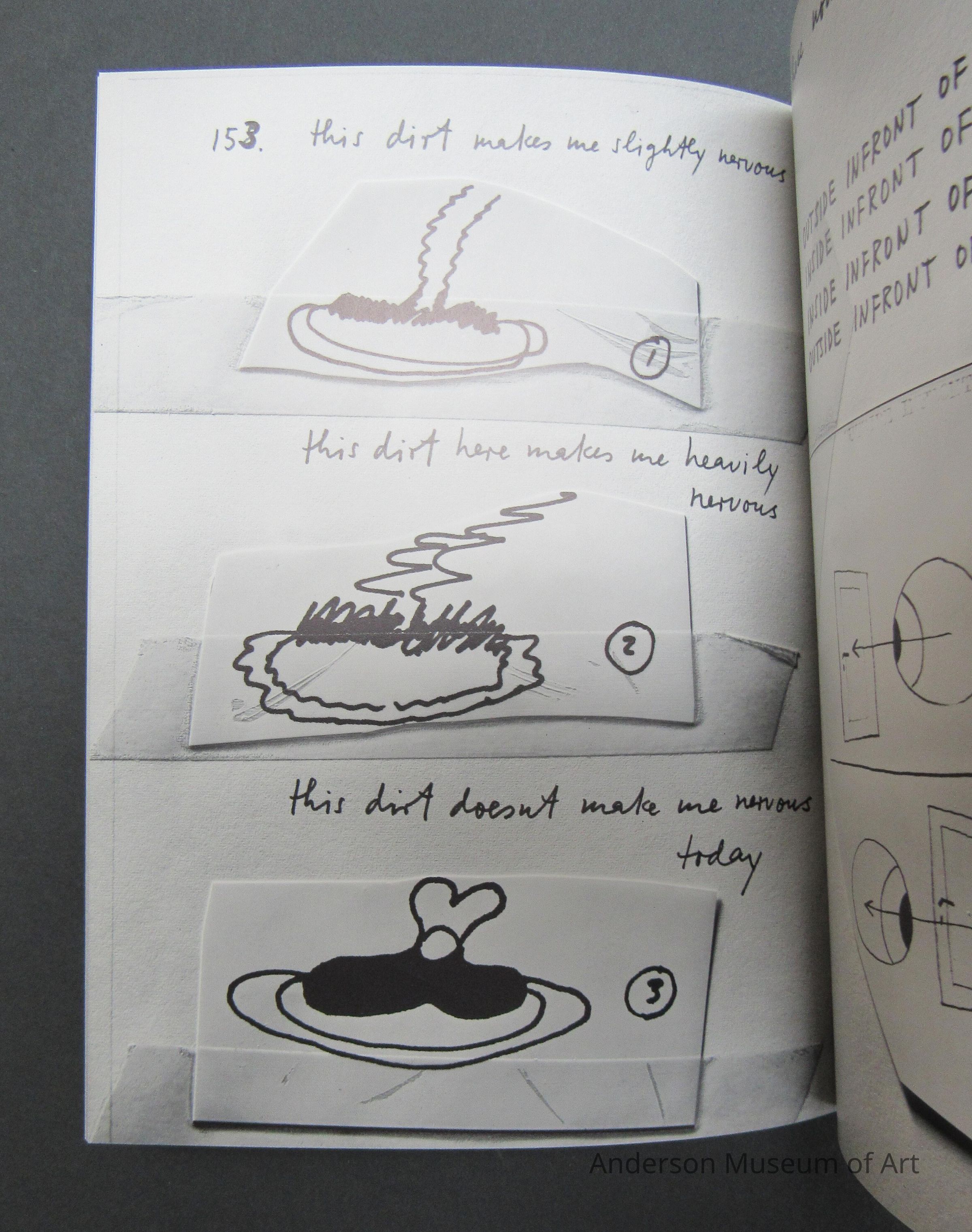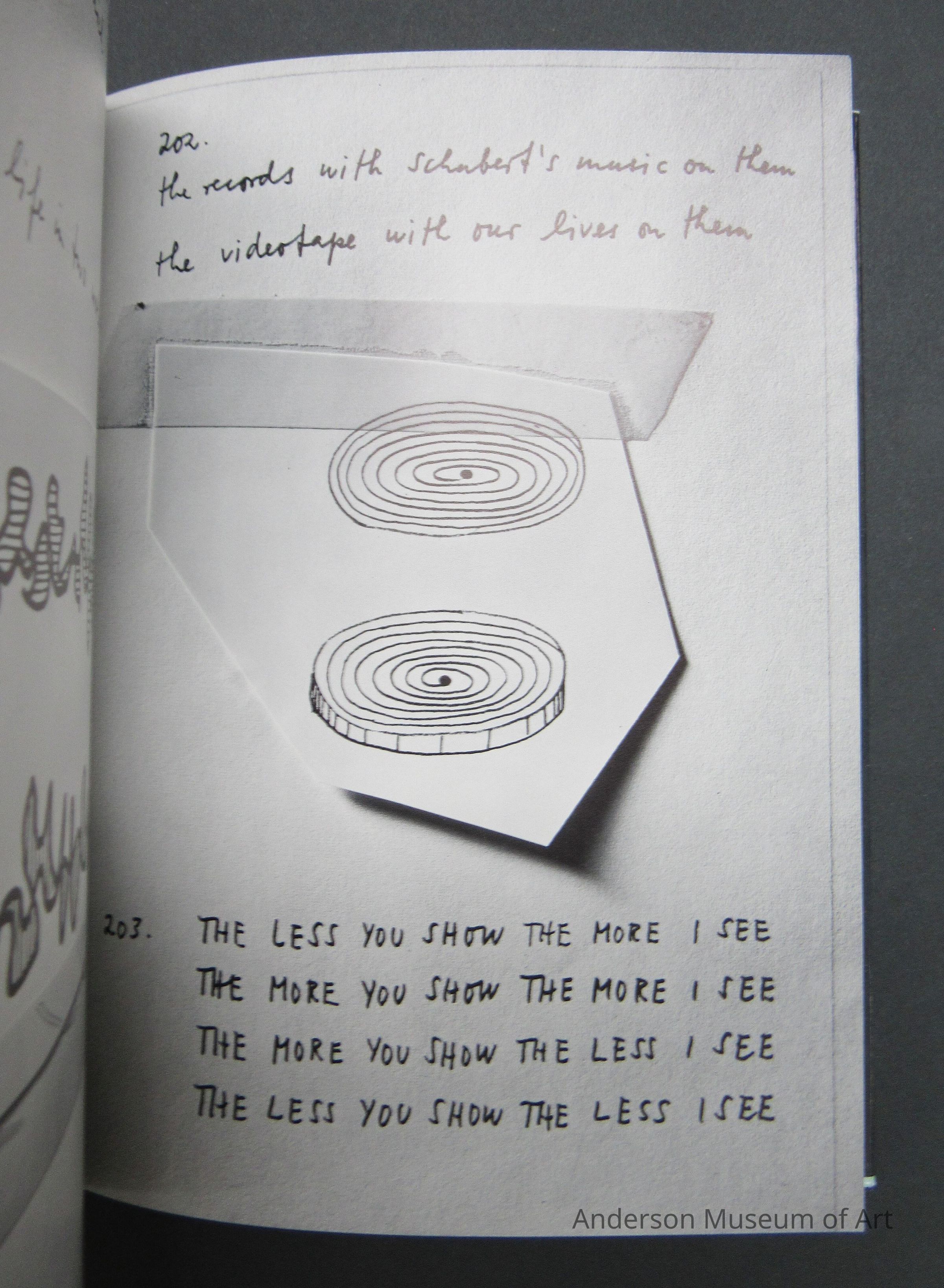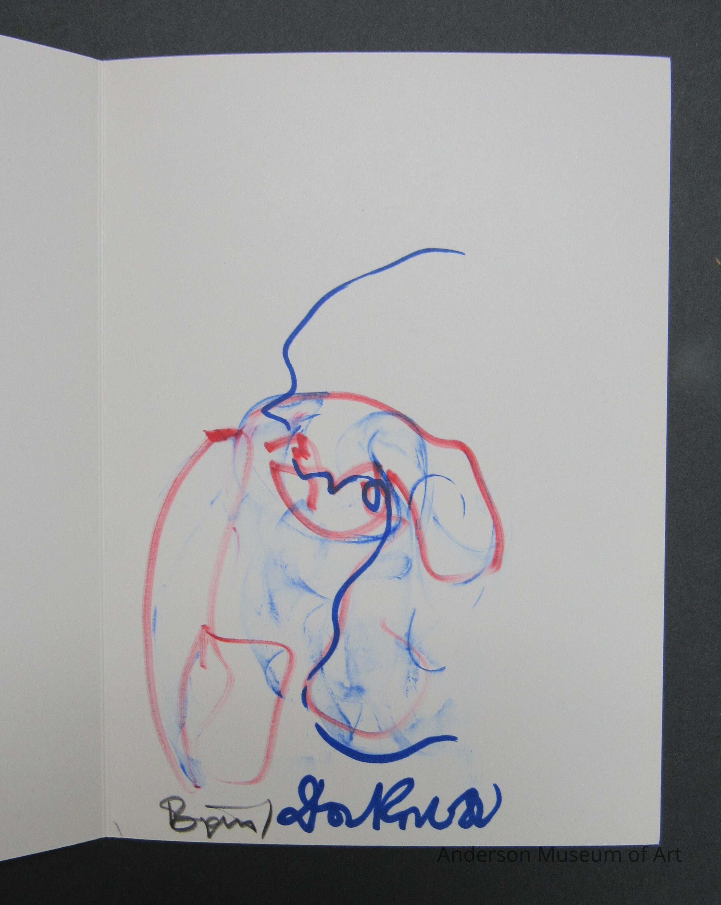 Book with a blue and black jacket cover with some sketchs of faces on the front. The book itself is light blue and matches the slipcase. Book comes with an original drawing "Selfportrait as Cloud / Original Speedy Drawing by Dieter Roth." The drawing is very abstract and made up of red and blue lines. Signed in pencil and blue ink. The book has an additional cover in the inside starting at the second page. It reads "Dieter Roth/ collected works / volume 17 / 246 little clouds /reconstruction of the book / published by / something else press new york / 1968" Edition Hansjorg Mayer. Copyright 1976. Printed in Germany.Collection