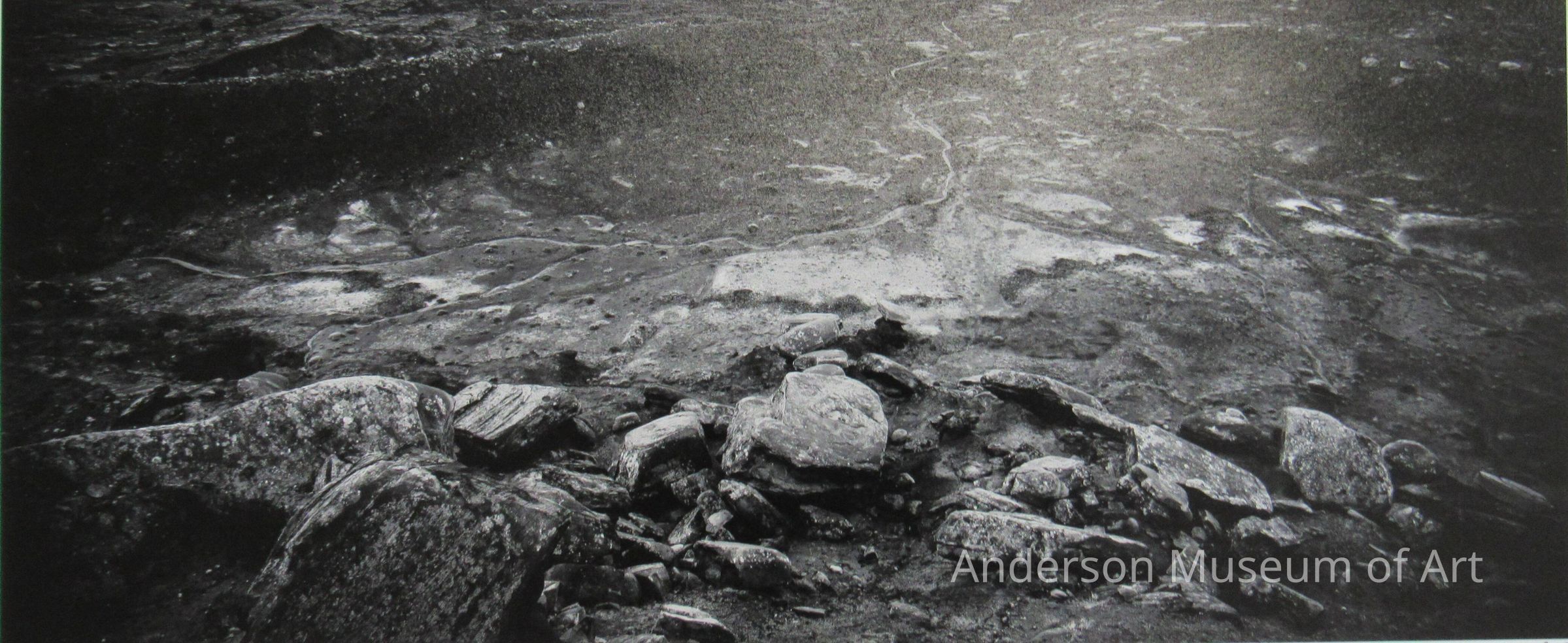 Black and white photographic landscape. The horizontal photograph is of a rocky and dry area. There are large rocks in the foreground. There is a slight hill on either side of the rocks which angle in towards the top right center. These small hills create a valley in the center of the image.Acquisition