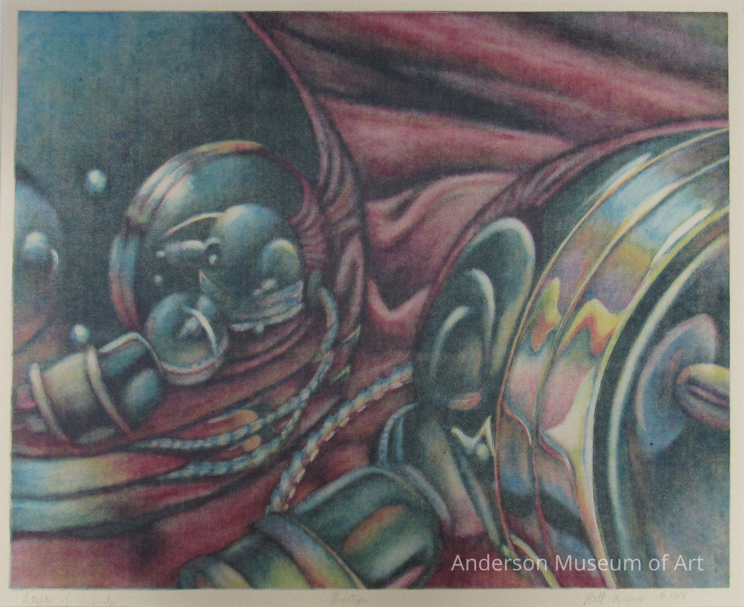 The image appears to be of the front of an old car; reflections in the chrome. The car itself is painted purple, and the chrome is shiny. LR, there appears to be a headlight. UL that headlight appears to be reflected in either paint or a chrome hood of some sort. LL below picture plane is written in pencil "Lights of Infinity." LC below picture plane is written "Matt Meers [copyright symbol] 1988." Study of reflections on metallic surfaces.Collection