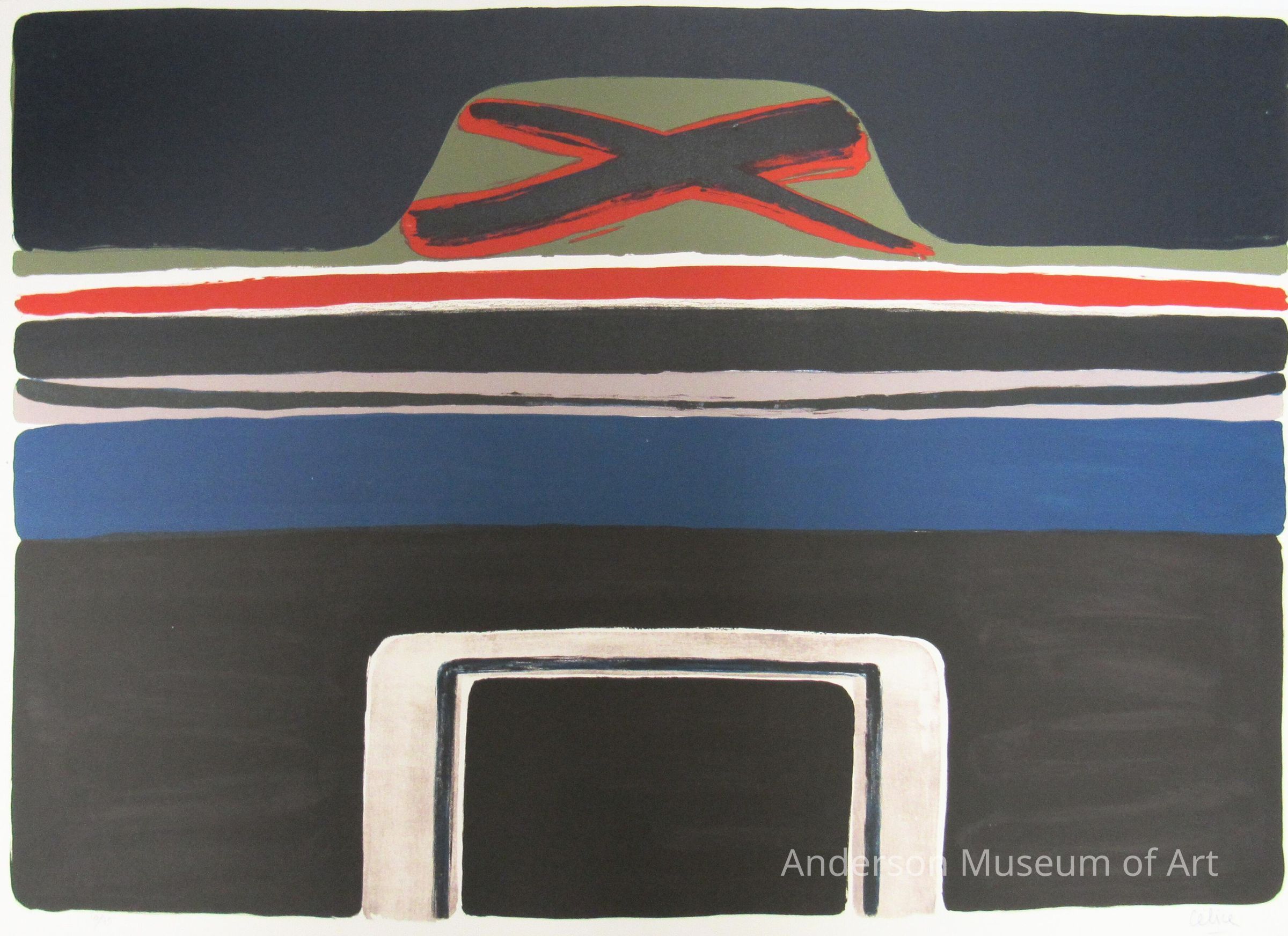Visually split into three sections. Top is black and appears to have a green hat shape with a red and black x in the middle. The middle section consists of horizontal lines starting with red, black, a mauve and black, and then a blue. The bottom is mostly black but appears to have a belt buckle shape which is grey with black in the center. Print 10/75.Collection