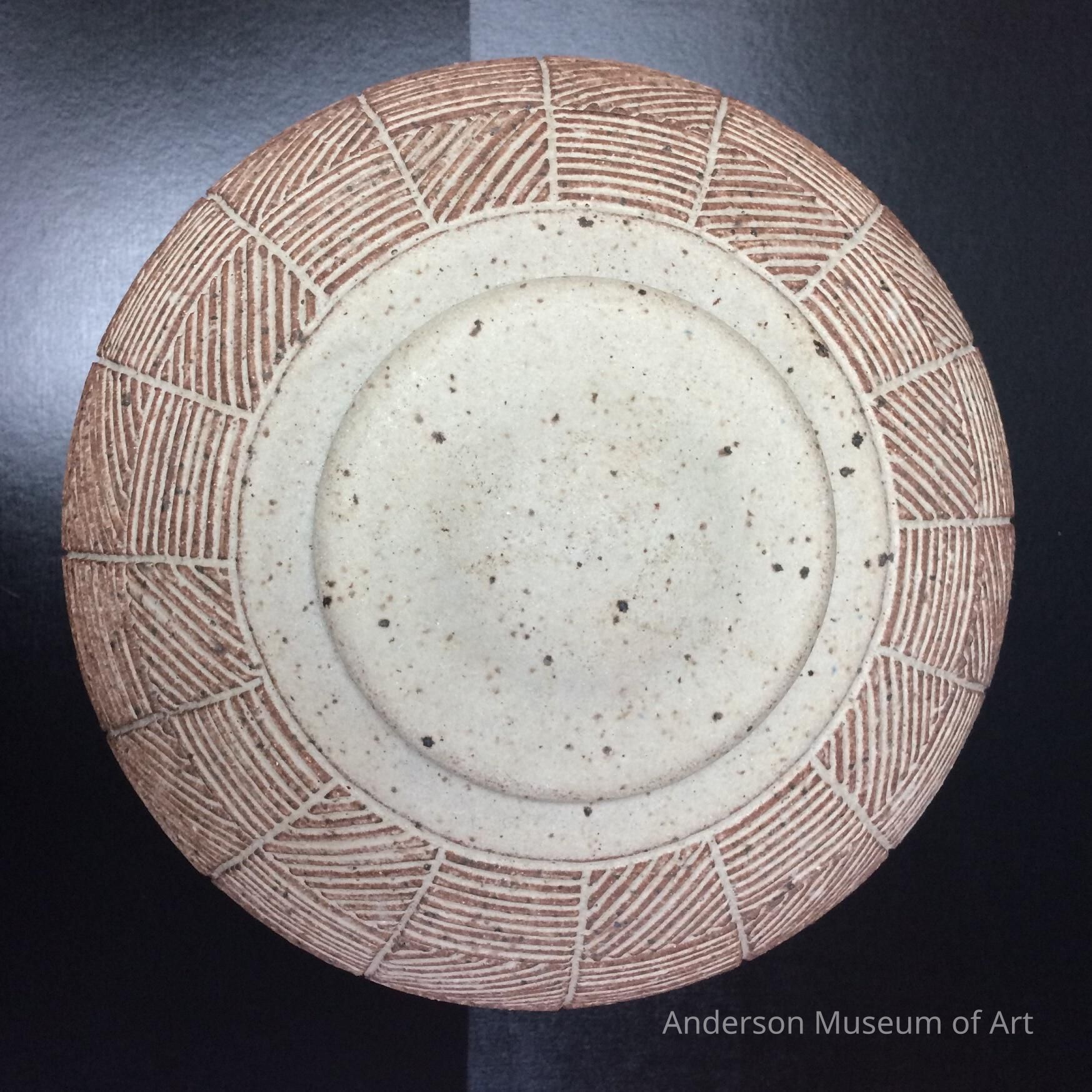 A stoneware bowl with lid. The primary design consists of a nearly arranged geometric grid of brown raised lines on a beige background. The brown grid lines alter from horizontally arranged lines to diagonals tilting toward the lower left, then back to the horizontal lines, then back to the diagonals, etc. Shape is round for the most part and about the size of a basketball and the shape of a basketball. The opening is at the top and is 3 1/4" in diameter. The piece is signed in the stone on the bottom , "R. Tuck."Type of Sculpture