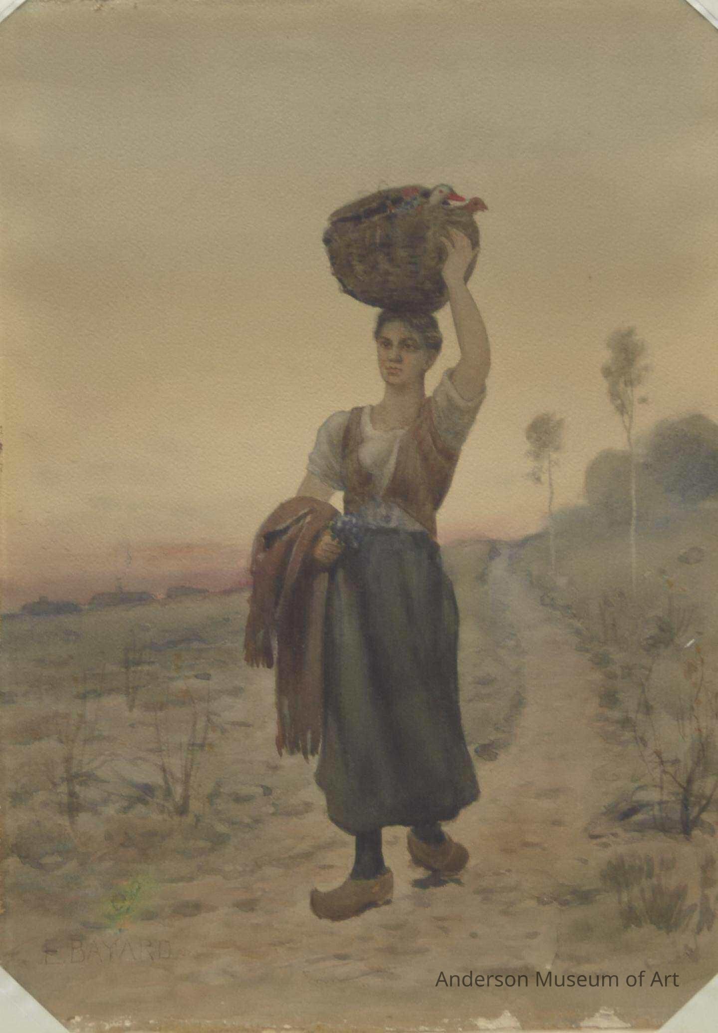 The central is image that of a woman walking down a narrow footpath with a basket balanced on her head. She supports the white flower. Her shoes appear to be on the wrong feet and made in the fashion of Dutch wood shoes. In the basket on the girl's head appear to be two chickens and a duck. The surrounding landscape is relatively barren, though there are suggestions of overall green-ness about it. In the lower-left background appear three mud-like houses, and the middle one appears to have smoke rising from the chimney. Several bird-like forms can be seen over the houses. The woman wears a white blouse, striped vest, green stockings, and a green skirt.