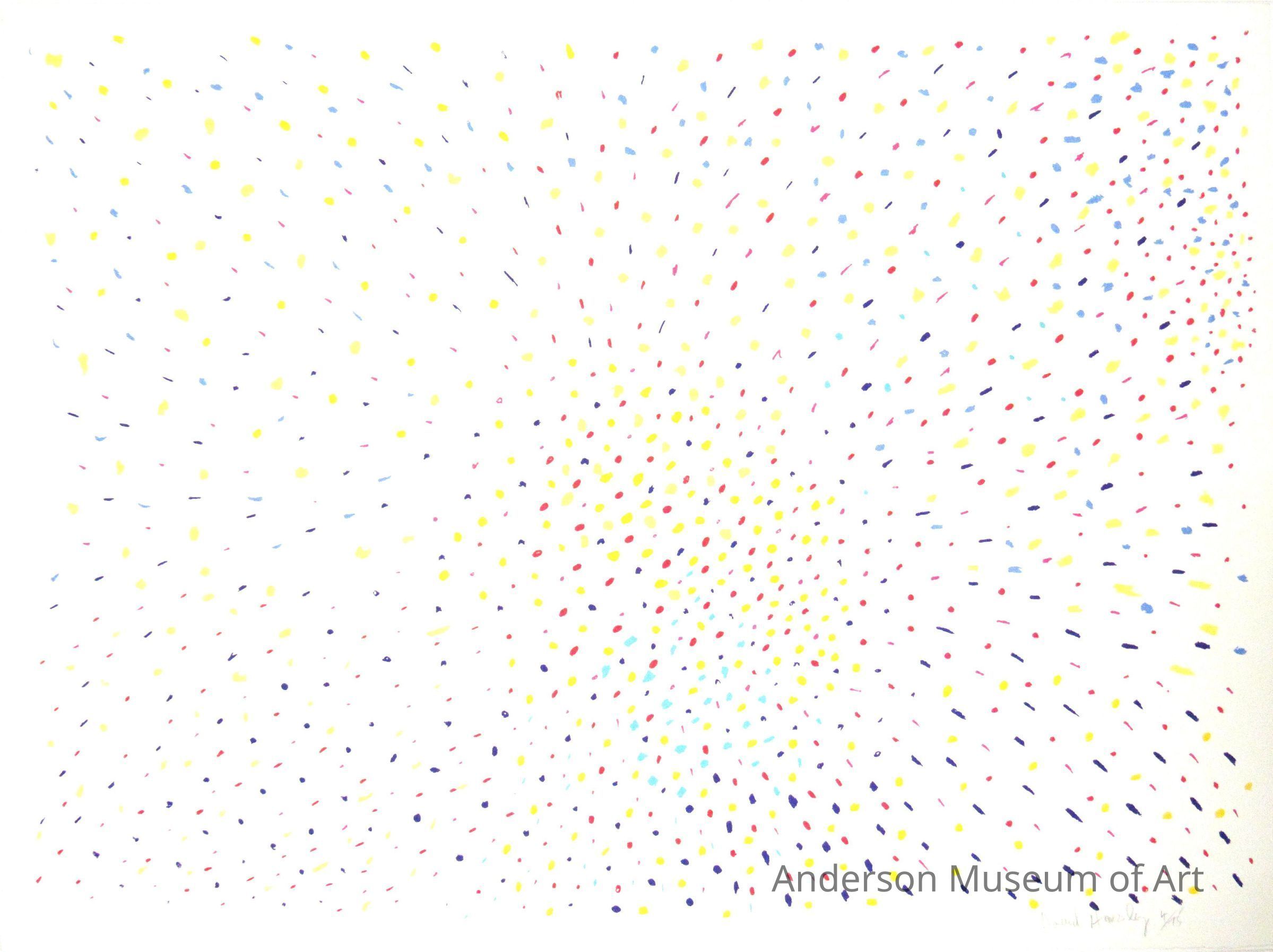 White paper covered in dots and various small markings. They appear to radiate from the lower right area. There is a closer concentration of markings in this area and a higher count of yellow and blue markings. There are also pink and purple markings throughout. The outward markings are more lines than the dots in the center, which point towards the central area. Print 4/75.Collection