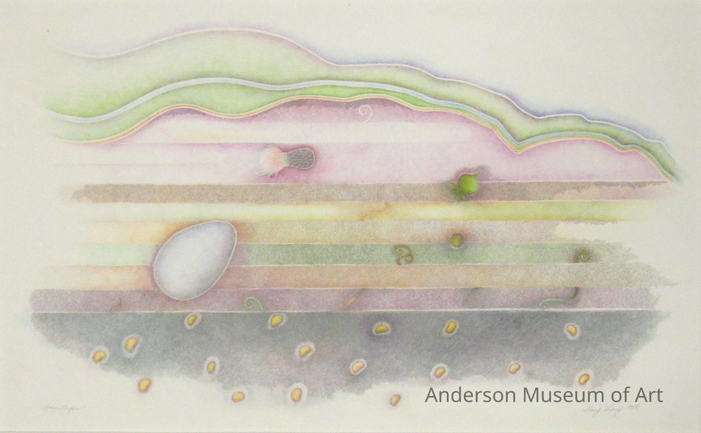 This image is made up of several layers. The bottom layer has a green tint and has seventeen beans. The second layer has six bands of different colors. On top of these bands are an egg and several spouts, some green and some red/orange. Both of these two layers have a lightly textured wave pattern. The next section is purple and has a thistle and a green bud. The top layer is hilly and green.Type of Drawing