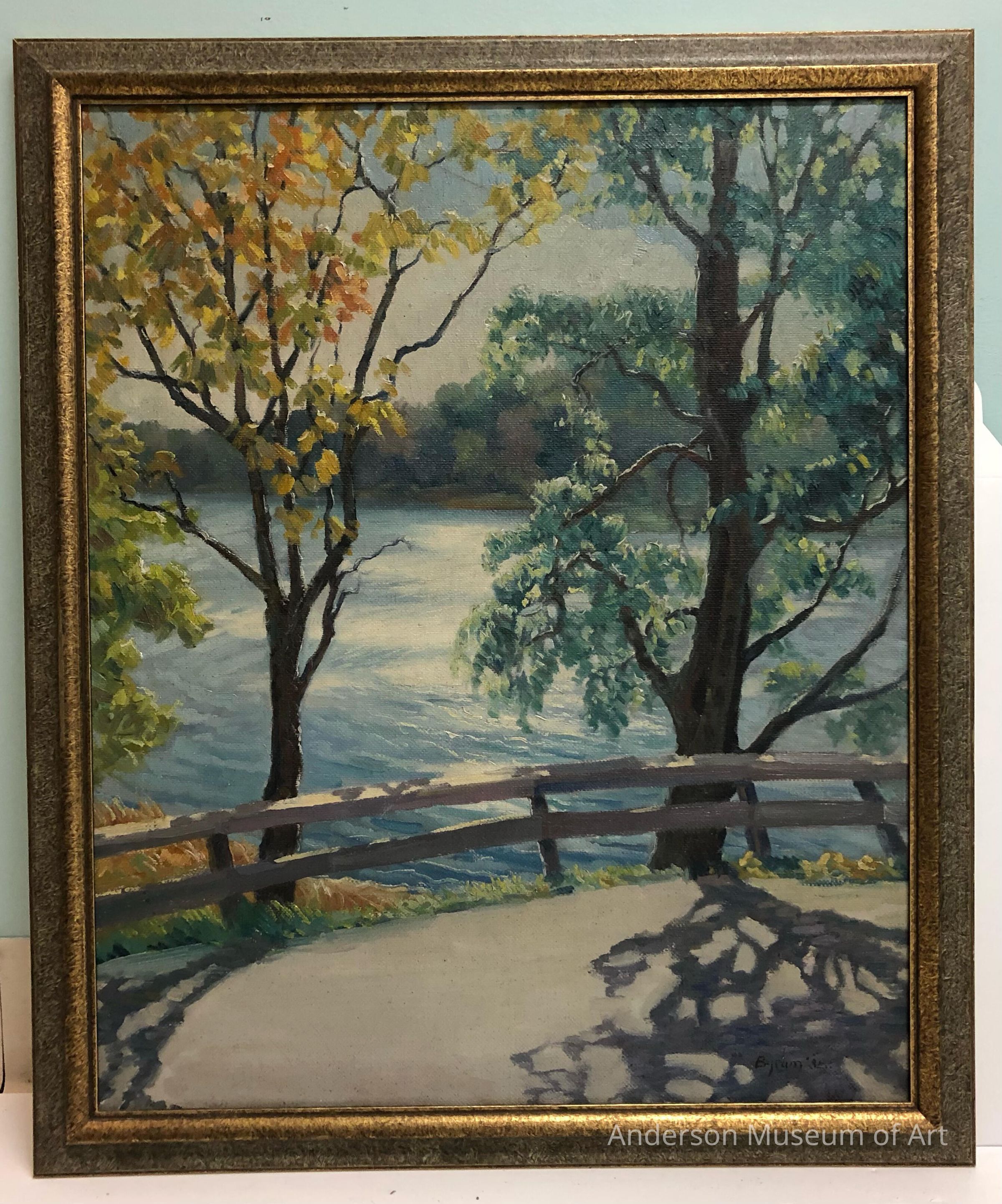 Painting of a road look out over a river. The road and guard rail are in the foreground. There are two big trees right behind the rail casting shadows on the road. The tree on the right has darker green leaves while the tree on the left has lighter green with some oranges and yellows as well. The river is blue with areas of white/rapids in the center of the image. Trees line the other side of the riverbank. Signed Byrum '31 in black in the lower right corner.