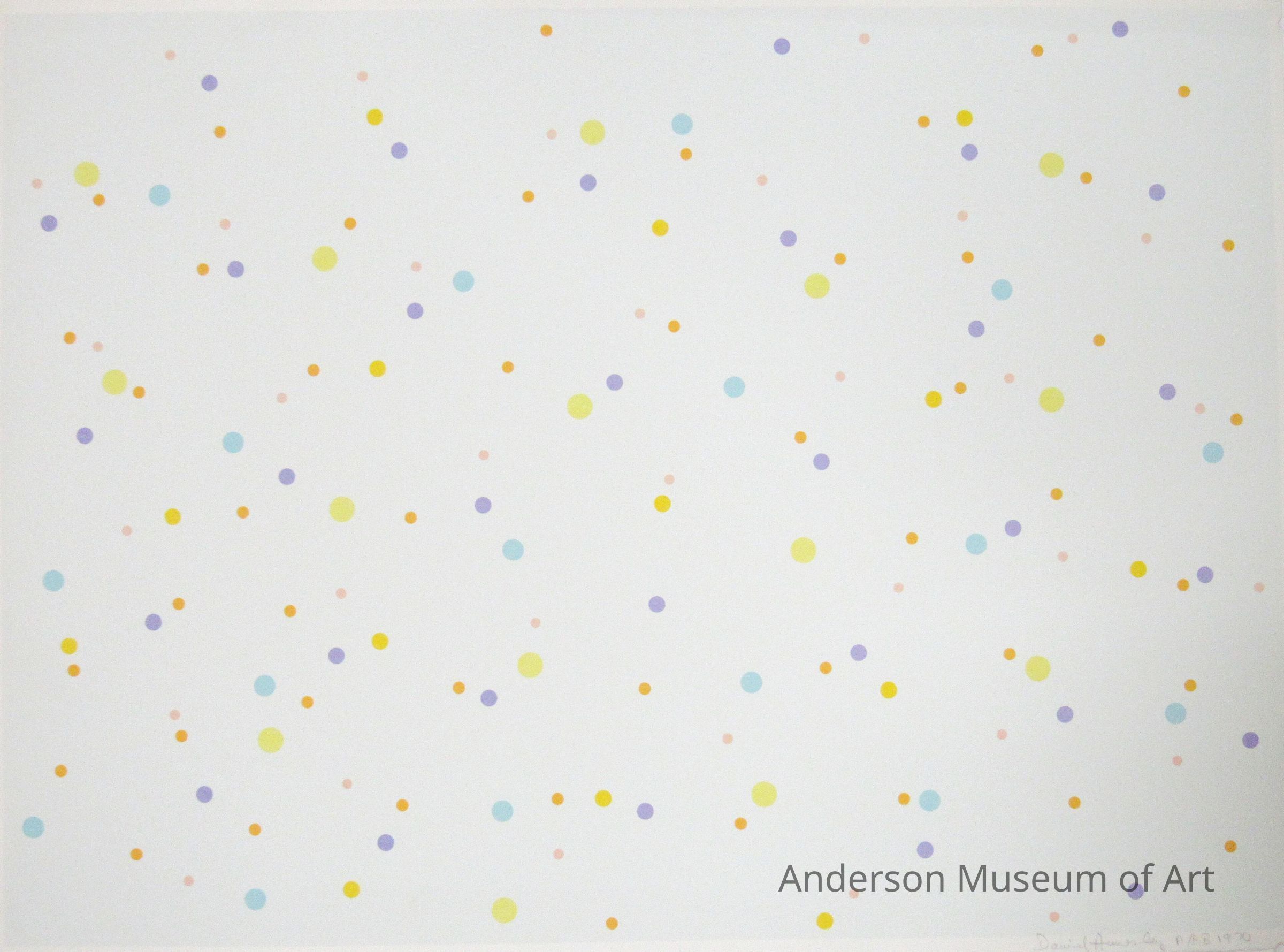 Light green (mint green) background. The image is filled with dots in various sizes and colors. The blue and yellow dots are the largest. The purple and golden yellow are the next sizes down and the orange and pink are the smallest.Collection