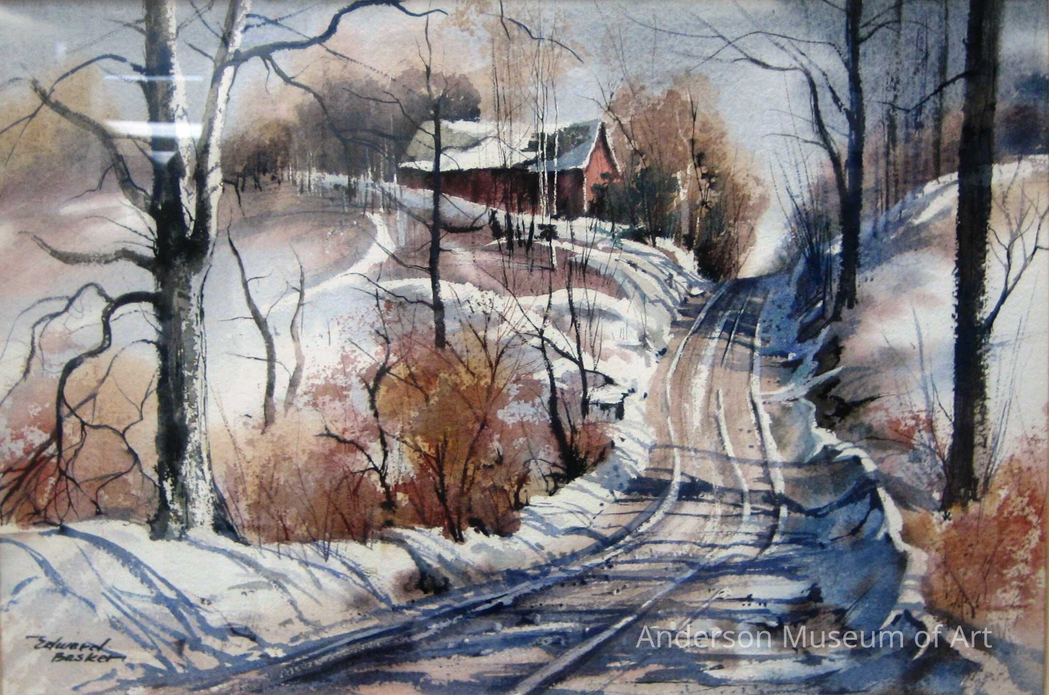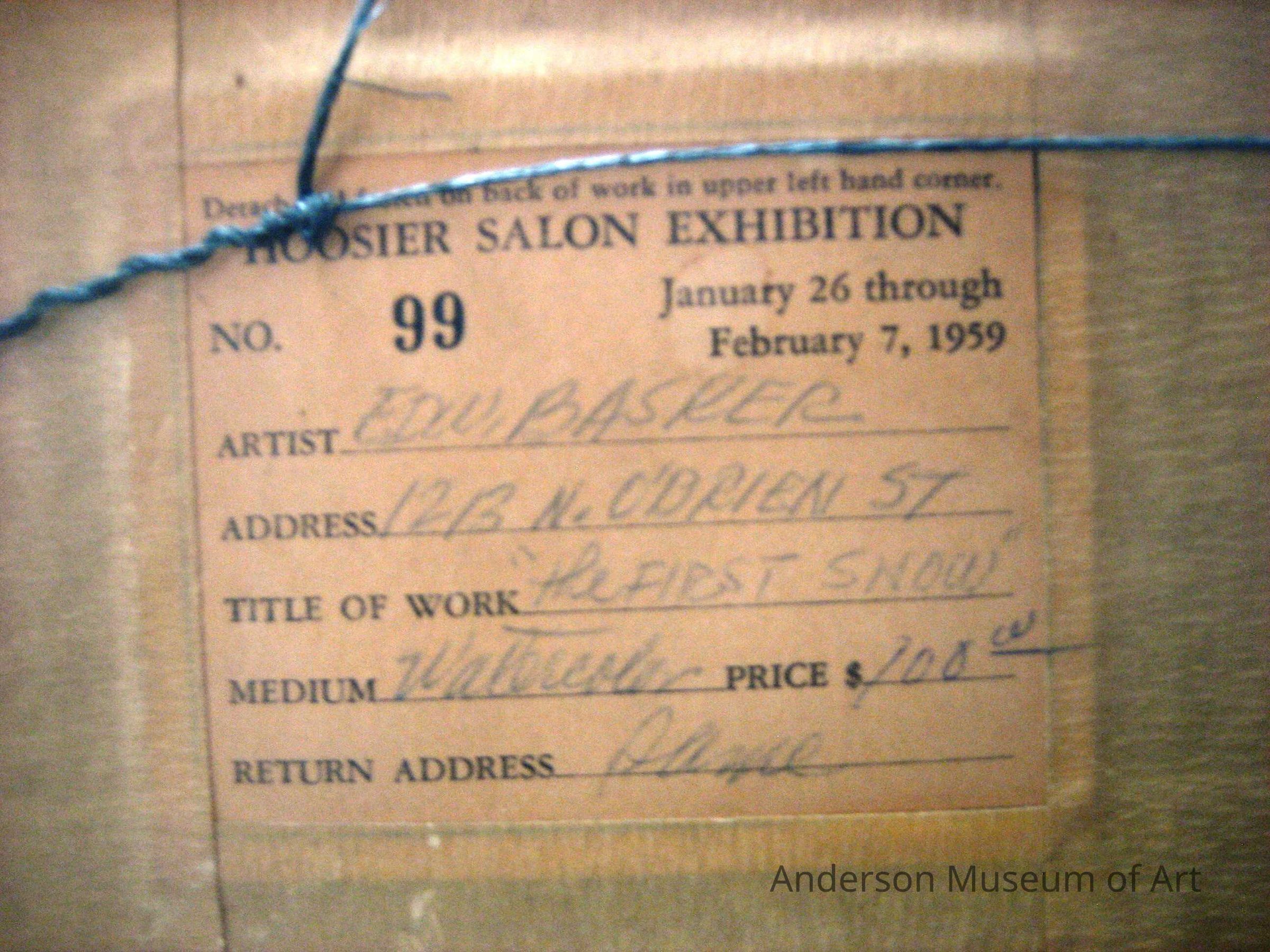 On the front of the frame is a metal plate that reads "The First Snow / Edward Jay Basker / Mrs. T.C. Werbe prize 1959 / Anderson Civic Arts Association"Type of Painting