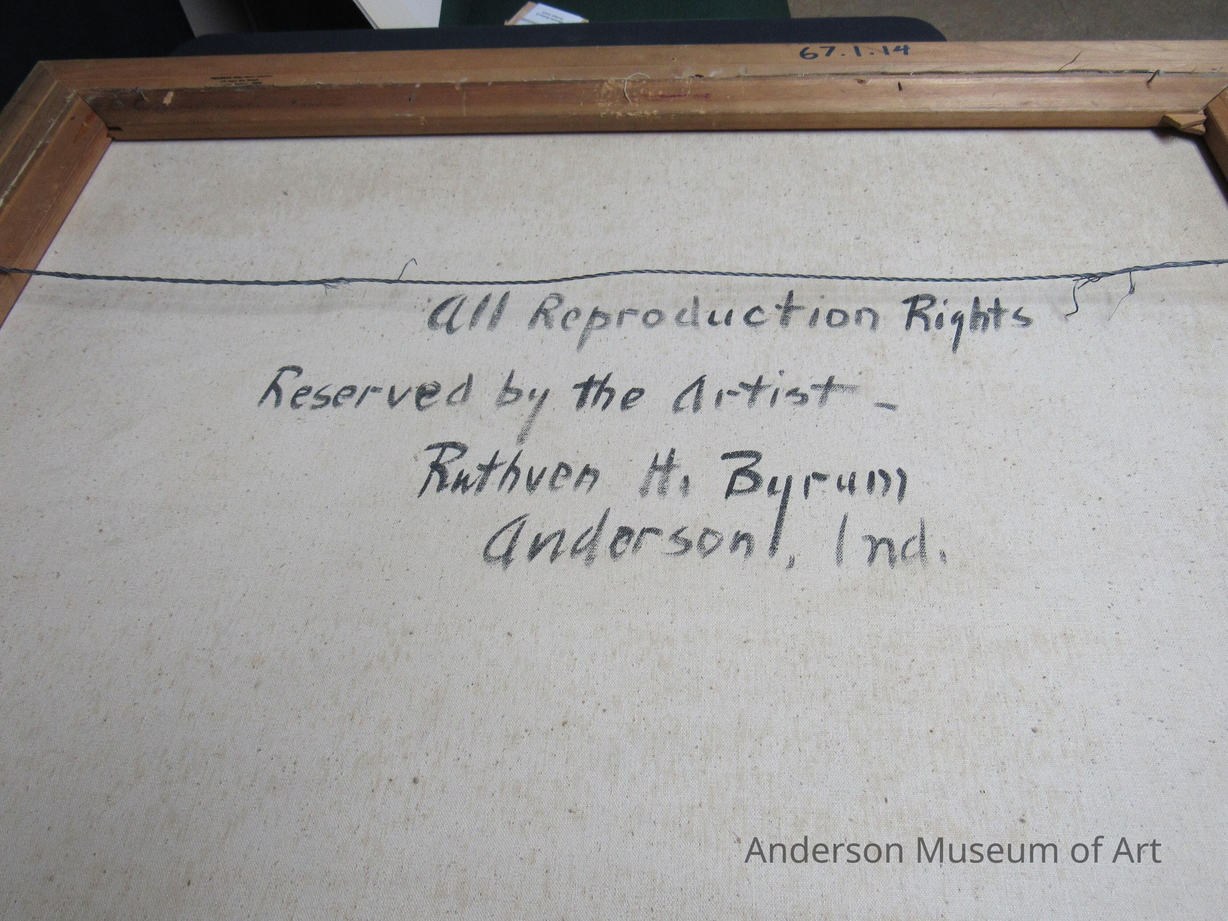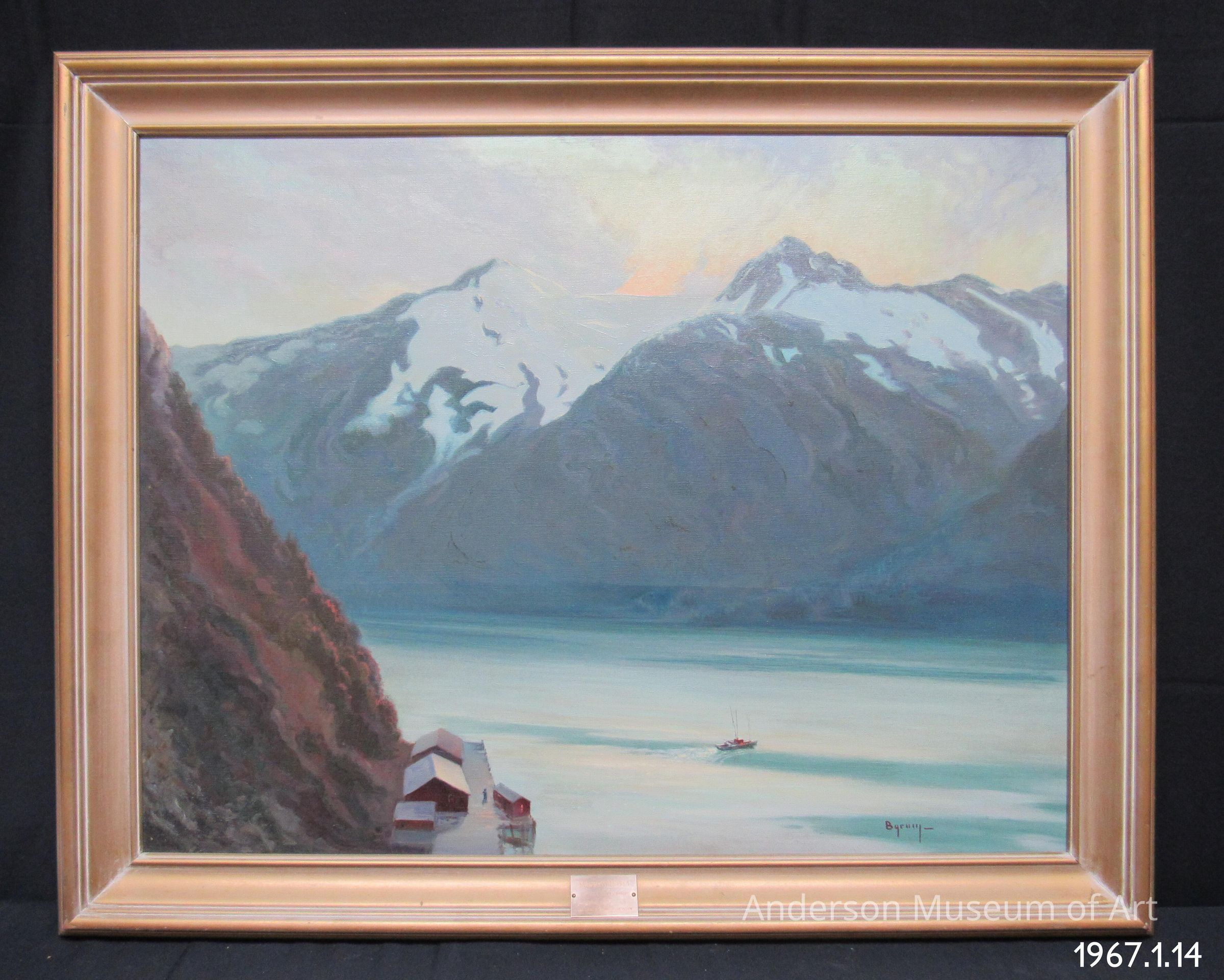 Oil on canvas depicting an Alaskan scene. In the foreground is a pier with four small buildings and one figure. To the left of the pier is a mountain slope with trees that rise sharply upwards into the upper third of the composition. A large lake or river extends from the lower right foregrounds in the middle ground. There is a small fishing boat in the middle ground slightly right of center. The background is dominated by two large snow-capped mountains and sky. The painting is signed in the lower left corner in red violet paint "Byrum". The painting is framed in a wooden moulding painted gold. A brass plaque at the bottom center of frame reads "SKAGWAY, ALASKA; Ruthven Holmes Byrum; Memorial Purchase, 1958; Anderson Civic Art Association". The verso of the canvas reads "All Reproduction Rights Reserved by the Artist --Ruthven H Byrum Anderson, Ind." On the stretchers "Skagway Alaska $350.00".Type of Painting