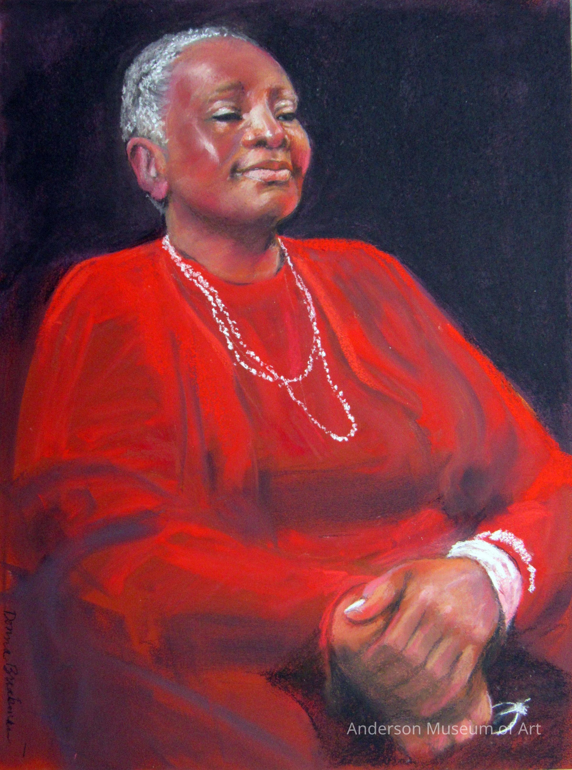 Portrait of an African American woman in a vivid red dress. She is seated, smiling, facing the viewer's right, with her hands' folder over the top of each other. Her hair is very short and gray. She is also wearing a white bracelet on her left wrist and a necklace. She is holding glasses in her right hand. The background is solid black. It is signed "Donna Brinkman" vertically along the bottom left side.Type of Drawing