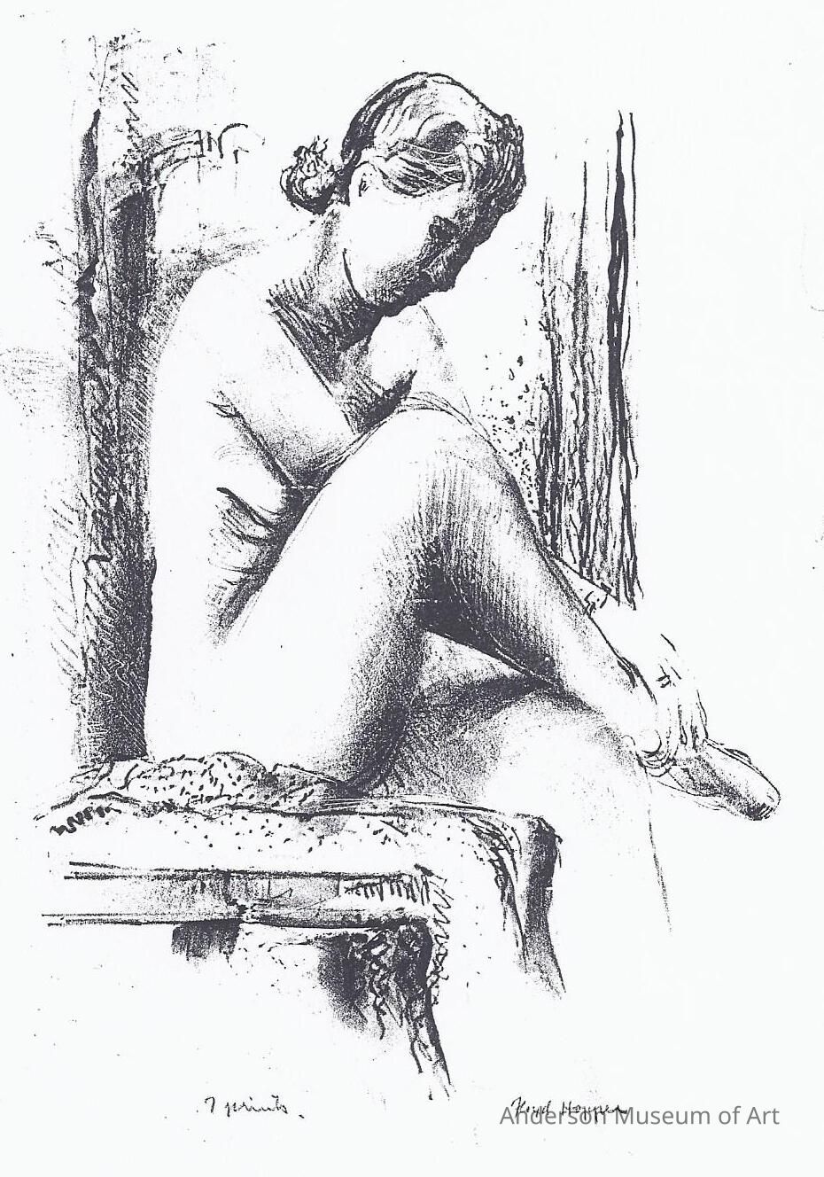 There is a naked woman sitting on a bench. Her clothing is lying beneath her on the bench. She appears to be putting a ballet shoe on her right foot. Her hair is in a bun and she is wearing a ring and a watch. The seated figure is heavily shaded, especially around the face.Acquisition
