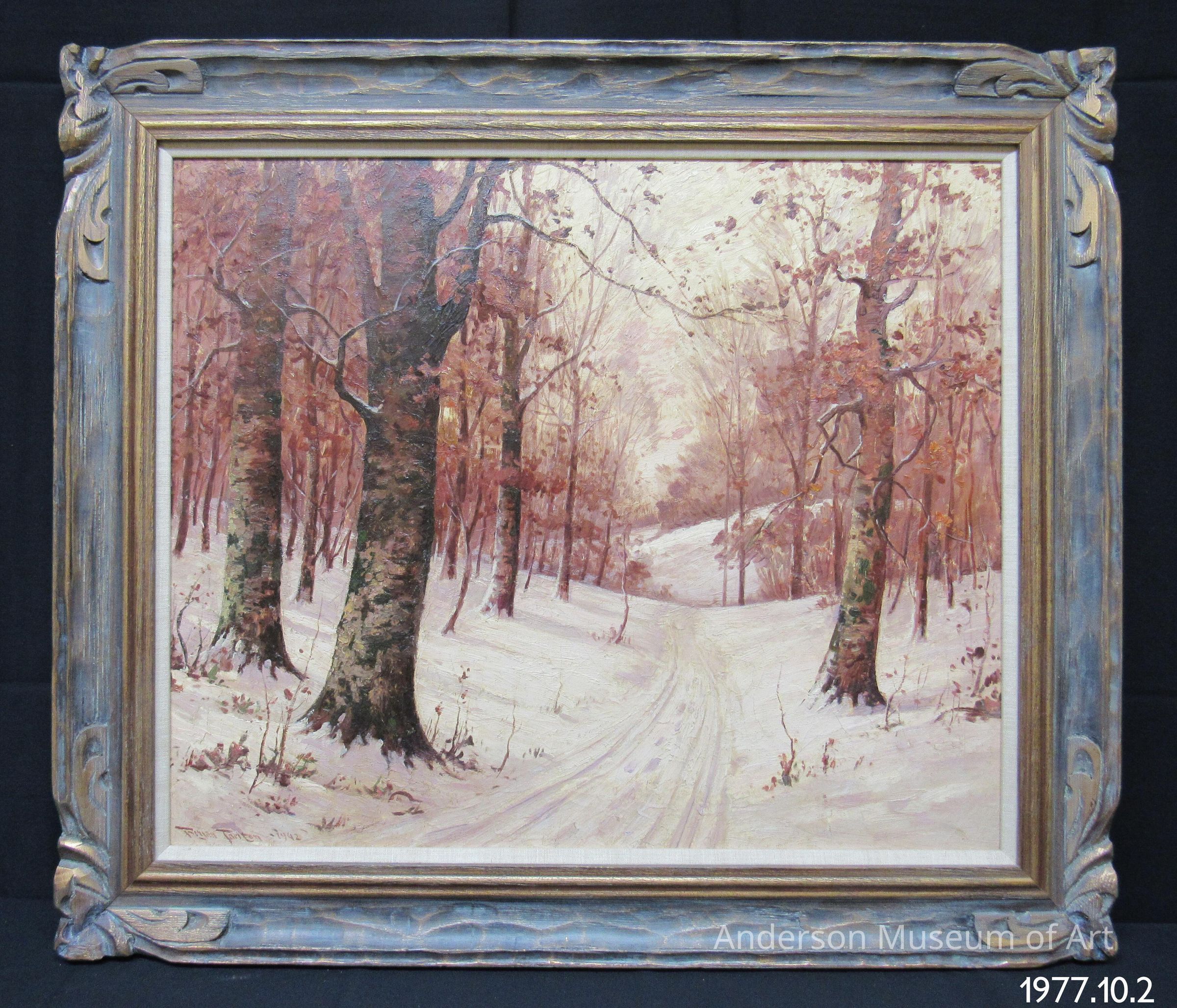 It is signed in the lower left corner "Bryan Tarlton, 1942." Carved through rough frame, "Painted special for Chas. Peek, "Winter Evening" beech woods, Oil painting by Bryan Tarlton 1942."Type of Painting
