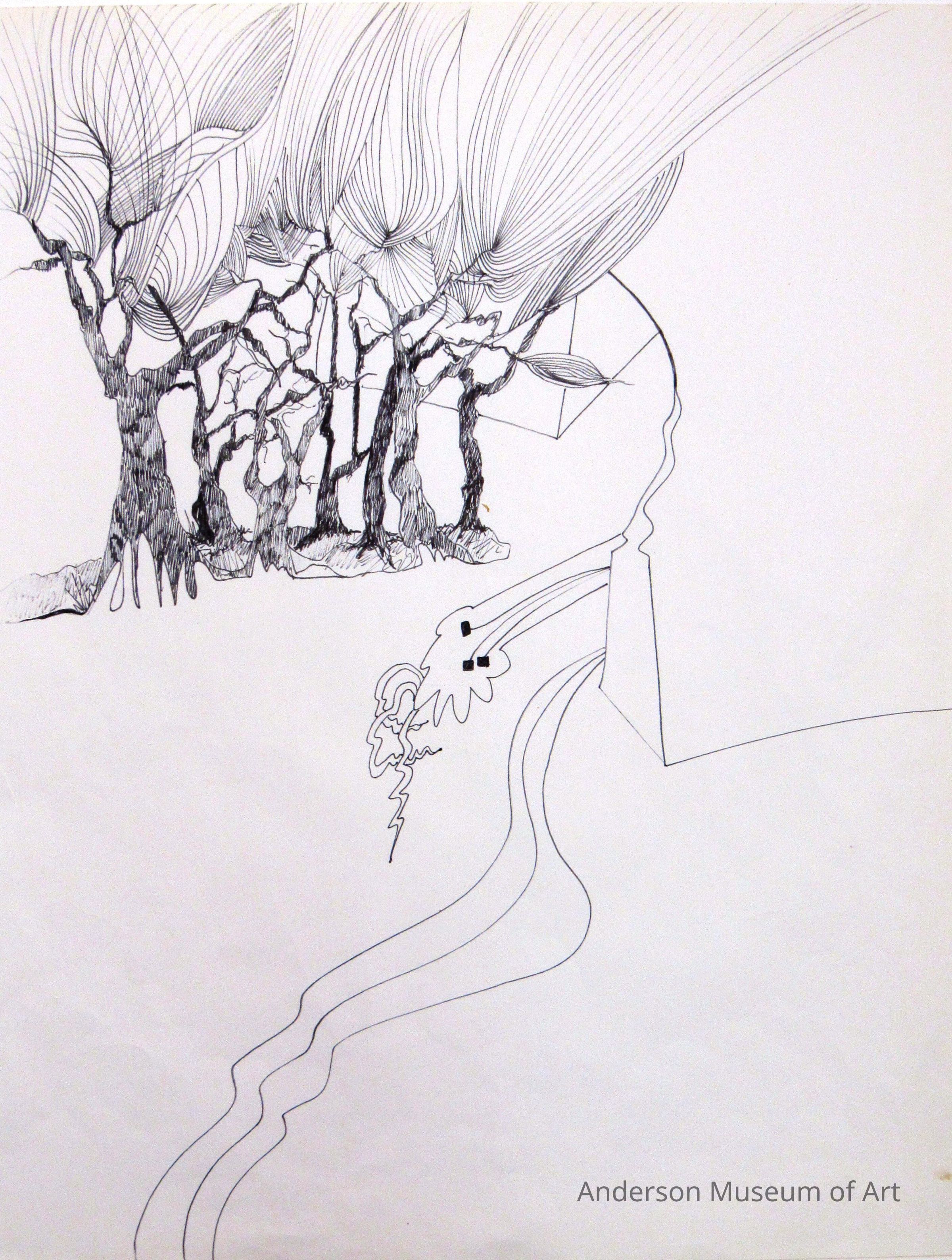 The minimalistic abstract sketch is drawn in black ink only. There are seven trees in the top left quadrant which have long lined branches/leaves shooting upward. Flowing along the right and downward is a variation of lines, some creating 3-D shapes others flowing like a river.Type of Drawing