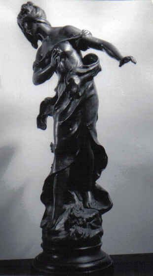 Young woman wearing flowing robe in motion. She has long hair pulled back. Her arms are extended, she is looking down, and moving forward. Her clothing is blowing around. She stands on an uneven mound of earth with her right foot in front.Type of Sculpture