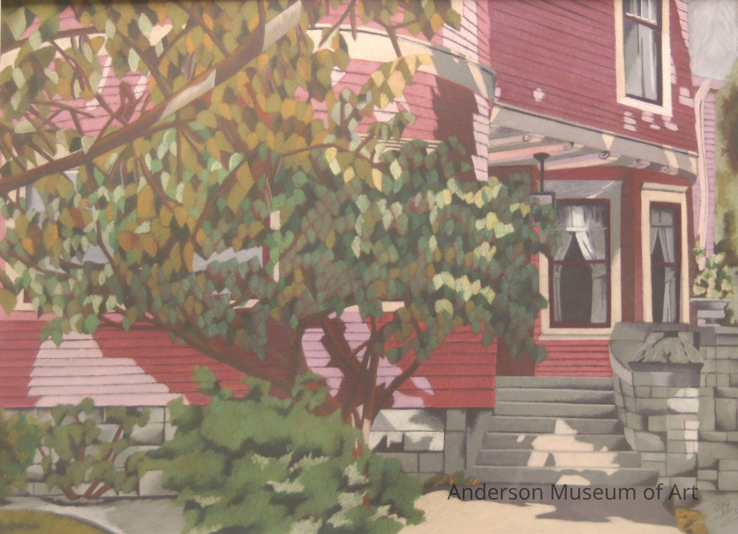 Close up of a front porch of a Victorian-style house. The house has pink siding, which turns red under the shadows. There are three visible windows, all with white curtains. The porch and foundation are made of grey stone. There are a tree and some bushes along the left foreground. The tree covers up a good portion of the side of the house. The house is located on Historic 8th Street, less than a block west of the old art center.Type of Drawing