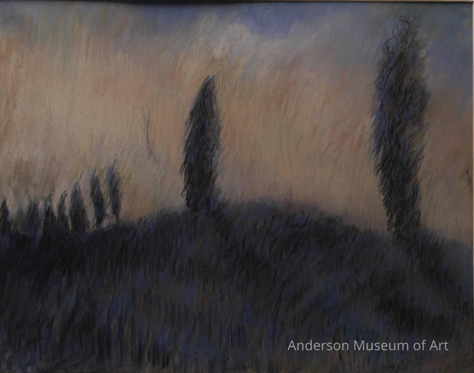 Objective imagery suggestive of eleven cedar trees seen lining the top of a ridge; two trees (the tallest ones) appear to be standing in the immediate foreground and the remaining trees appear in the distance. The predominant colors are blues with dark tones used in the lower half of the picture and lighter blues appearing near the top of the picture. Yellows and whites are evident in the middle of the picture. It is dated "10-83" in the lower right corner. Immediately above the date appears the artist's signature "R. Aker." The paper is watermarked with "MI-TEINTES CANSON."Type of Drawing