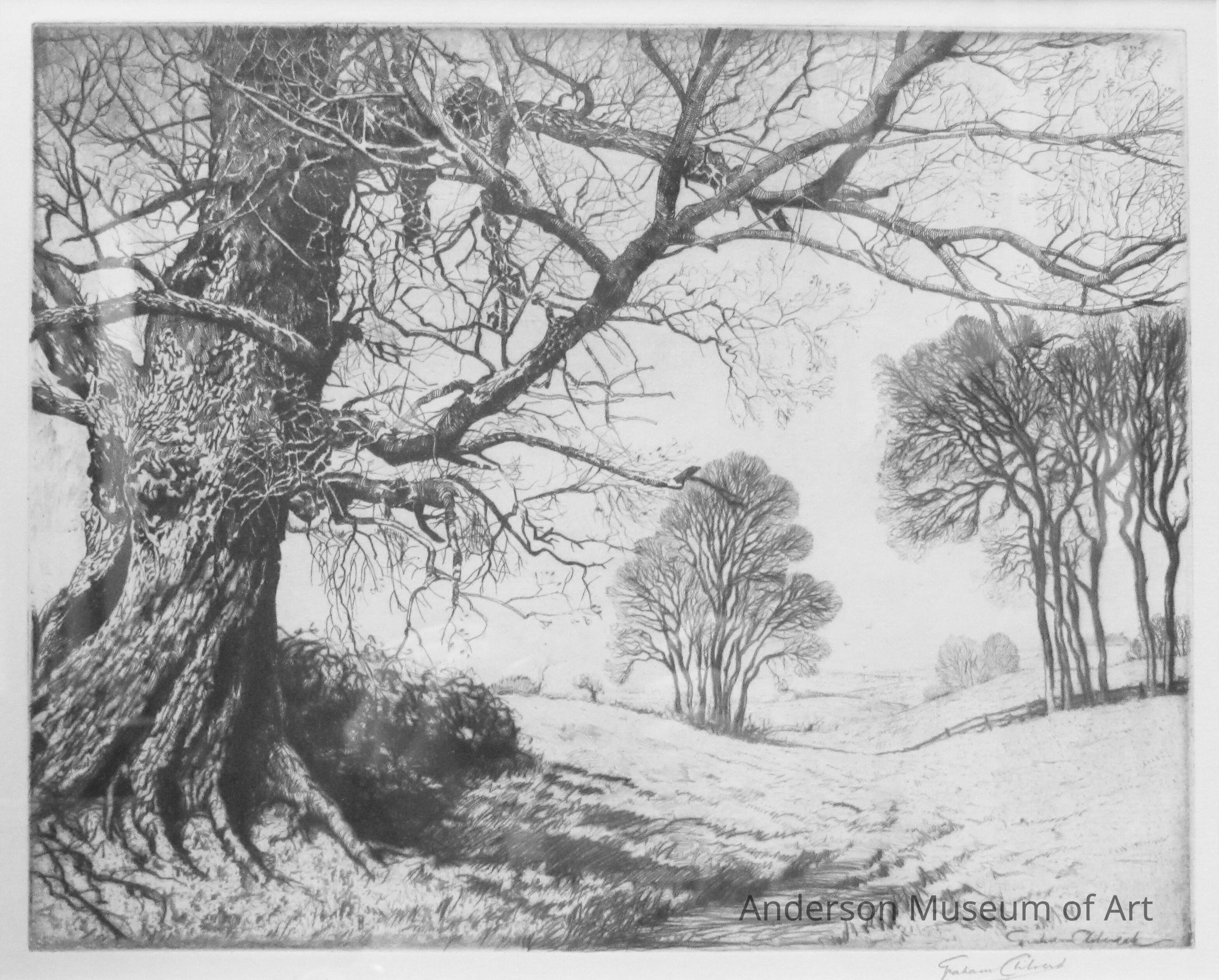 Drypoint etching in warm black ink on white paper depicting a landscape with a large tree in the left foreground which dominates the composition. Directly behind the tree are bushes. Rolling hills extend from the immediate foreground into the background. In the middle ground are two clusters of trees, and a fence which runs from the right side of the composition behind a hill 1/4 of the way into the image. The background is mostly sky and three flying birds are just above the horizon.