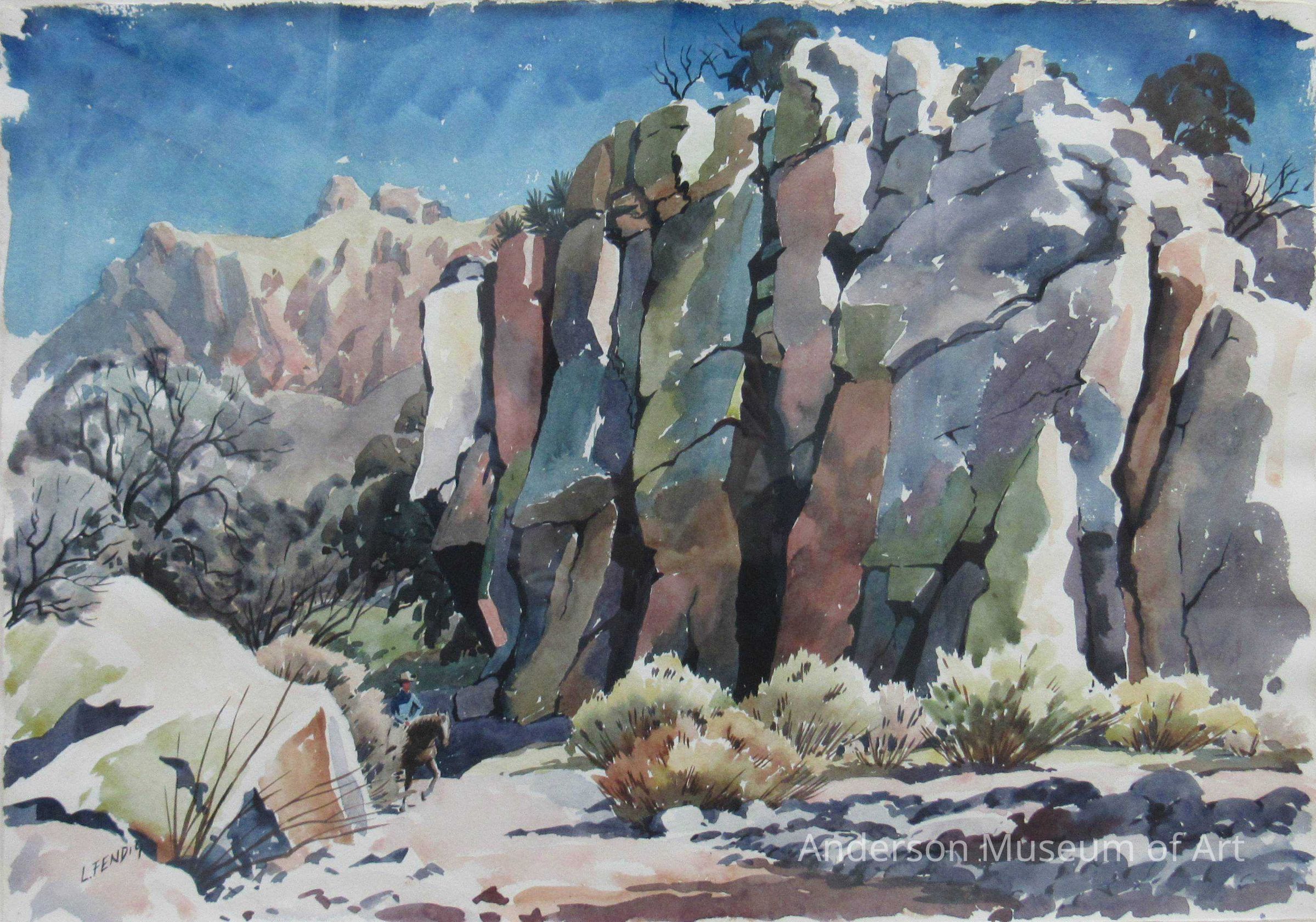 Large, multi-colored rock formations dominate the right portions of the picture plane: blues, purples, browns, and greens appear to be the predominate colors. In the immediate foreground are additional rocks and sagebrush, and the painting depicts either the west or southwest. From behind the rocks, a man riding a horse emerges. He is dressed in a blue shirt and tan hat; the horse is brown with a white face. Signed "L. Fendig" in the lower left corner.Type of Painting