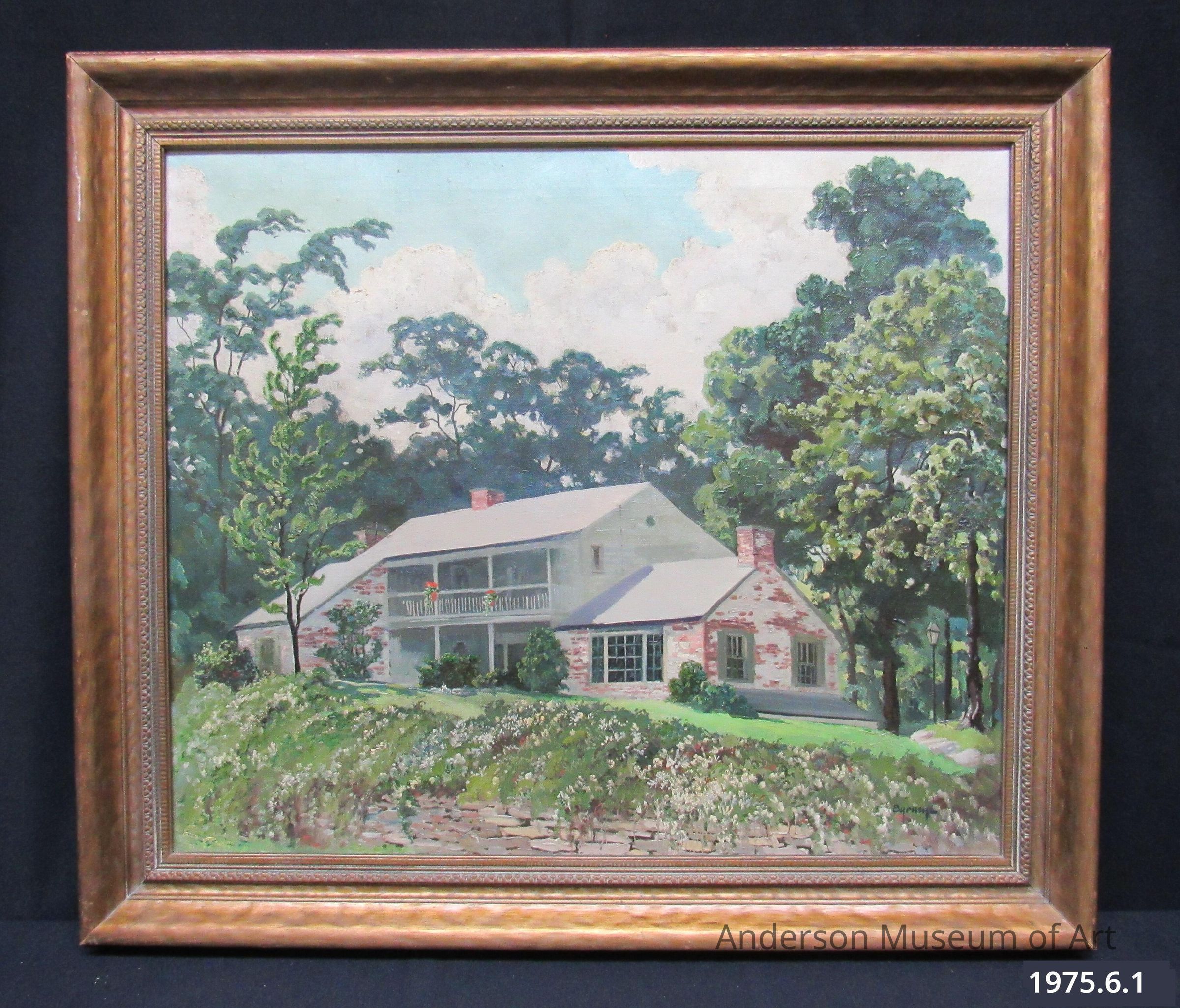 Signed "Byrum" in the lower right corner. A colorful spring scene of a white house surrounded by trees, a wall, overgrown with flowering vines in the foreground. The house is two stories with several attachments. There is a balcony on the second floor. The house has a stone/brick addition on the viewer's right. House is on a slight hill and surrounded by