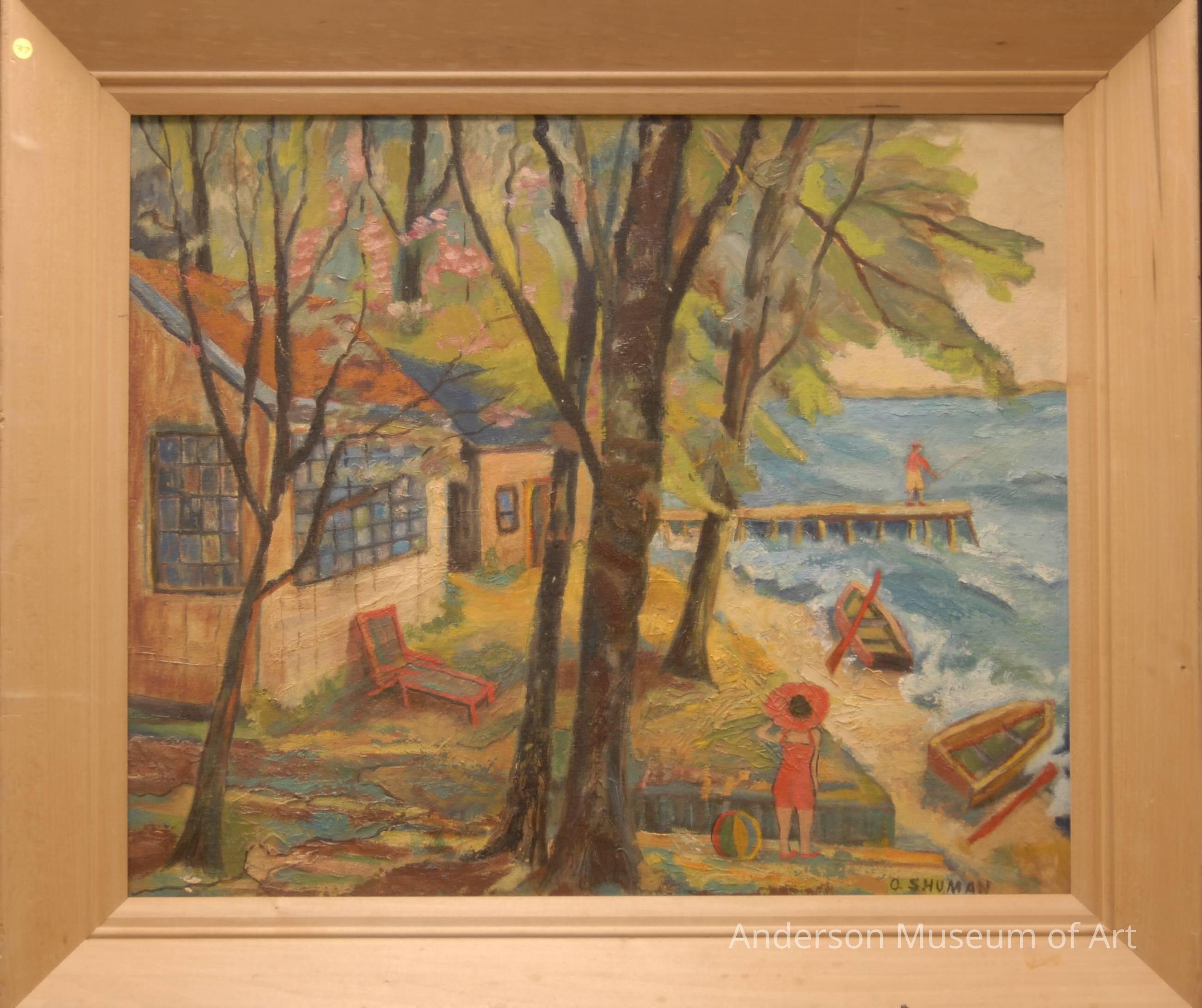 Painting of a beach scene. There are two cottages on the left side, one has an orange roof with a large window made of small panes. The other cottage has a black roof. In front of the cottages and between the beach are several trees. There is a pier near the horizon line with a man at the edge fishing. There is a woman in the foreground with her back to the viewer. She is in a pink bathing suit and matching hat. Next to her is a beach ball. There are two small boats each with an oar pulled ashore. Dated 1954 on verso.