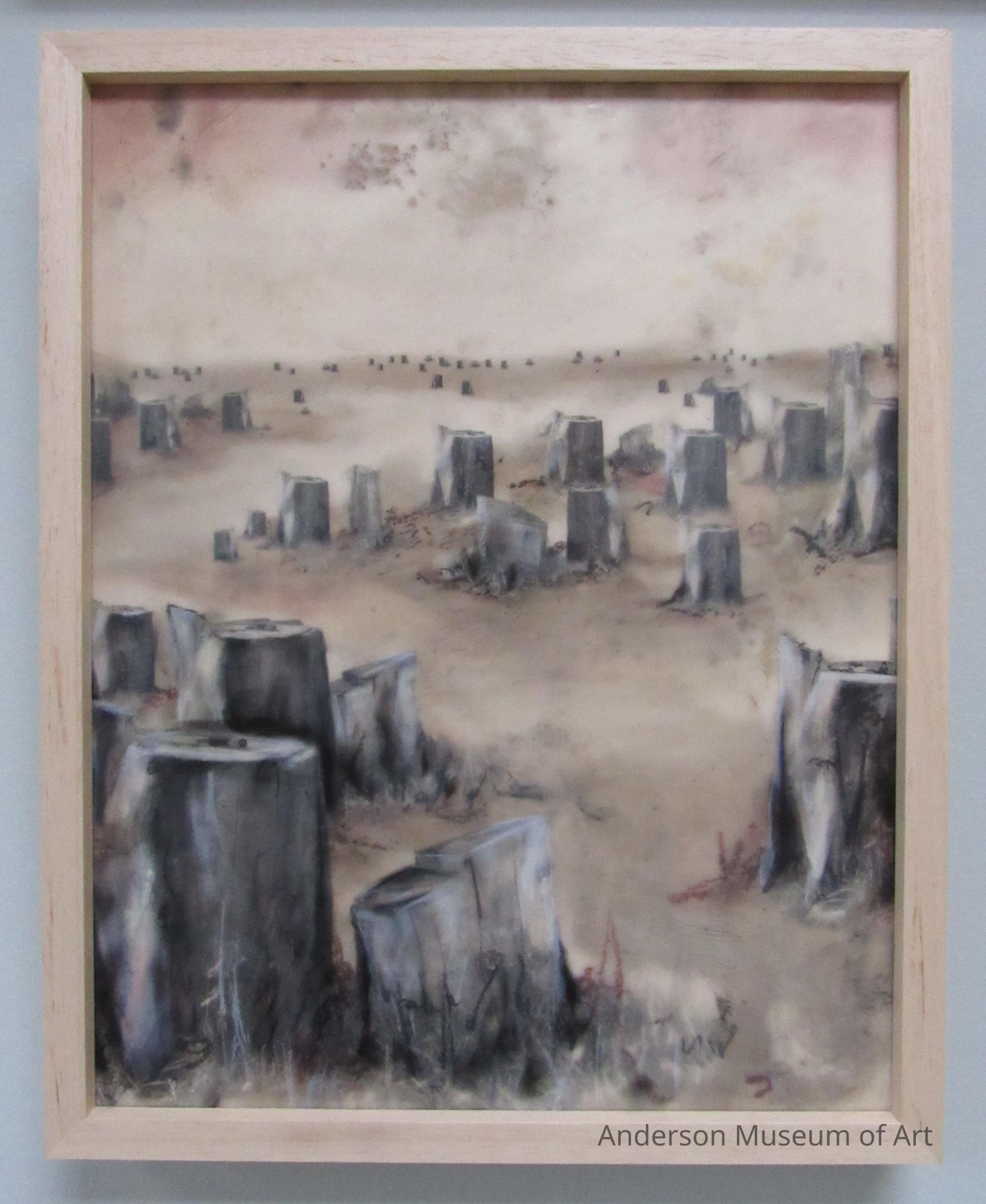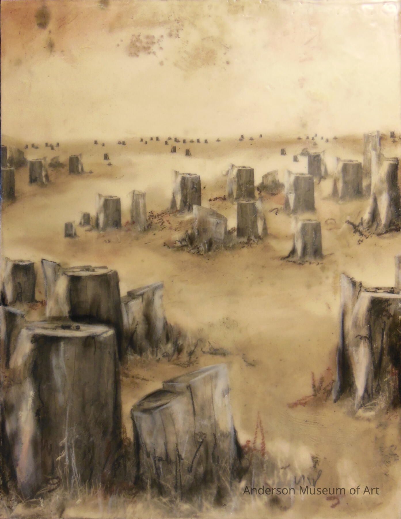Mixed media landscape filled with tree stumps and a winding path. The tree stumps are black and white with a cream and brown background. There are five stumps in the bottom left foreground, one on the right foreground, fourteen along the center right side, five along the center left side, and thirty small ones along the horizon line. The sky is the same cream as the pathway and has some textures and darker colors along the top left. Unsigned on front.Collection