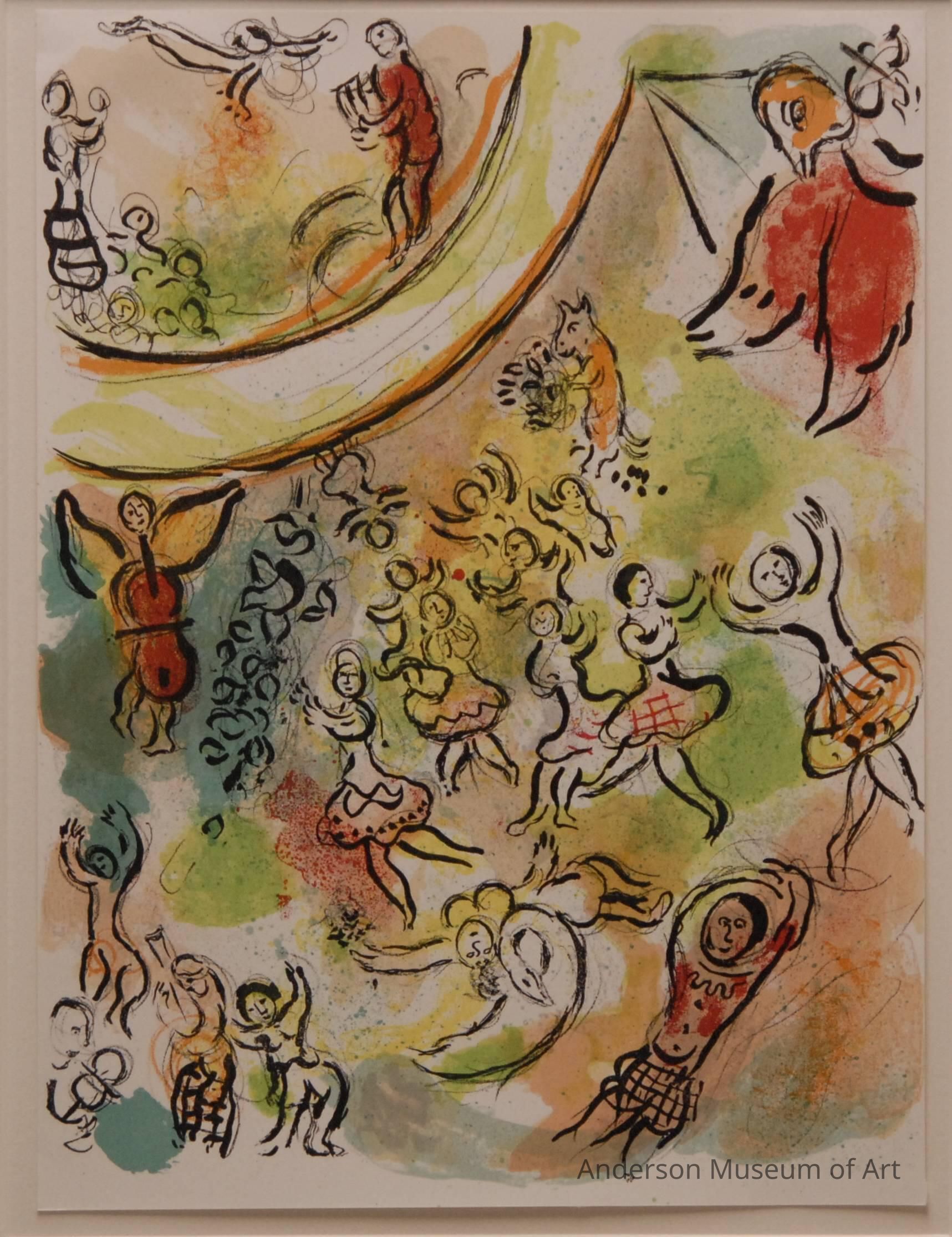 The image is a circus-like illustration, ostensibly of the ceiling of the Paris Opera. The colors are greens, oranges, yellows, and reds. The entire surface of the work is peopled by an assortment of human-esque figures in various performance stances. Some appear to be dancing, especially those in the center. The figures appear to be set in a color field of loosely arranged, thin washes of greens, yellows, reds, and oranges. In the upper left corner is a curvilinear form that begins one-third of the way down the left side of the picture and extends curving up to a point midway across the top of the picture plane. The piece is not numbered and is unsigned. On the verso is printed, "Cet Ouvrage n'aurait pu etre realise sans la precieuse collaboration de Madame Marc Chagall a qui nous adressons nos plus vifs remciements."Acquisition