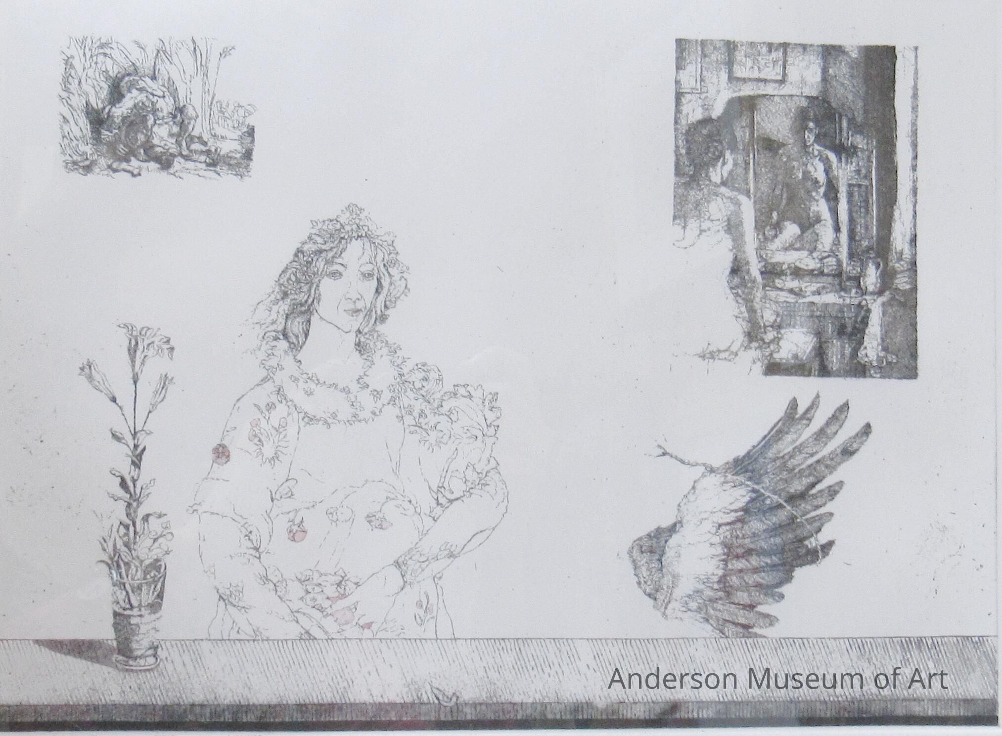There are several images within this print. The focal point is of a lady sitting with a dress on. She resembles a mother earth figure with a flower wreath in her hair, a thicker wreath around her neck, and flowers on her dress. Some of these flowers have been colored shades of pink. To her right is a vase with flowers. To her left is the outstretched wing of a large bird (side view). In the top corner, two people are having sex under a tree. The top right image is of a room with a lady, sitting down at a vanity, looking at her naked reflection.Collection
