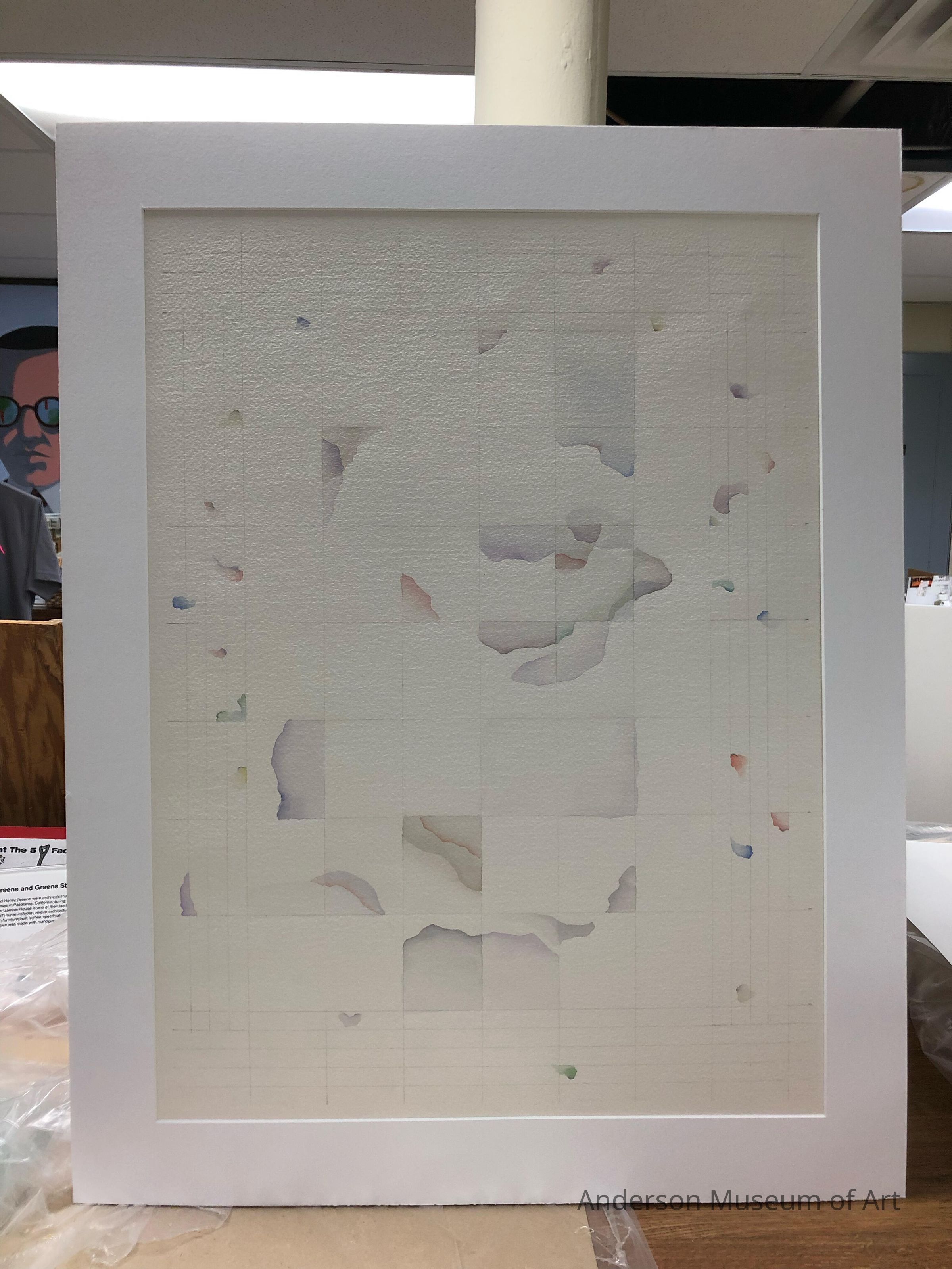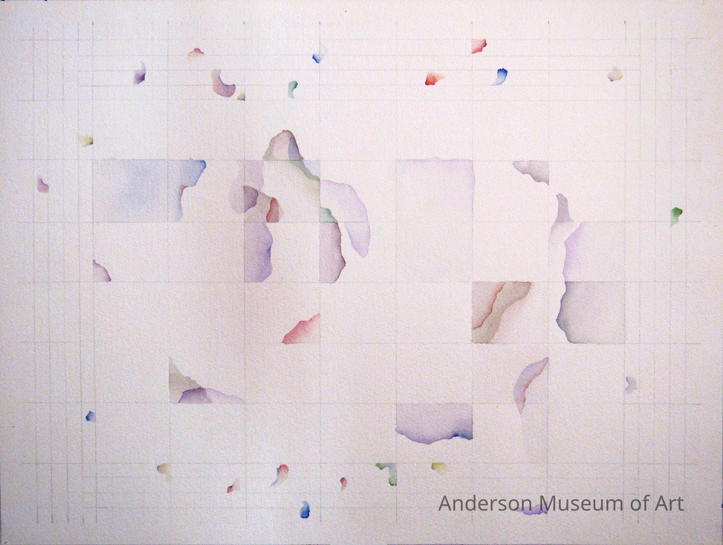 Abstracted watercolor design. Pencil lines section off the entire paper into blocks. Small "washes" interspersed throughout blocks. The 7 x 6 area of blocks in the center are much larger and more square-like than the surrounding grid of rectangles.