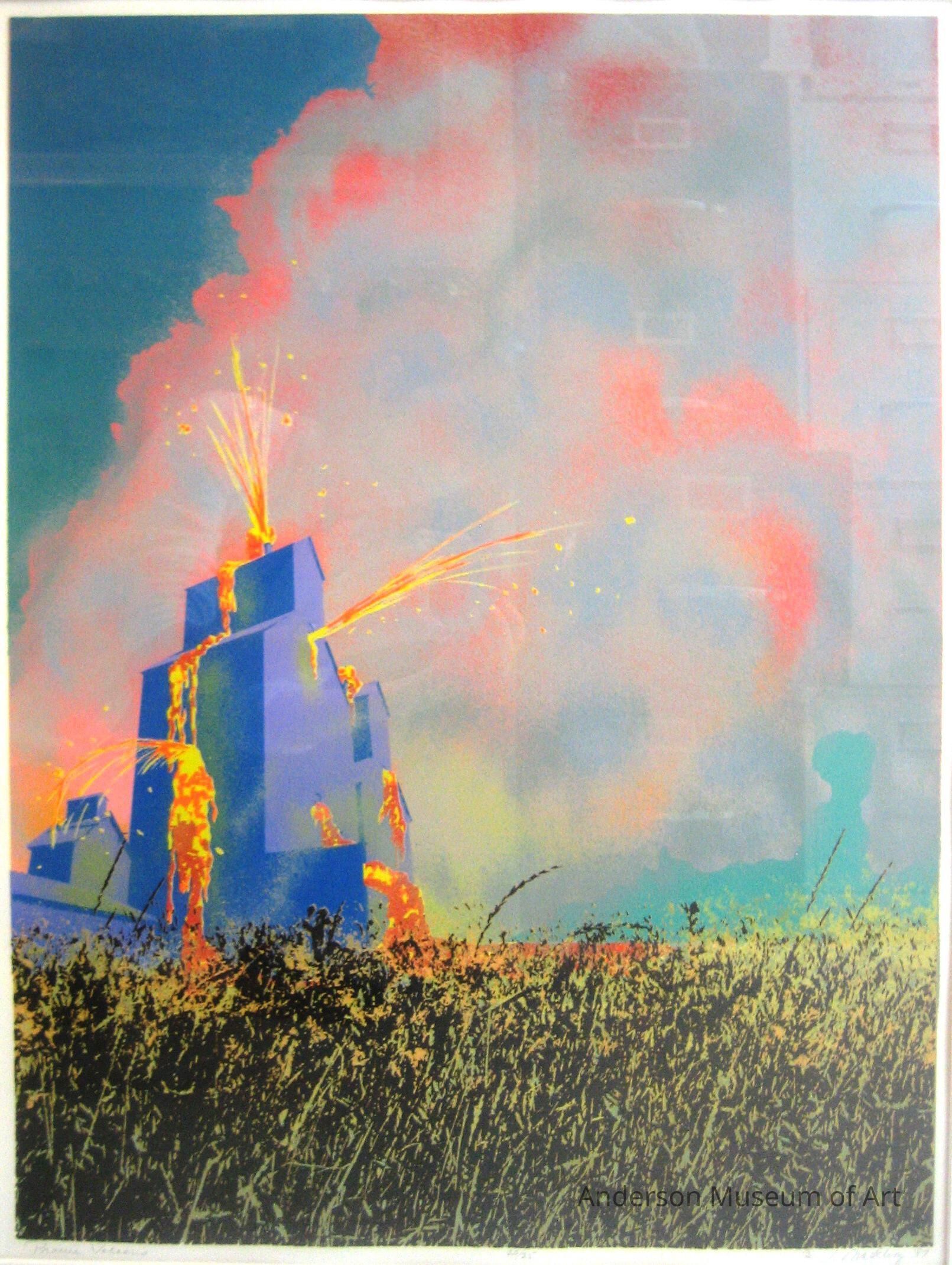 Purple farm building erupting like a volcano with lava spewing out. The building is on the left side of the image. There is black and green grass in the foreground. The sky is blue with a large pink cloud filling up most of the space. Print 20/25.Collection