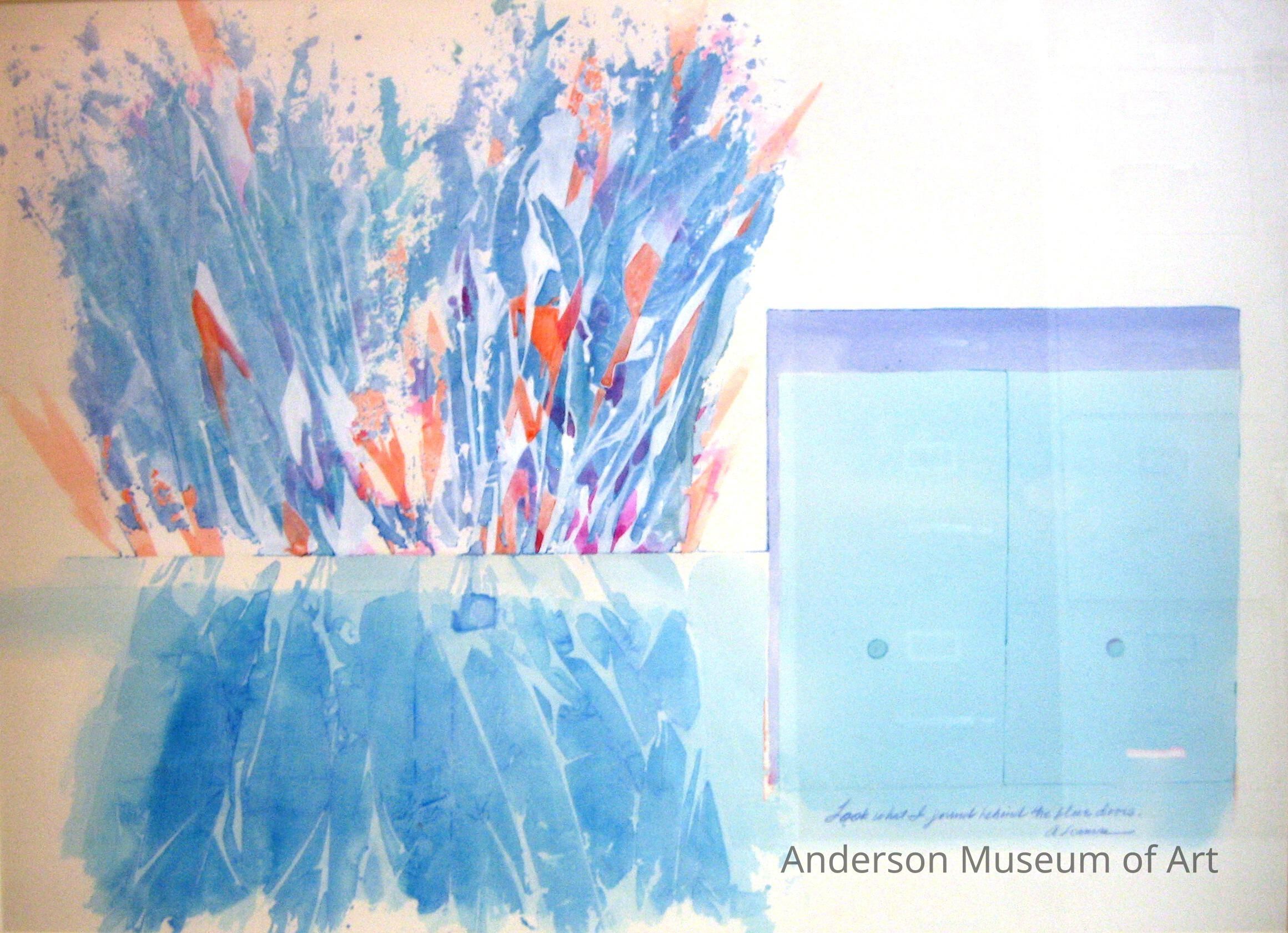 The image consists of two blue side-by-side doors in the lower right picture plane, under which is written "Look what I found behind that blue doors." beneath this statement is the artist's signature "A Leamon." The left half of the picture plane is made up of blue, apricot, and white colors which appear to be oriented vertically from a horizontal line located approx. in the middle of the plane. The upper portion in blue apricot and white, and the lower portion in blue only. The upper portion appears to have been brushed and layed on, and the lower portion appears to have been made by soaking tissue in paint and pressing soaked tissue onto the paper.