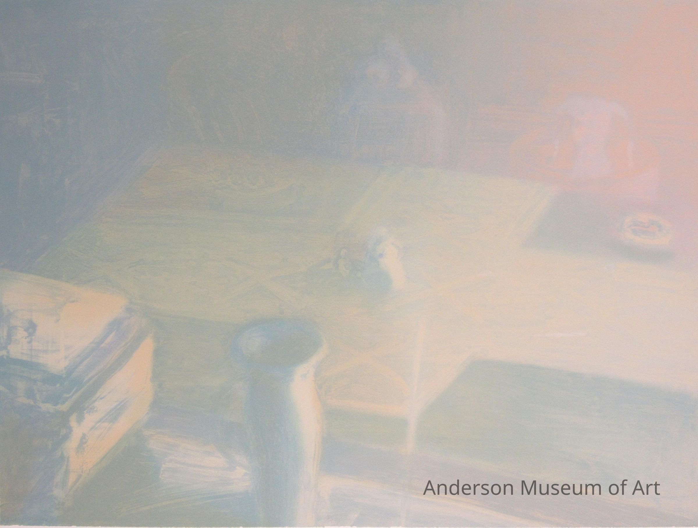 Pastel green/blue image of some sort of still life arrangement. The lower center area is empty with only a white vase. In the lower left corner is a yellow/blue/gray rectangular box-like form. In the background behind the vase is a large rectangular form like a table top. A pattern of X's is fairly faint and fairly evenly distributed over the surface of this rectangle. In the center of the rectangle there appears to be some kind of organic nondescript shape which appears to cast a shadow to the left. In the distant background the colors are darker and more subdued and the forms are indistinguishable. The work is signed, numbered and titled from the lower left to the lower right reading, "Tableware 3/19 James D. Butler 1978." There are watermarks in the lower left and lower right corners.Collection