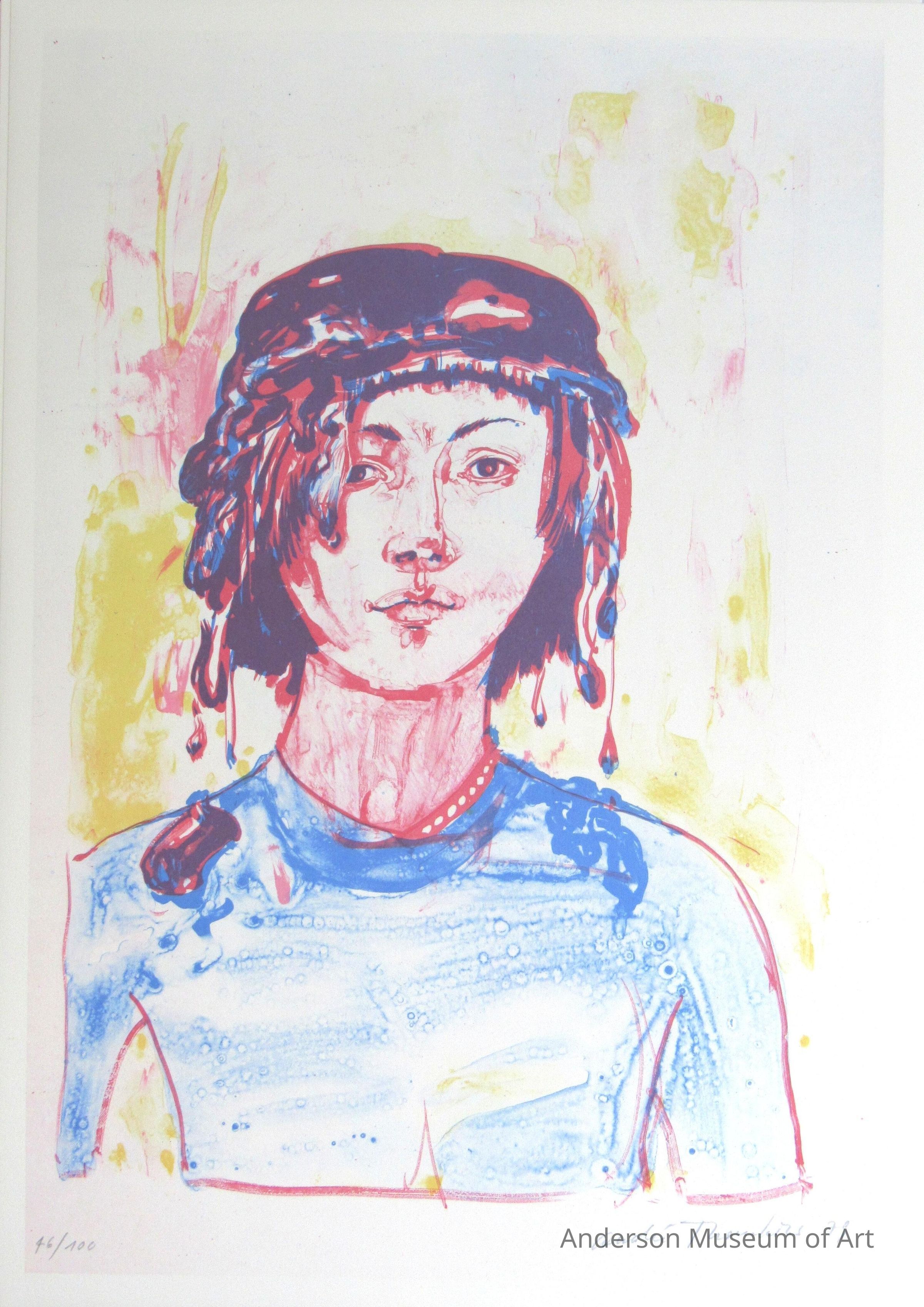 1985.2.2.6 - Abstract color print portrait of a woman with chin-length purple hair. She is wearing a blue shirt and a dangling hair piece/band on her head. The background is partially yellow. Color palette limited to primary colors with purple from overlap. Print 46/100. Signed in pencil, BRC, "Andre Thomkins 79". Size: 19.562 x 13.75