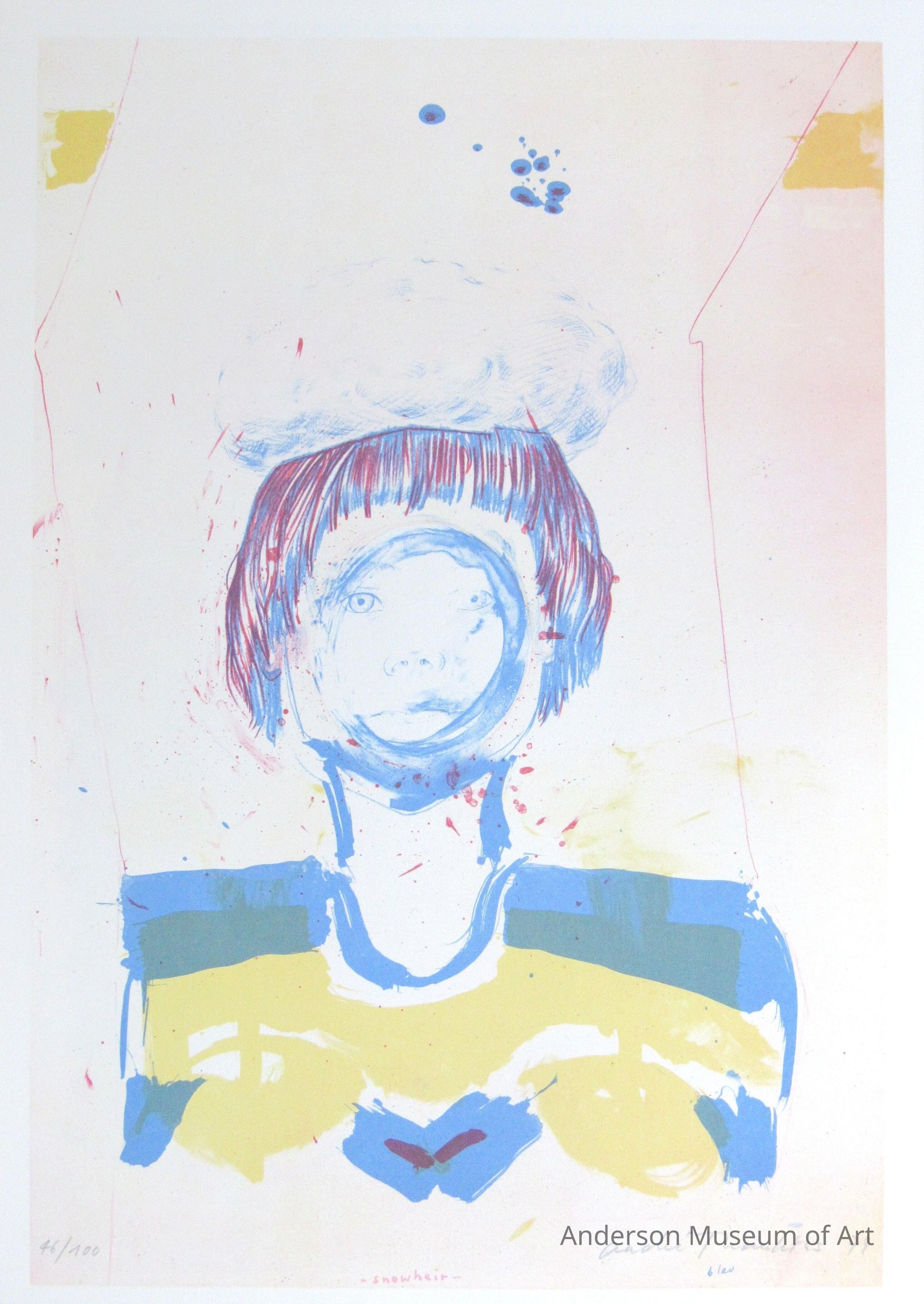 1985.2.2.7 - Abstract color print portrait of a person with short blue and red hair. There is a white cloud like hat on the person's head; a blue circle on the face; and the person is wearing a blue and yellow shirt. Color palette limited to primary colors with some purple and greens from overlapping. "-snowhair-" in pink at the bottom. Print 46/100. Signed in pencil, BRC, "Andre Thomkins 79". Size: 19.562 x 13.75