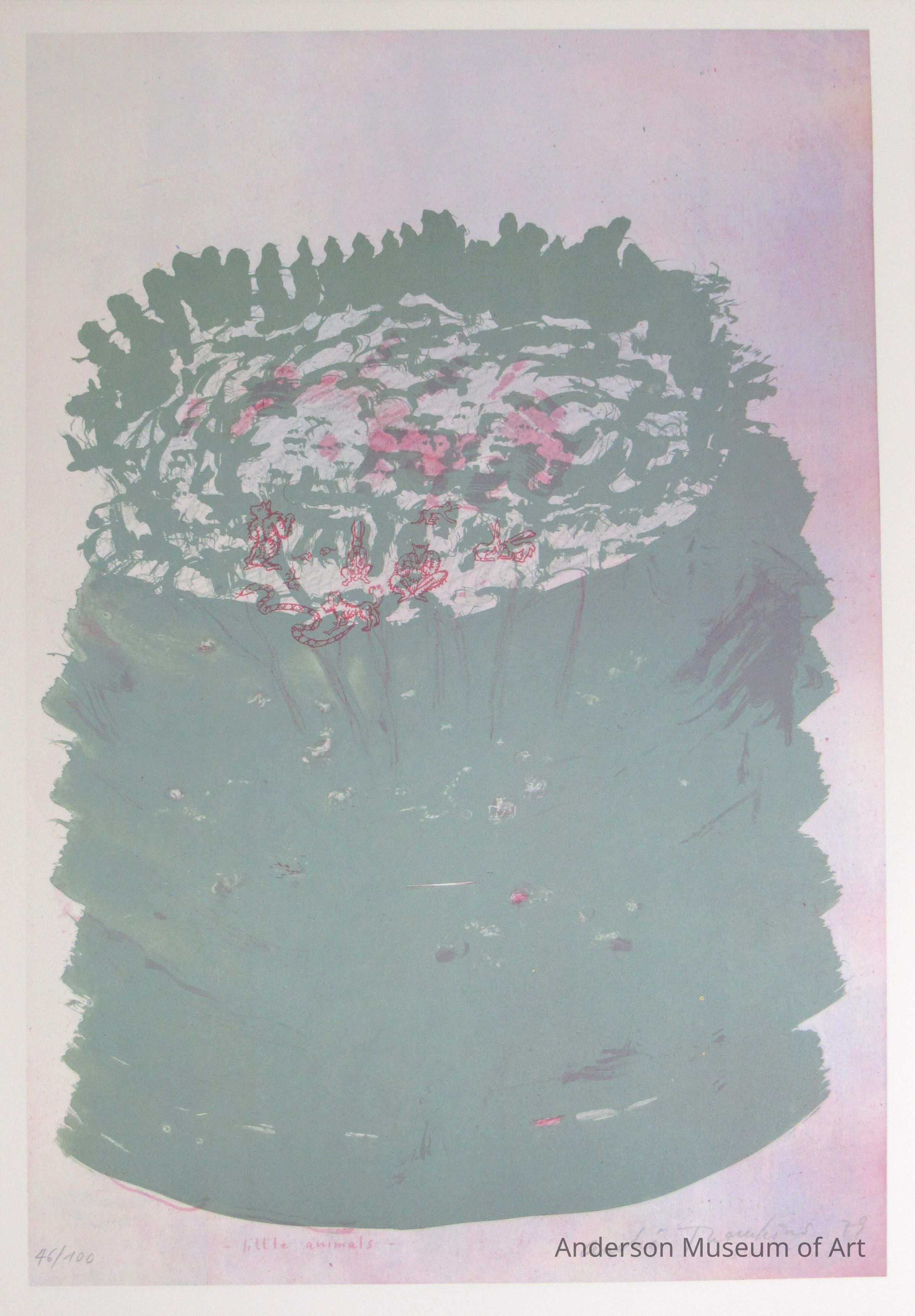 1985.2.2.8 - Abstract color print of a green landscape on a pink/purple background. The green shape looks like a green grassy area with suggestions of a fence at the top. Not fully colored at the top with the background coming through in several areas. There are eight, small, red line drawings in the center of various animals including a snake, cat, bunnies, mice, etc. "-little animals-" in red at the bottom. Print 46/100. Signed in pencil, BRC, "Andre Thomkins 79". Size: 19.562 x 13.75