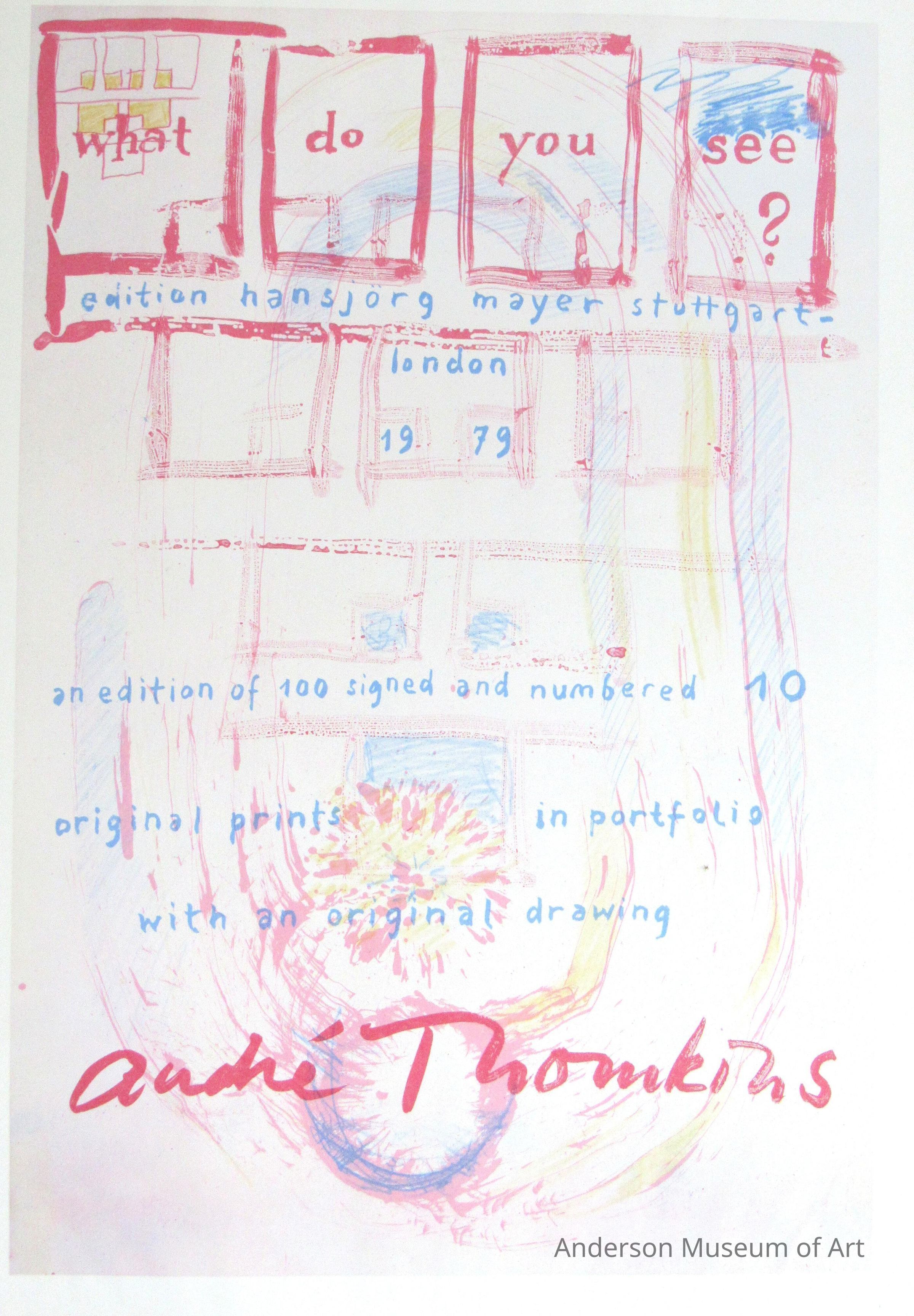 1985.2.2.1 - Cardboard cover for 10 prints and an original drawing. Print attached to cover. "what do you see?" printed in red in four red boxes. "edition hansjorg mayer stuttgart - / london / 1979" in blue below. Written in blue in the center "an edition of 100 signed and numbered 10 / original prints in portfolio / with an original drawing". Signed in red "Andre Thomkins" at the bottom. There is a light drawing underneath the text. Size: 20.25 x 14.25