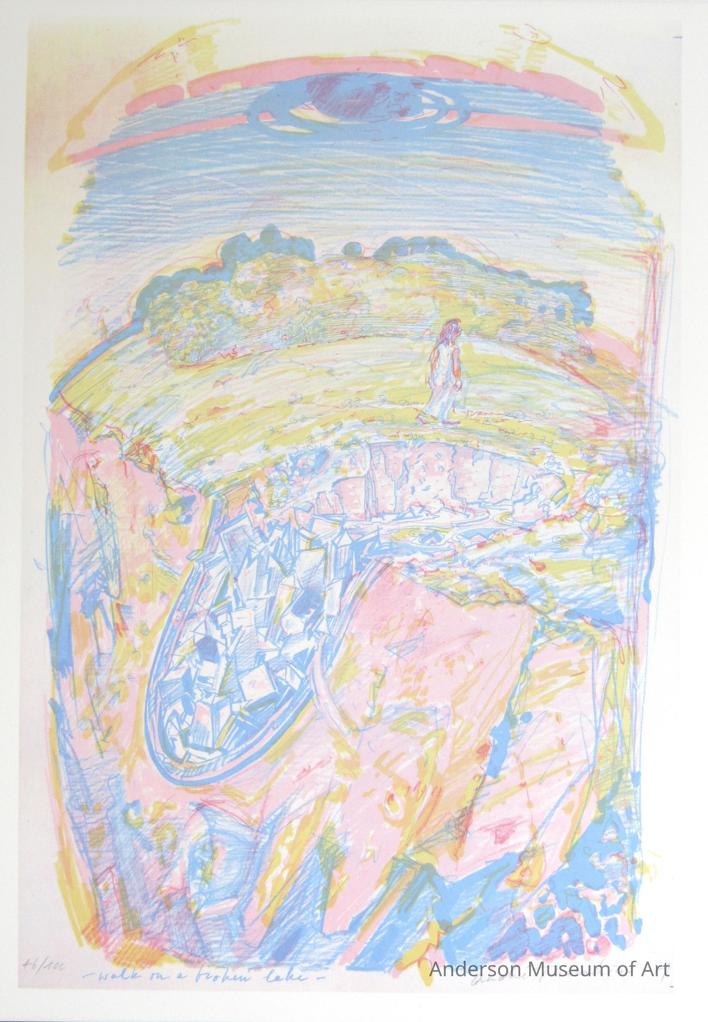 1985.2.2.9 - Abstract color print of a colorful landscape. On the top is a lady in a white dress walking away from a small pond. There are some green and yellow shrubbery to her left. The rest of the image is made up of a cross section of the land. The viewer can see that the small pond is filled with blue rocks and the ground is light pink. "-walk on a broken lake-" in blue at the bottom. Print 46/100. Signed in pencil, BRC, "Andre Thomkins 79". Size: 19.562 x 13.75